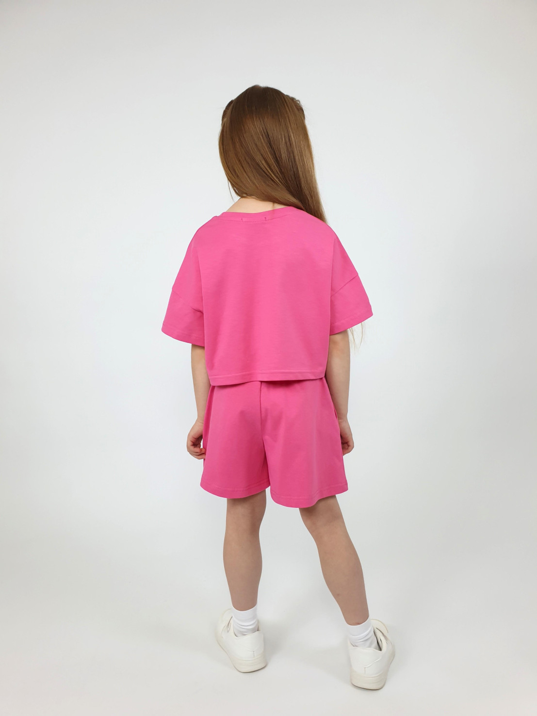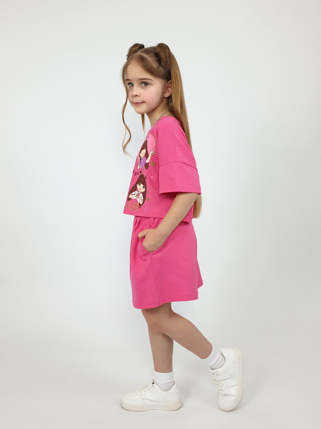Кулирное полотно:100% х/б. Джемпер(оверсайз)-укороченная,спущенное плечо,короткий рукав.Печать на переде,горловина обработана планкой. Шорты-короткие,складки спереди,два боковых кармана,пояс на резинке.