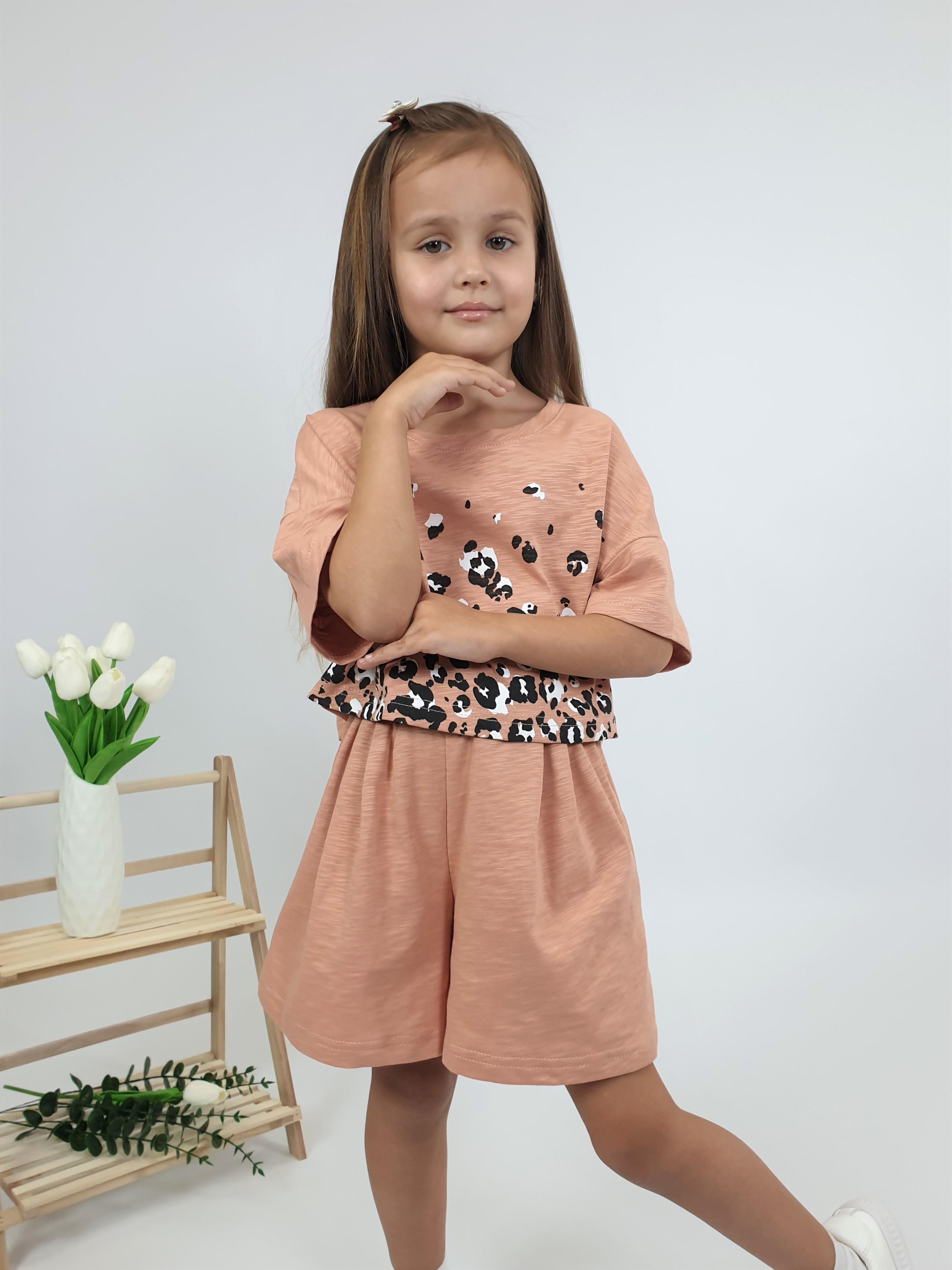 Кулирное полотно:100% х/б. Джемпер-укороченный,спущенное плечо,короткий рукав.Печать на переде,горловина окантована планкой. Шорты-короткие,складки спереди,два боковых кармана,пояс на резинке.
