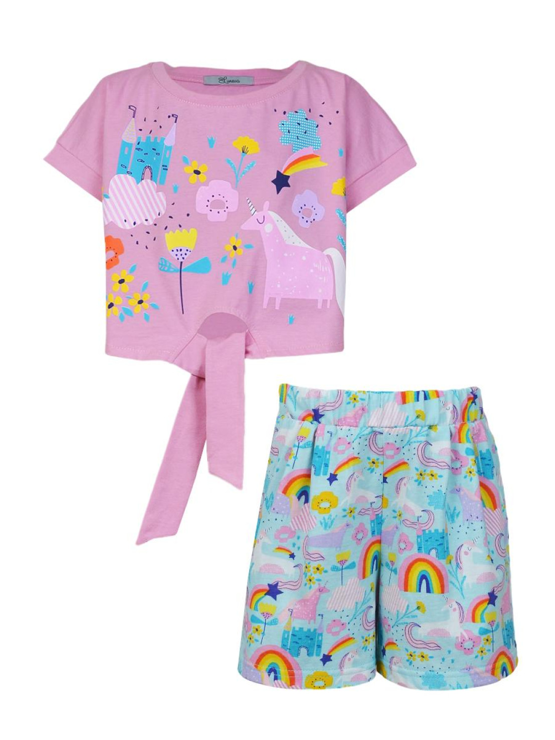 Кулирное полотно:100% х/б. Джемпер-прямого силуэта,спущенное плечо с притачной манжетой.Внизу,спереди завязана на узел.Горловина обработана планкой.Перед с печатью. Шорты-короткие,складки спереди,два боковых кармана,пояс на резинке.