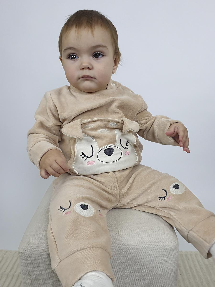 Костюм детский теплый из велюра ( 80% хлопок, 20% полиэстер) состоит из лонгслива и брюк на резинке. Модель с длинным рукавом на манжете и воротником-стойкой. На лонгсливе накладной карман с вышивкой-аппликацией. Застежка на кнопках существенно облегчает переодевание ребенка. В таком костюме малыш будет чувствовать себя свободно и комфортно.