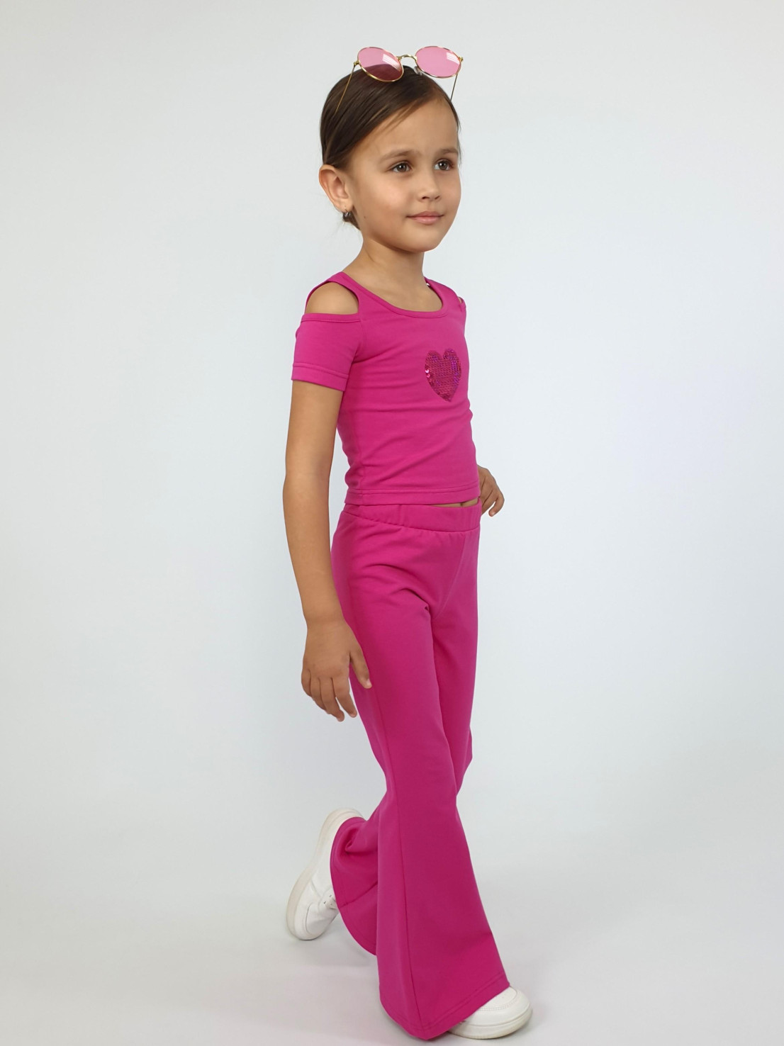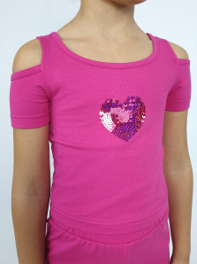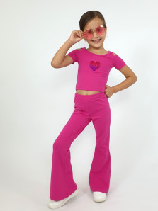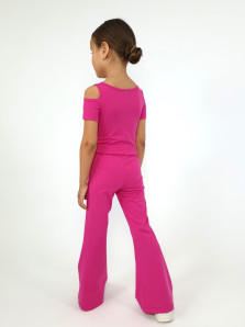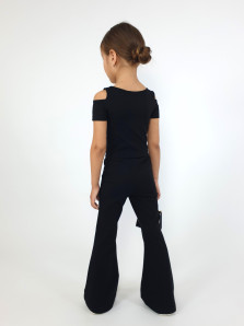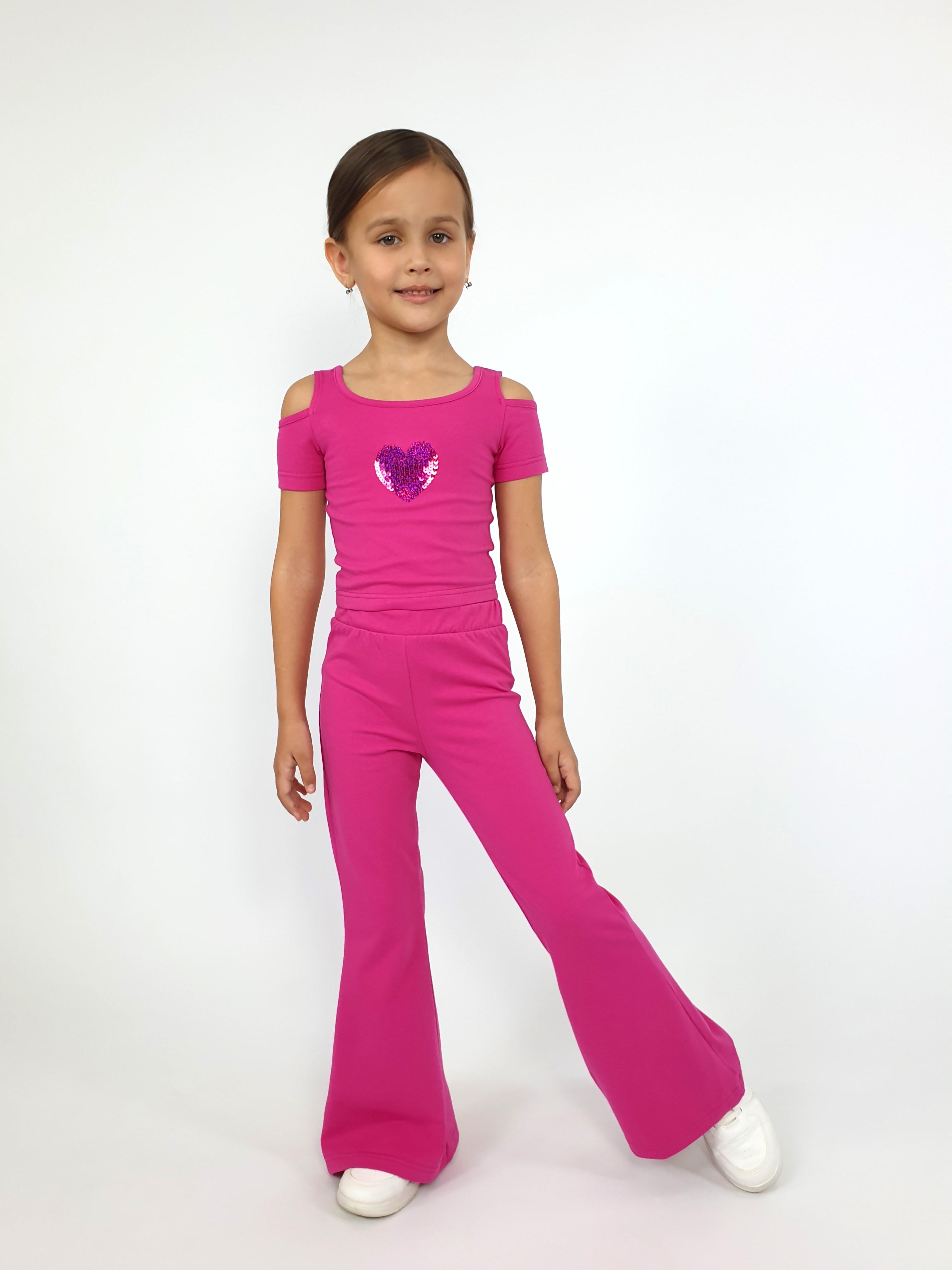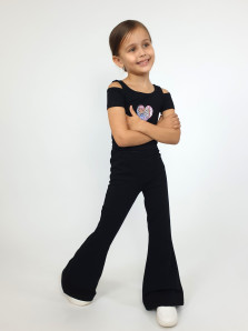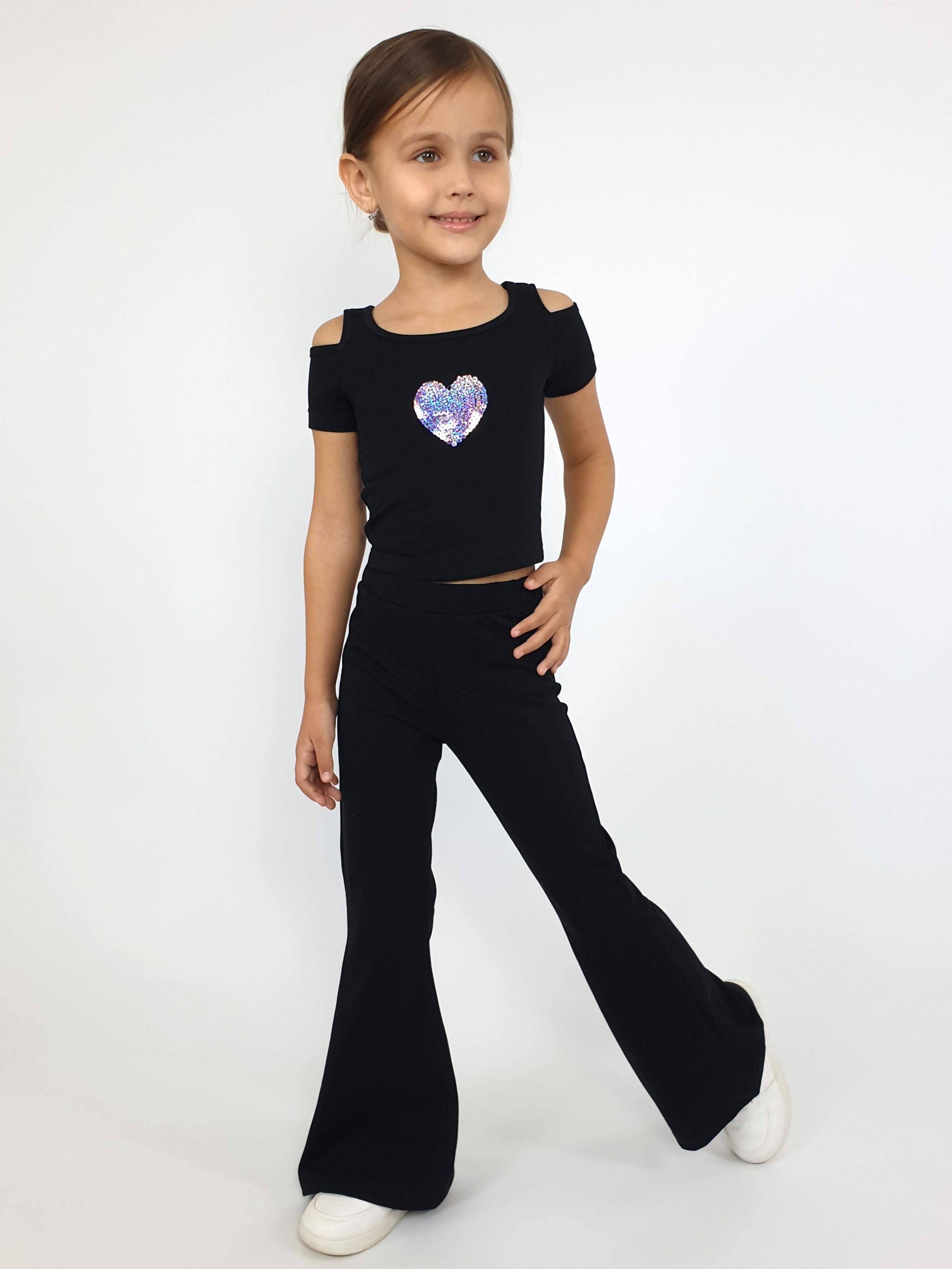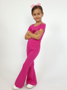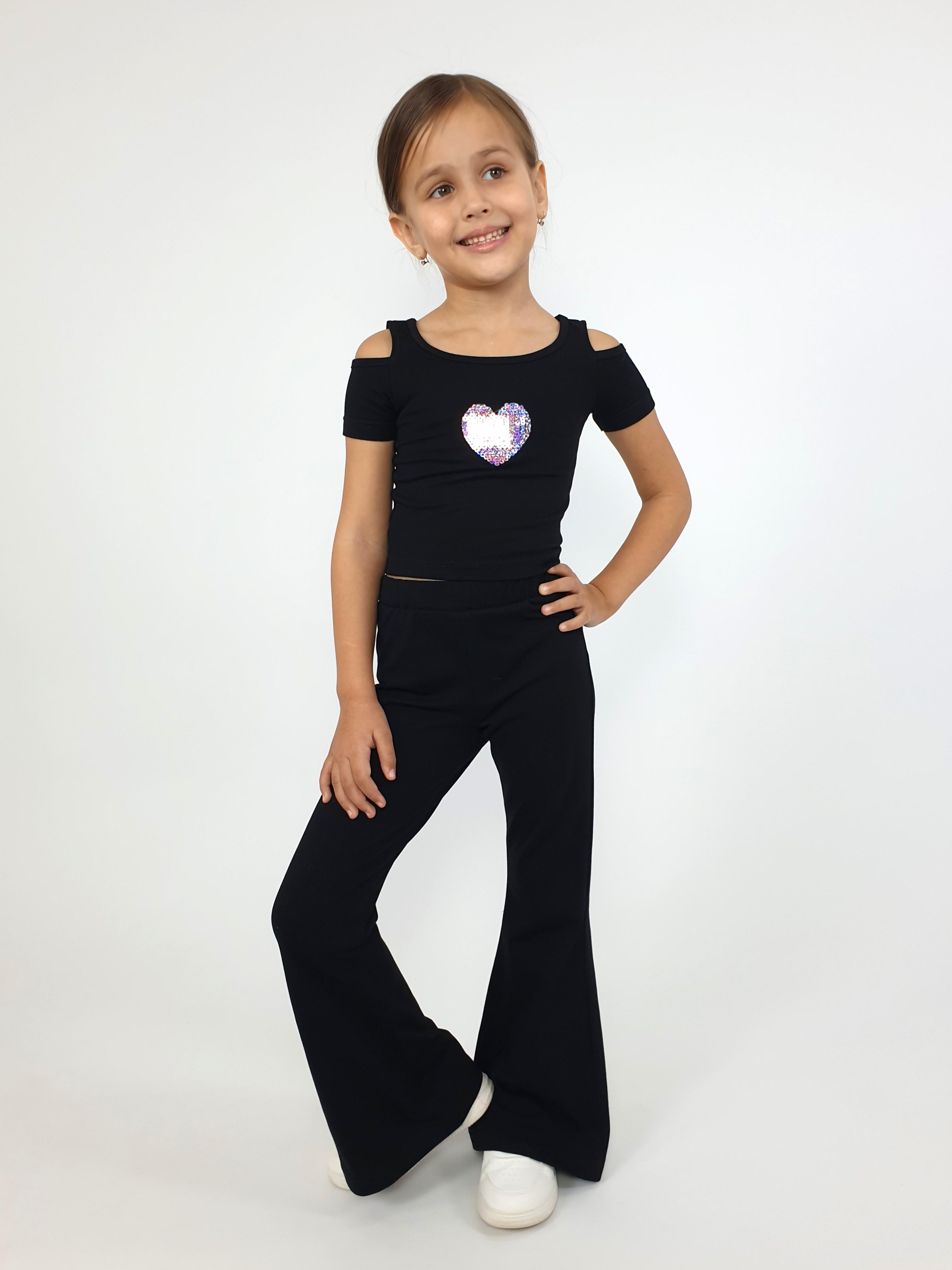 Кулирное полотно: 95% х/б,5% лайкра. Джемпер(фуфайка)-укороченный с коротким рукавом,с вырезом на плече.Горловина окантована.Вышивка(пайетки) на переде. Брюки-длинные,клеш.Пояс притачной с резинкой,низ подшит.