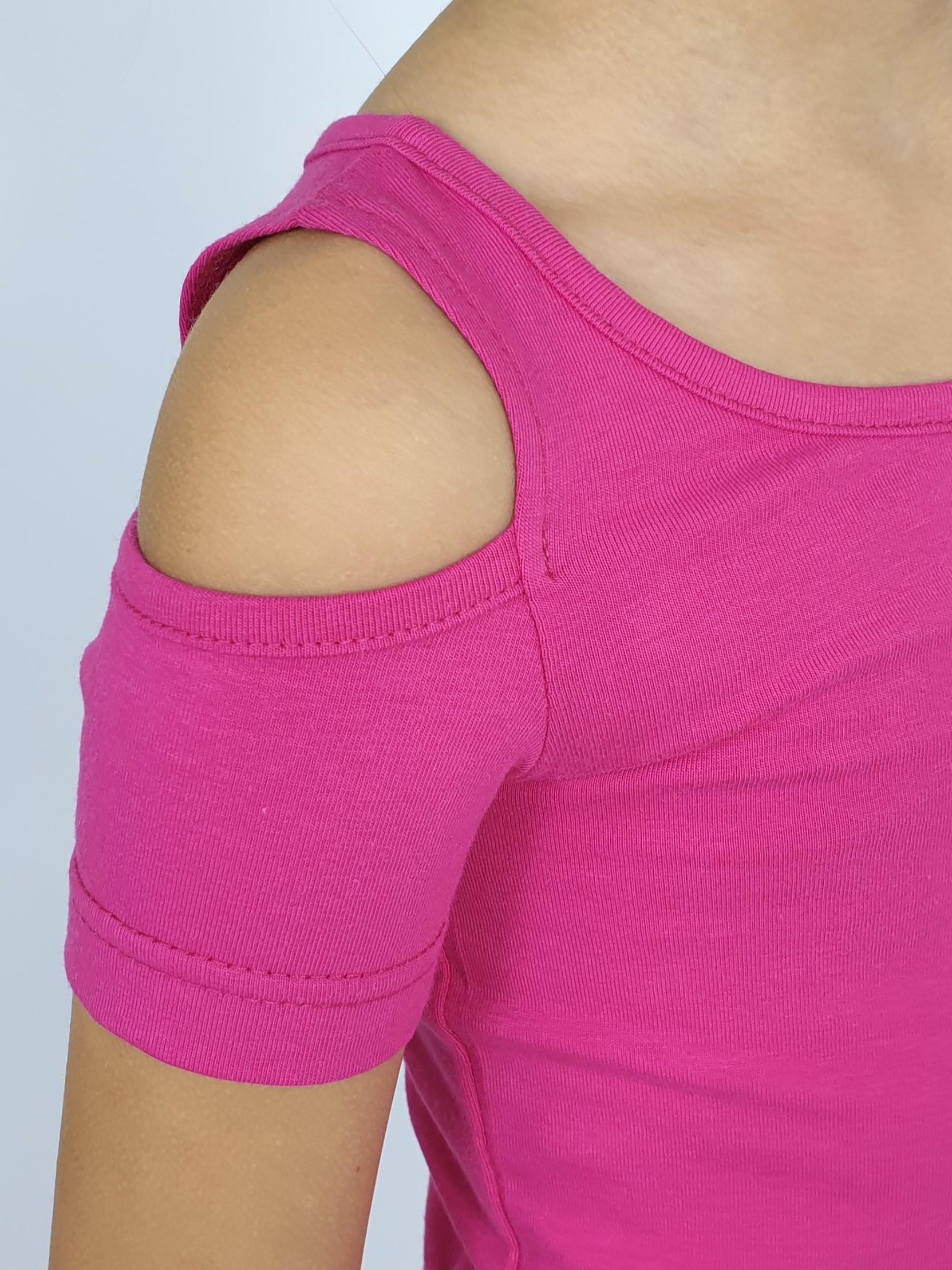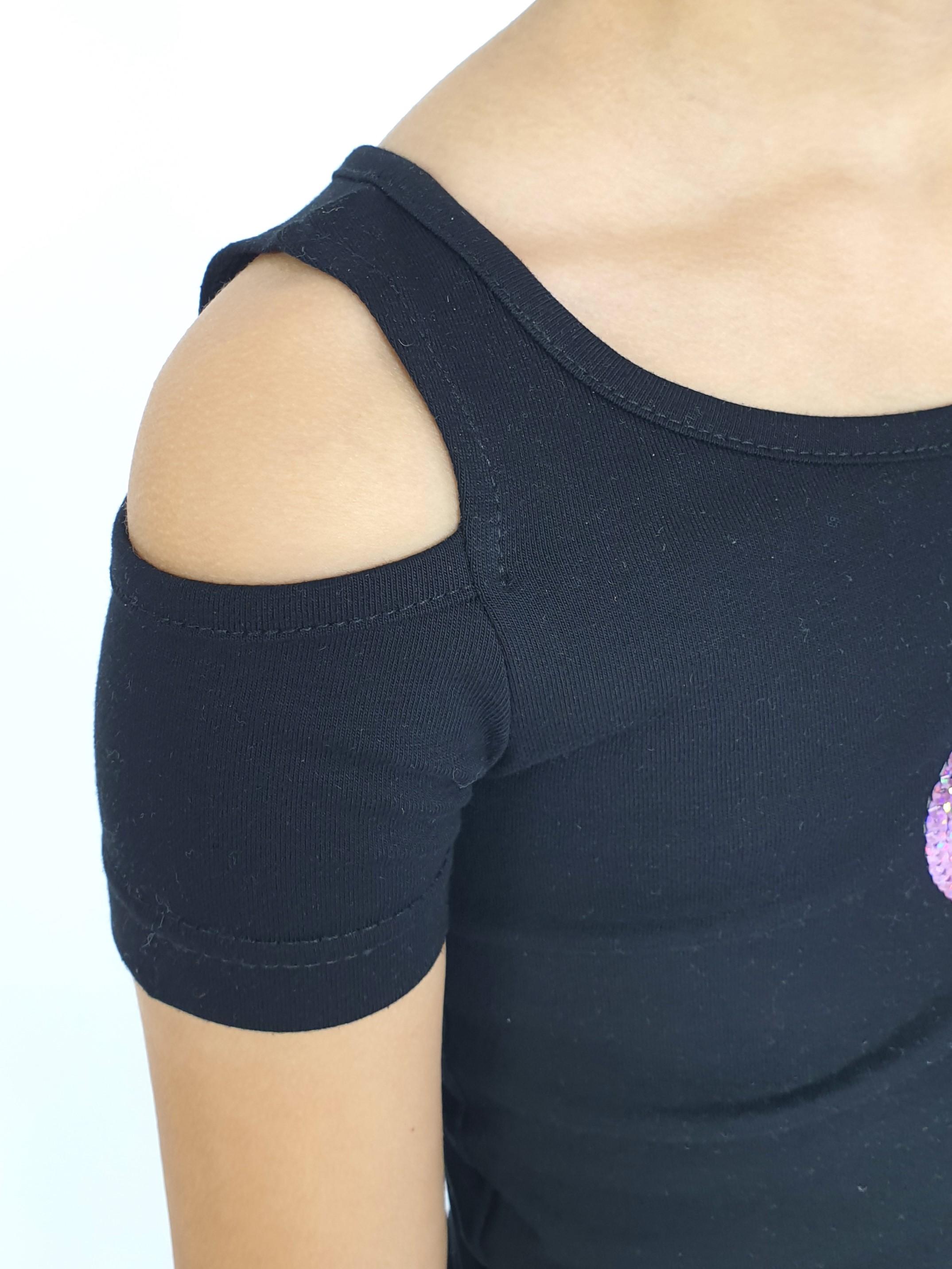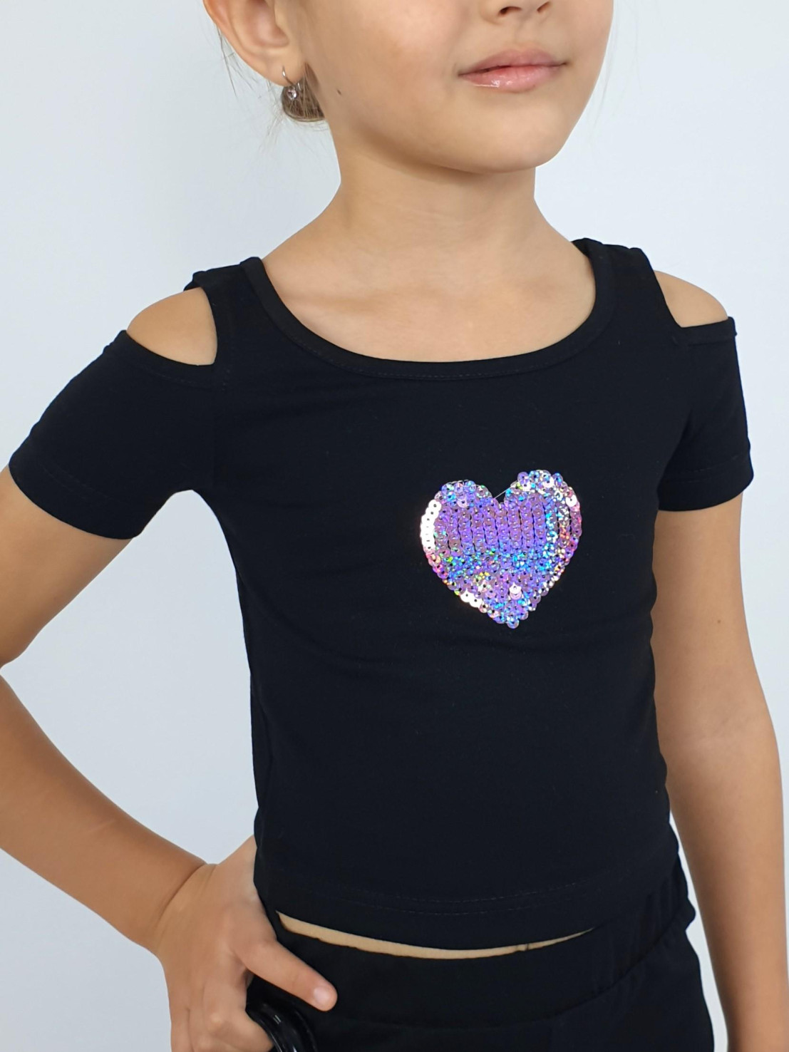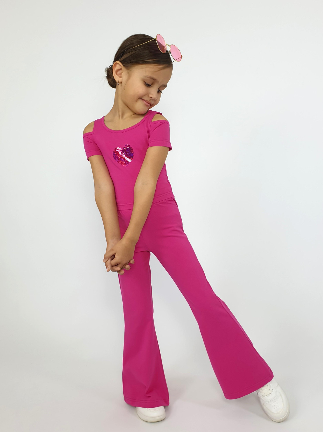 Кулирное полотно: 95% х/б,5% лайкра. Джемпер(фуфайка)-укороченный с коротким рукавом,с вырезом на плече.Горловина окантована.Вышивка(пайетки) на переде. Брюки-длинные,клеш.Пояс притачной с резинкой,низ подшит.