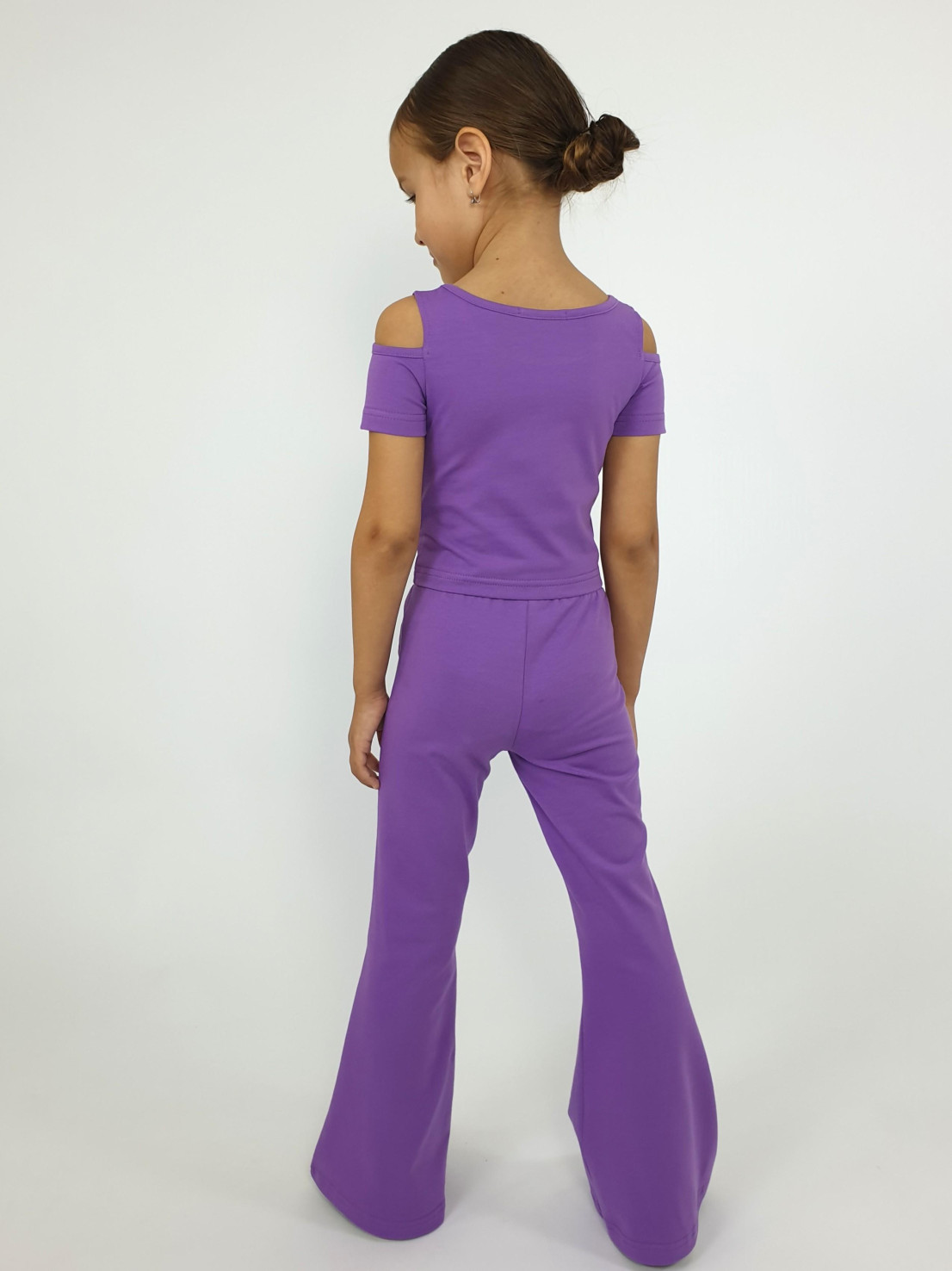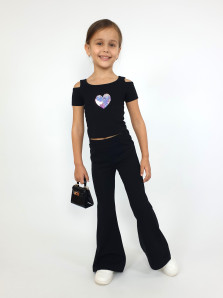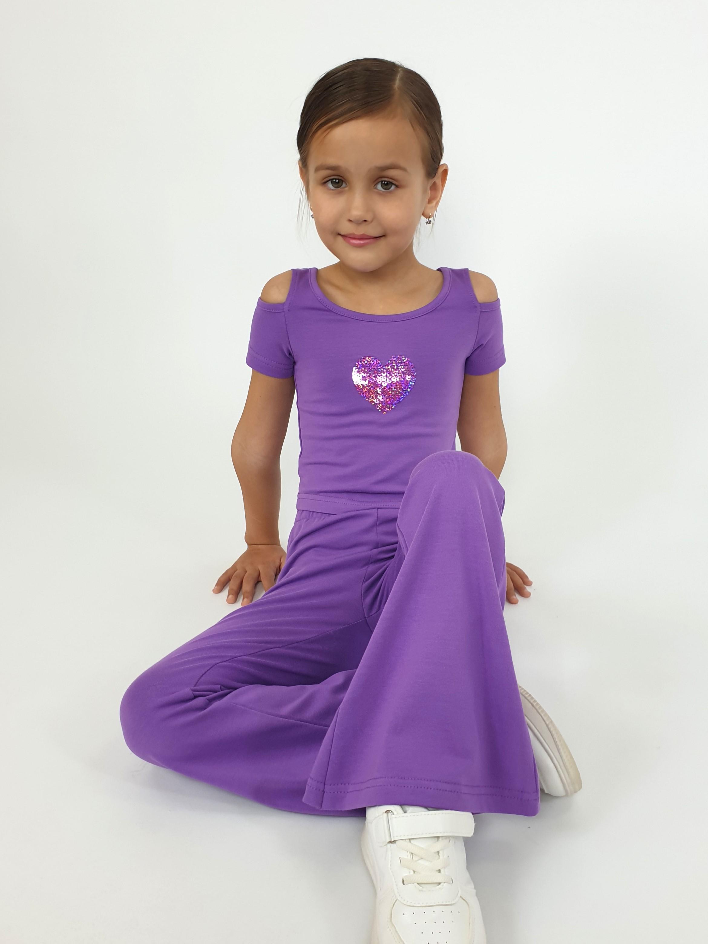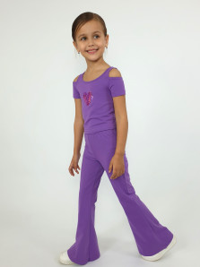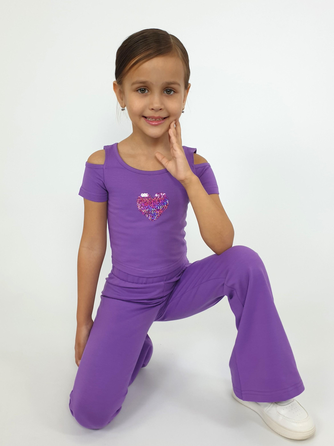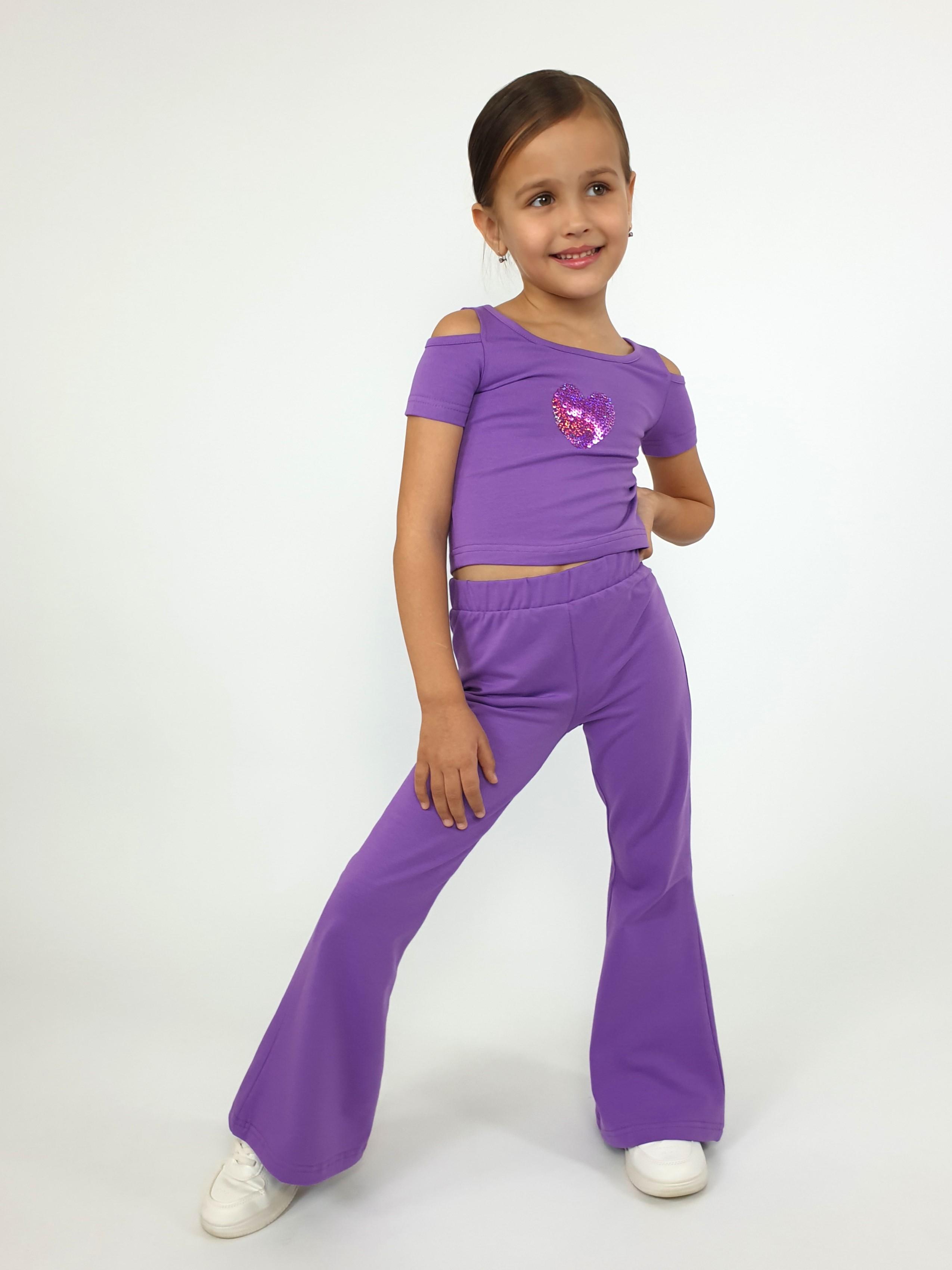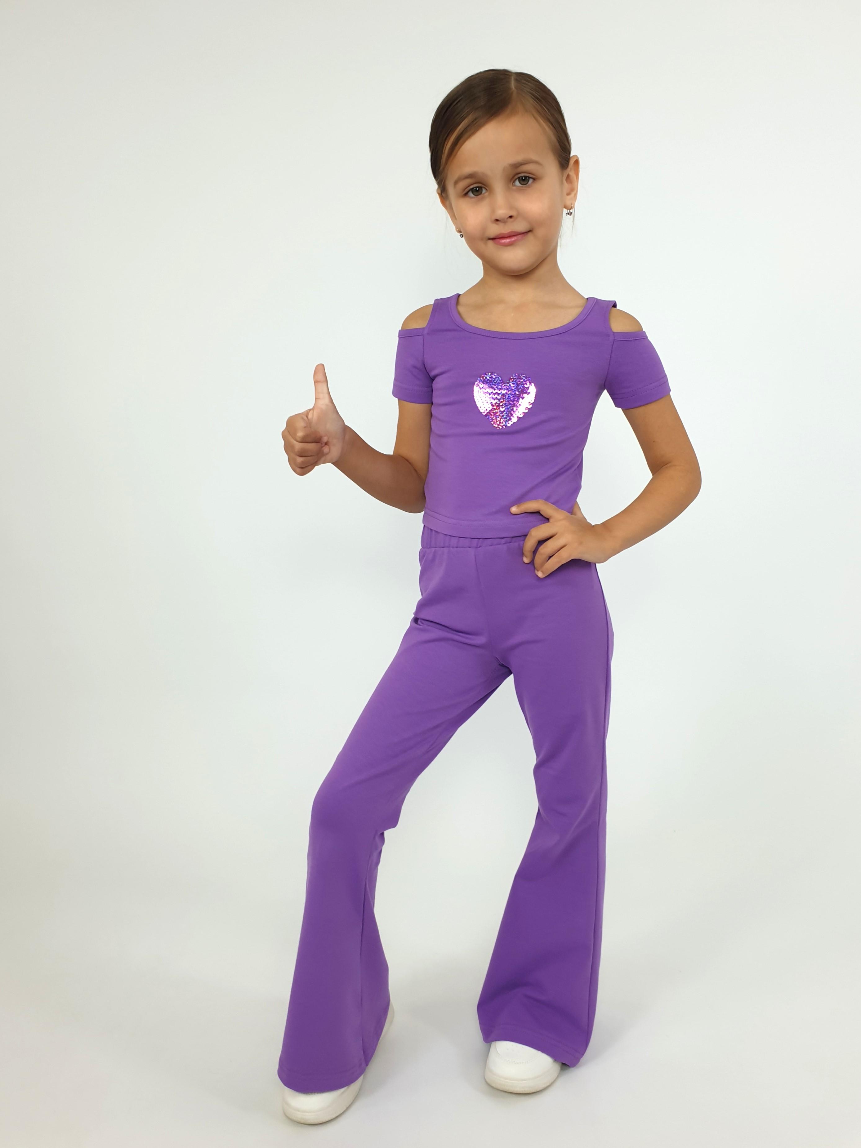 Кулирное полотно: 95% х/б,5% лайкра. Джемпер(фуфайка)-укороченный с коротким рукавом,с вырезом на плече.Горловина окантована.Вышивка(пайетки) на переде. Брюки-длинные,клеш.Пояс притачной с резинкой,низ подшит.