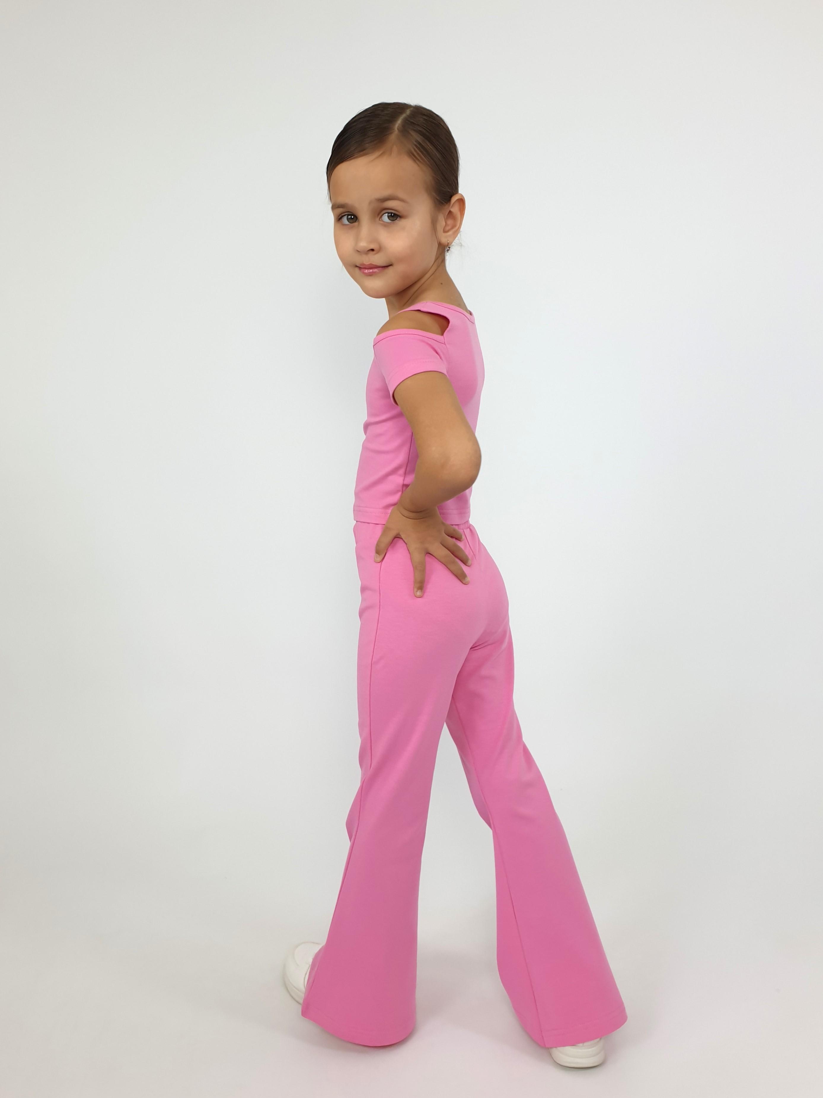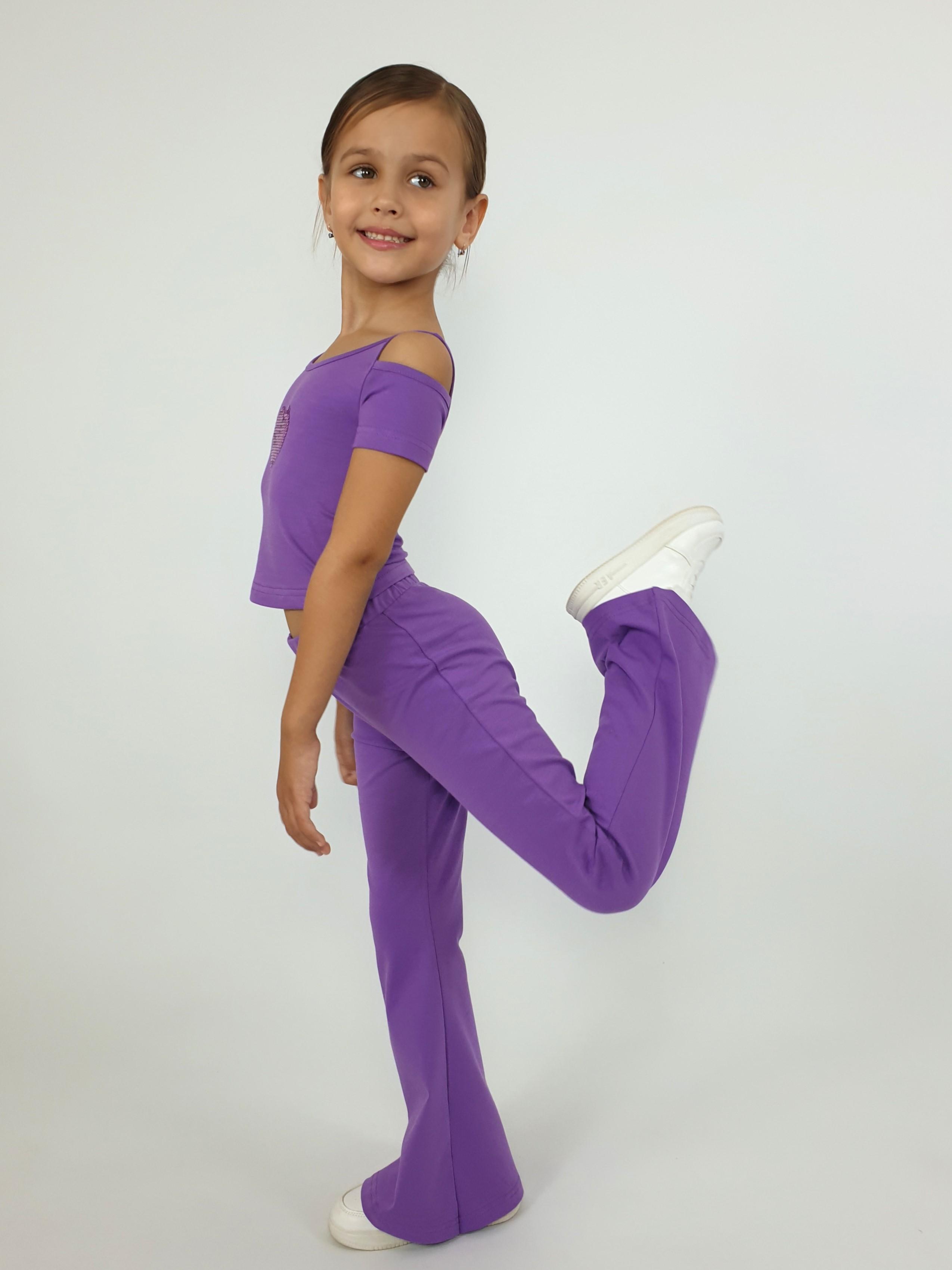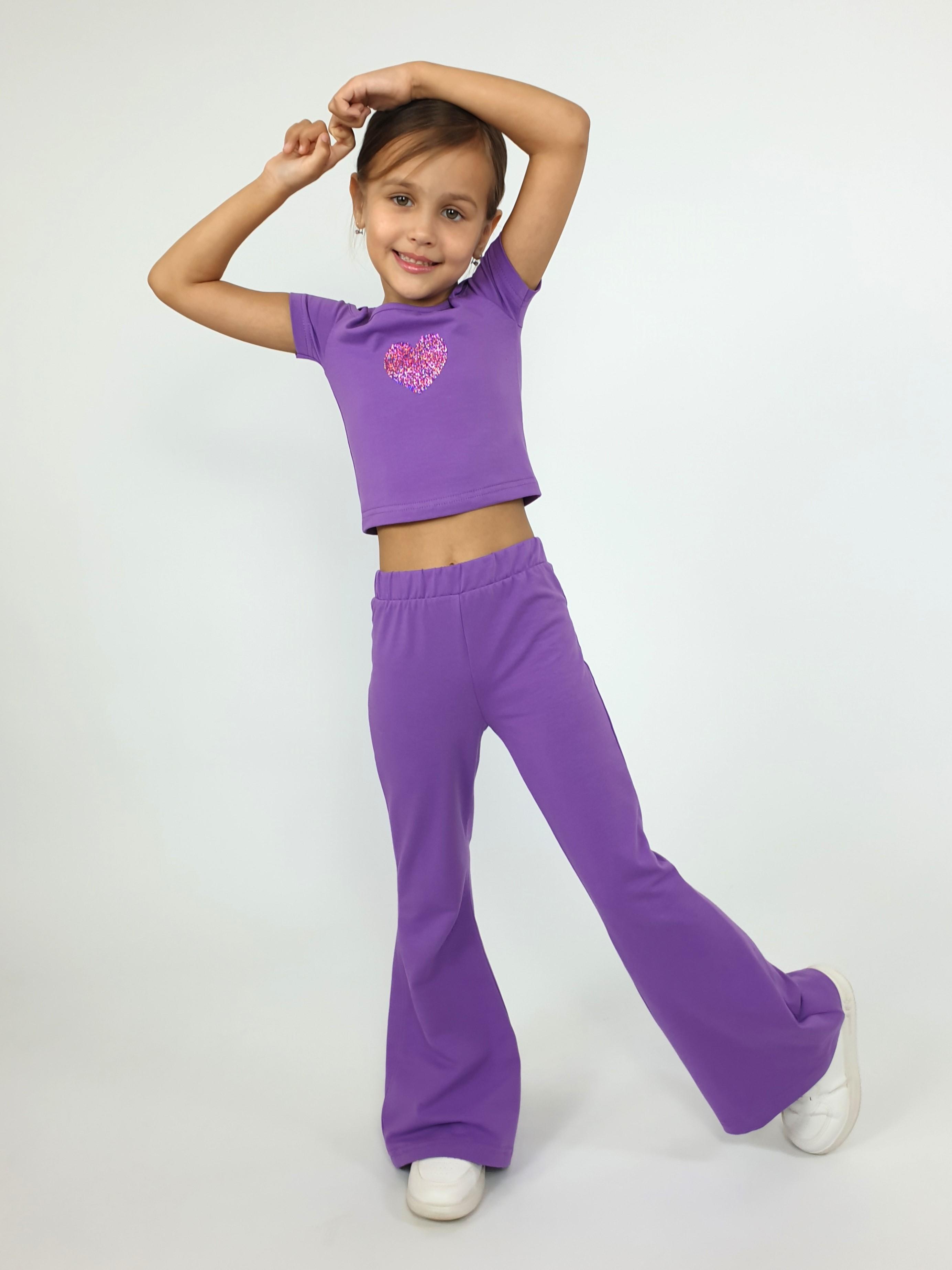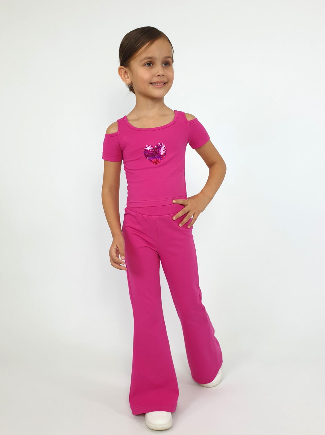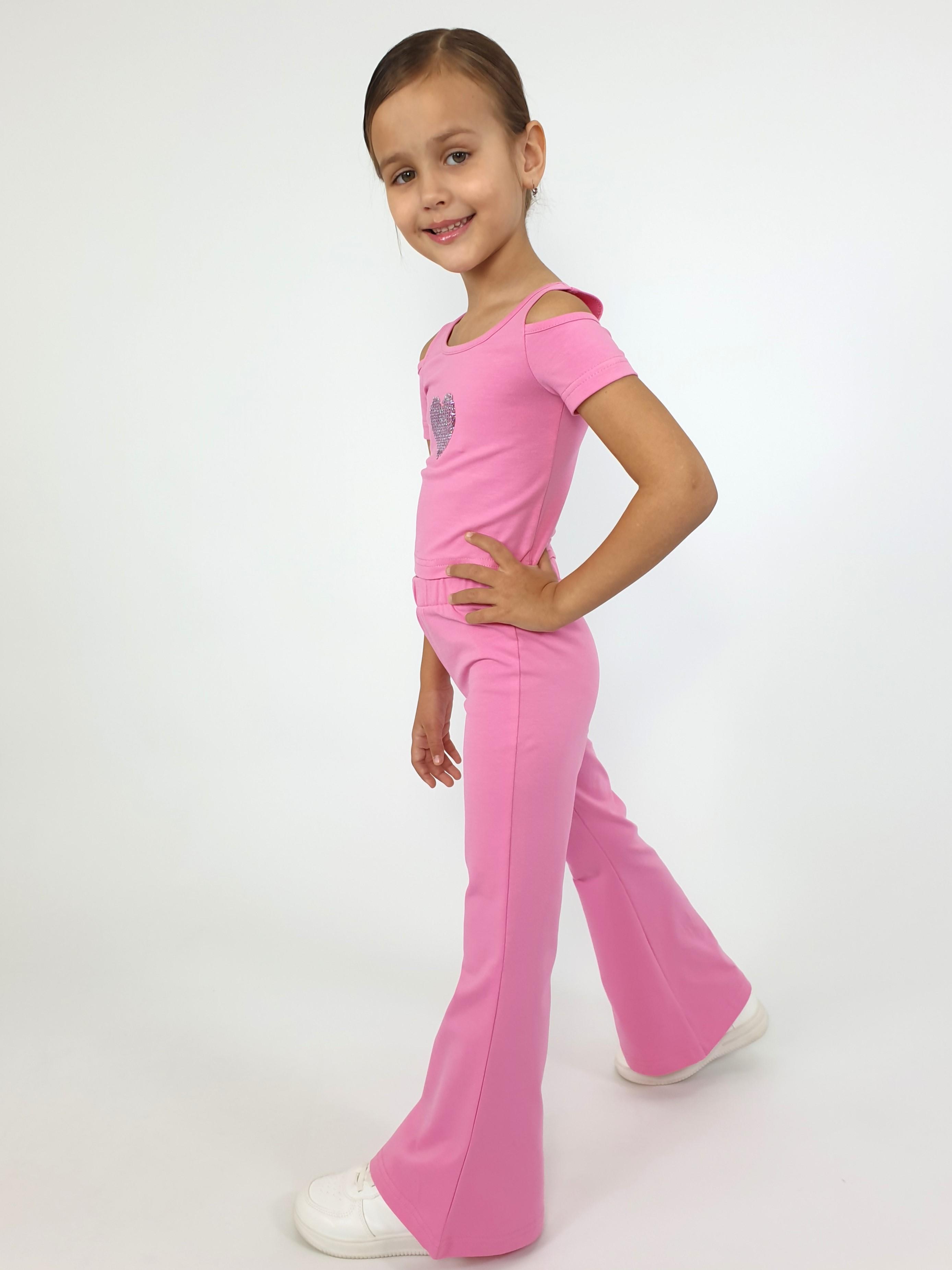 Кулирное полотно: 95% х/б,5% лайкра. Джемпер(фуфайка)-укороченный с коротким рукавом,с вырезом на плече.Горловина окантована.Вышивка(пайетки) на переде. Брюки-длинные,клеш.Пояс притачной с резинкой,низ подшит.