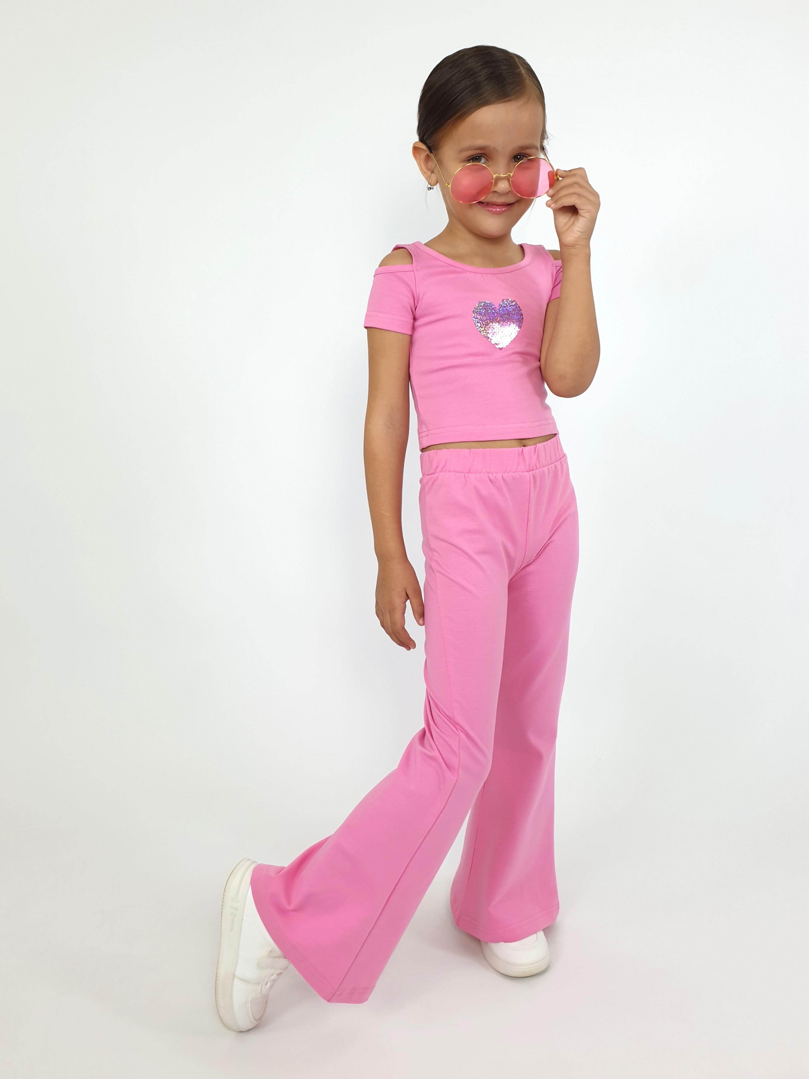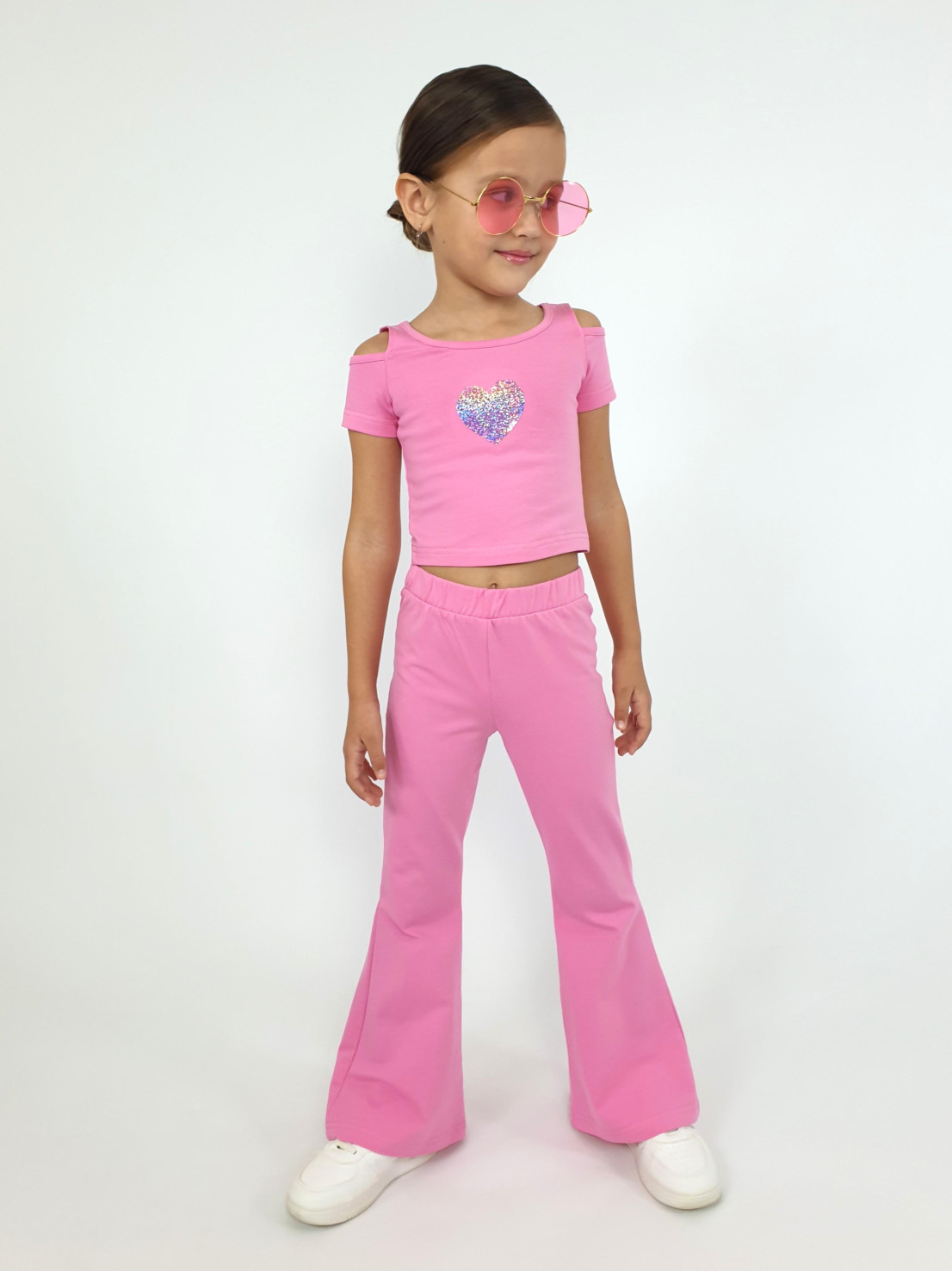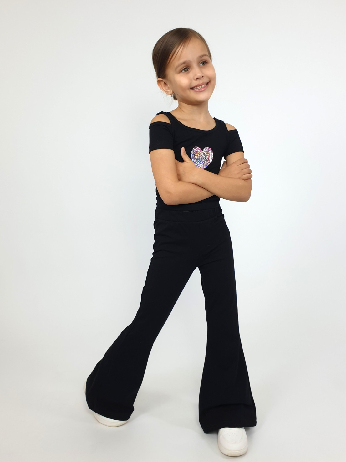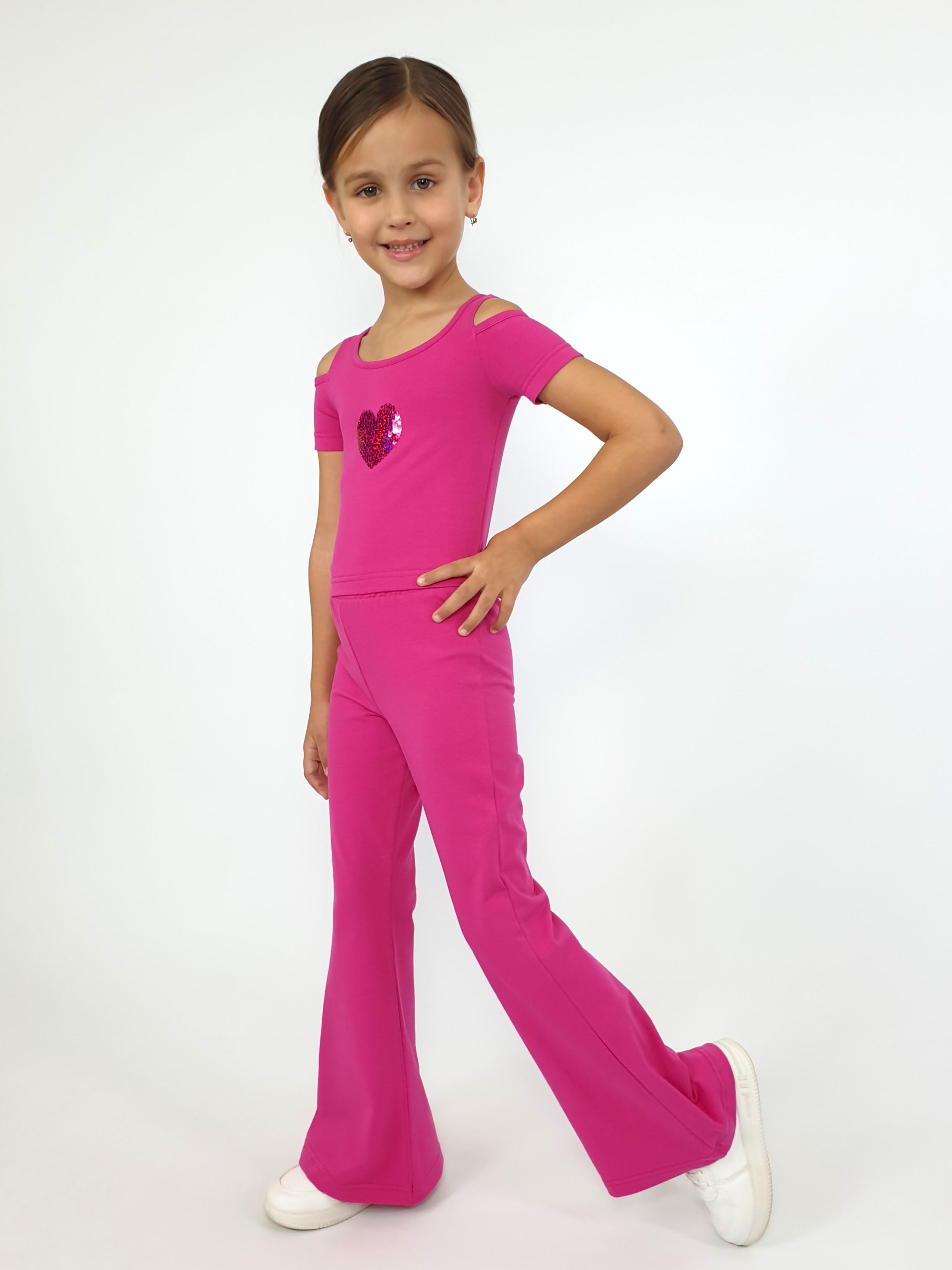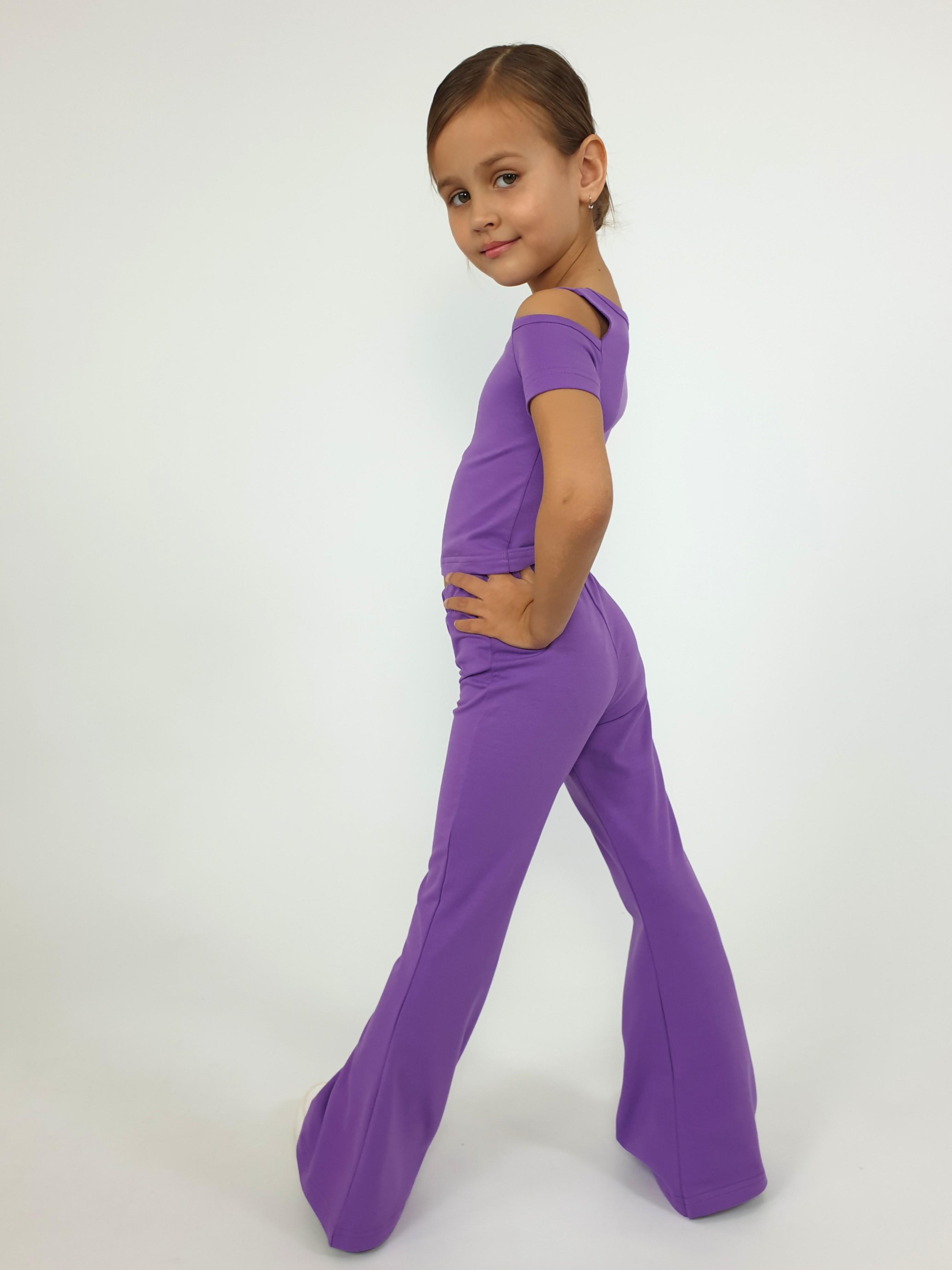 Кулирное полотно: 95% х/б,5% лайкра. Джемпер(фуфайка)-укороченный с коротким рукавом,с вырезом на плече.Горловина окантована.Вышивка(пайетки) на переде. Брюки-длинные,клеш.Пояс притачной с резинкой,низ подшит.