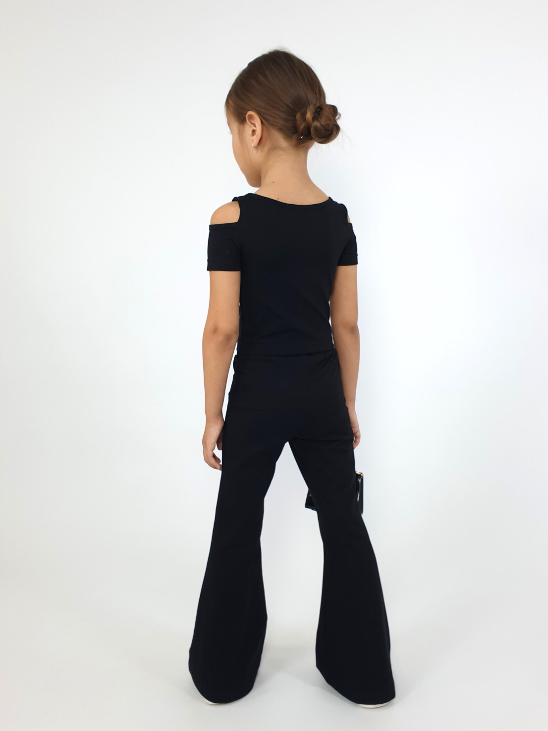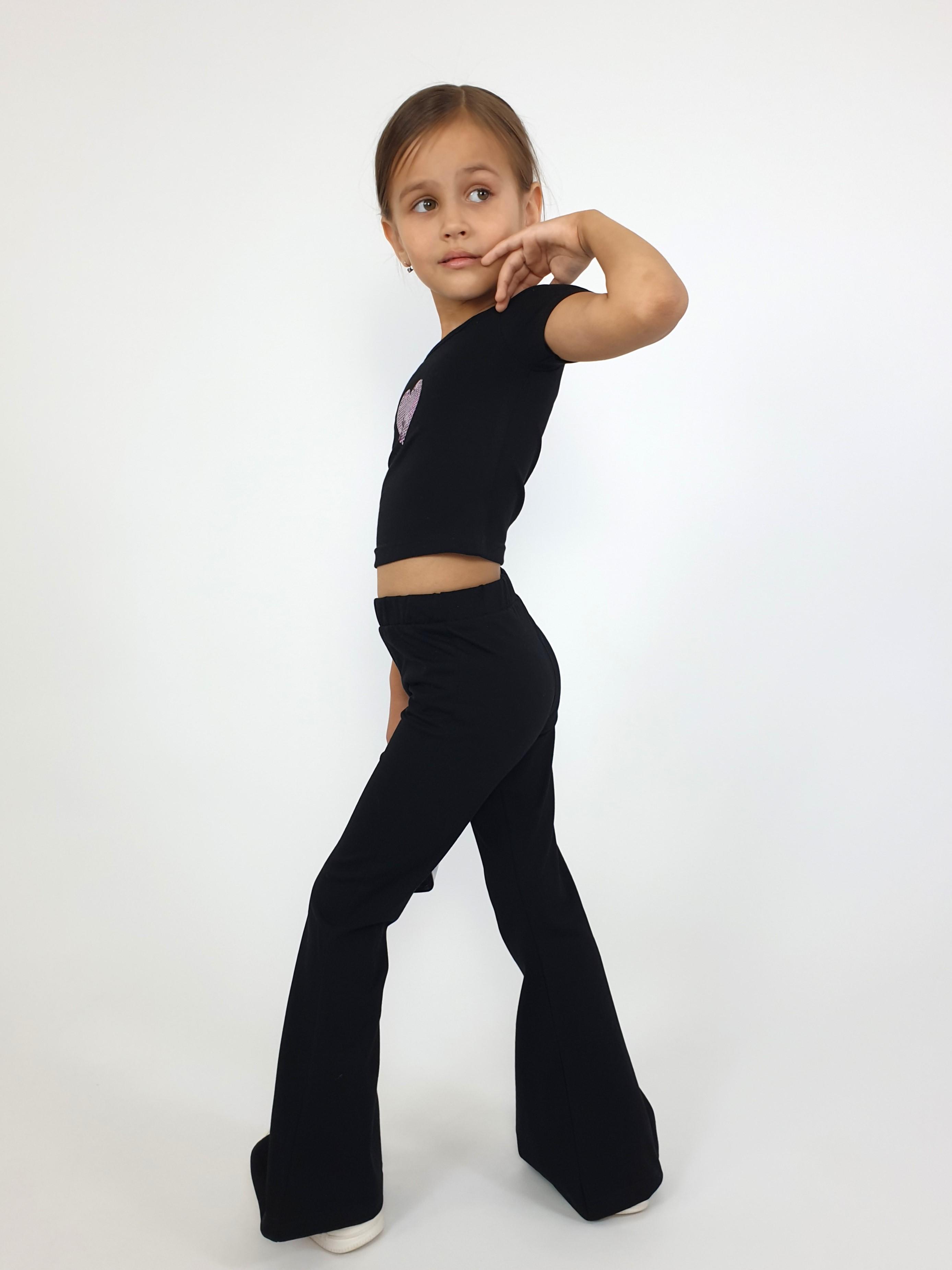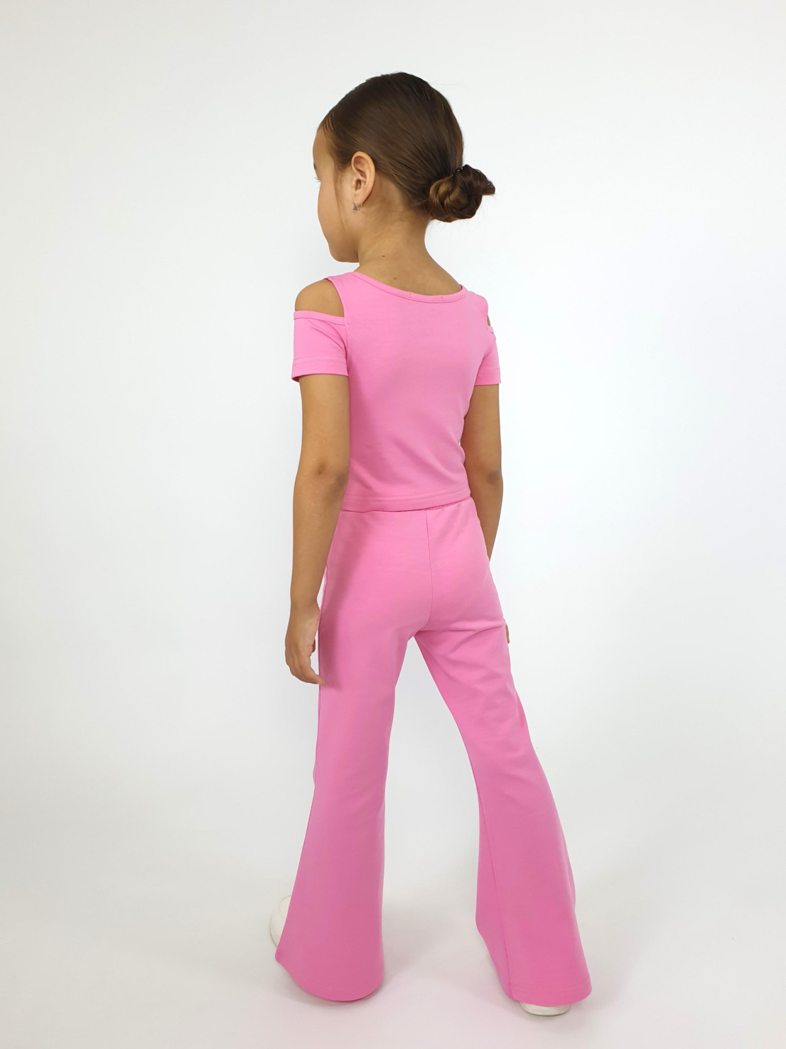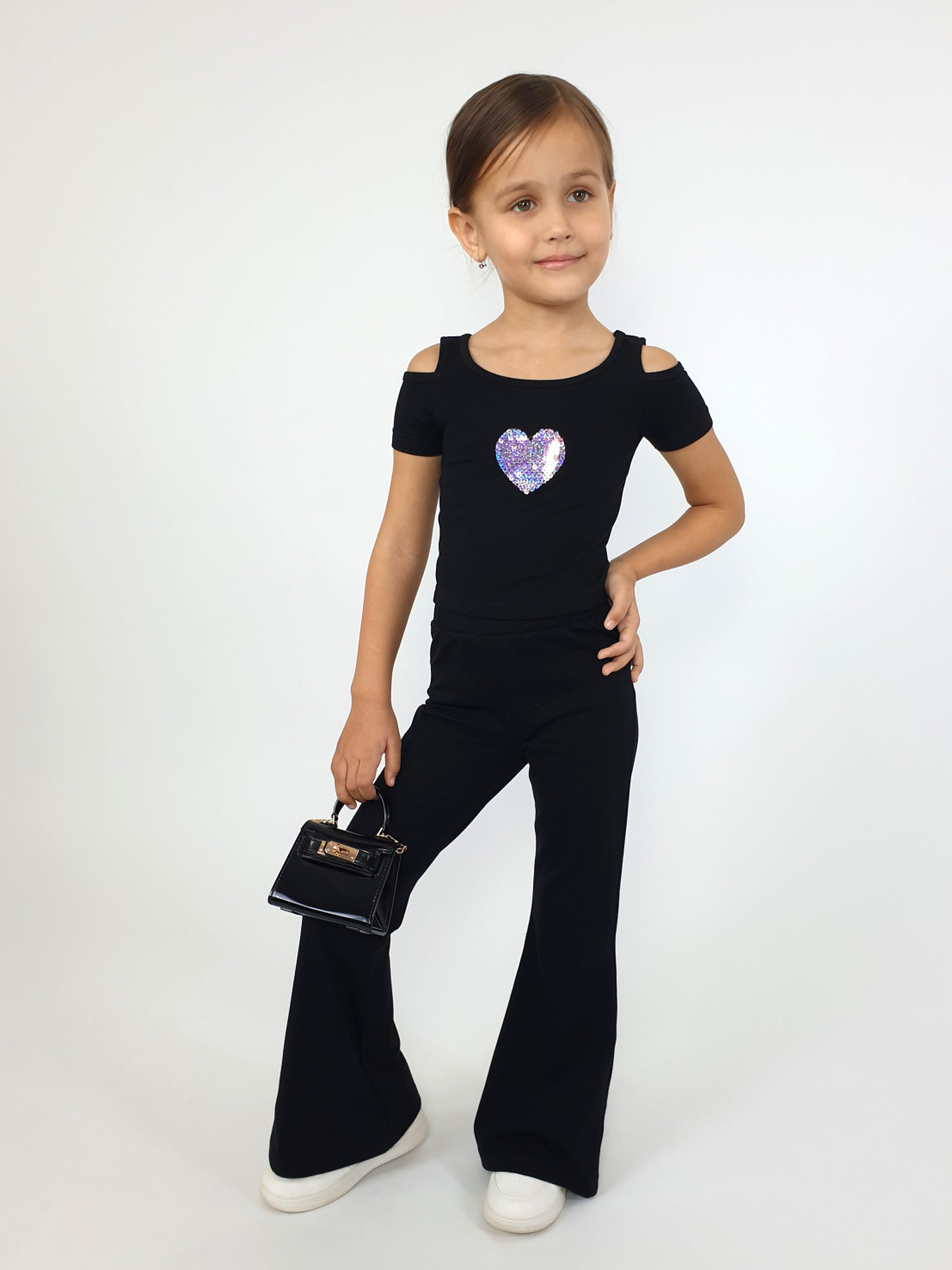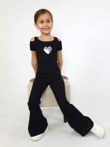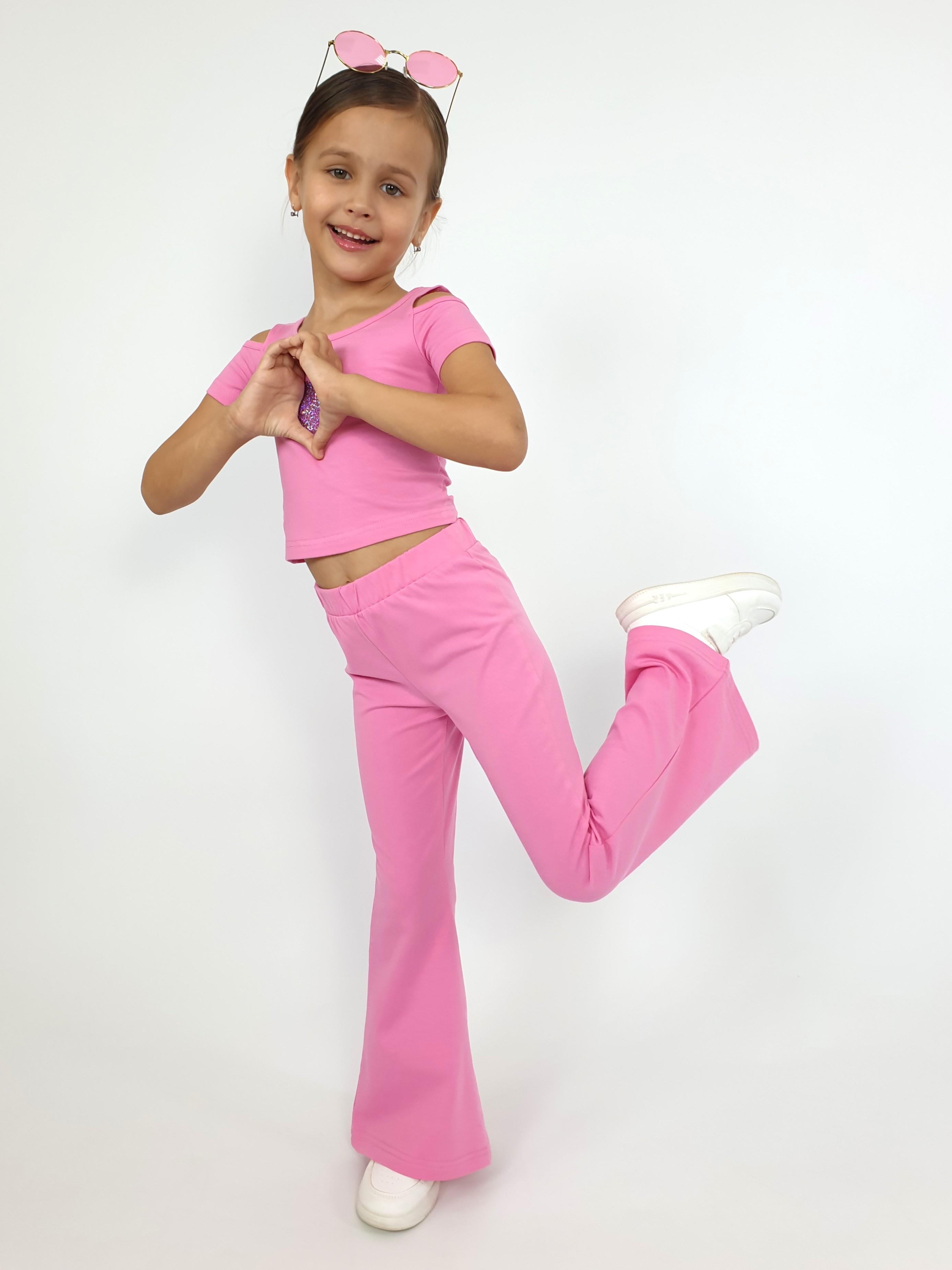 Кулирное полотно: 95% х/б,5% лайкра. Джемпер(фуфайка)-укороченный с коротким рукавом,с вырезом на плече.Горловина окантована.Вышивка(пайетки) на переде. Брюки-длинные,клеш.Пояс притачной с резинкой,низ подшит.