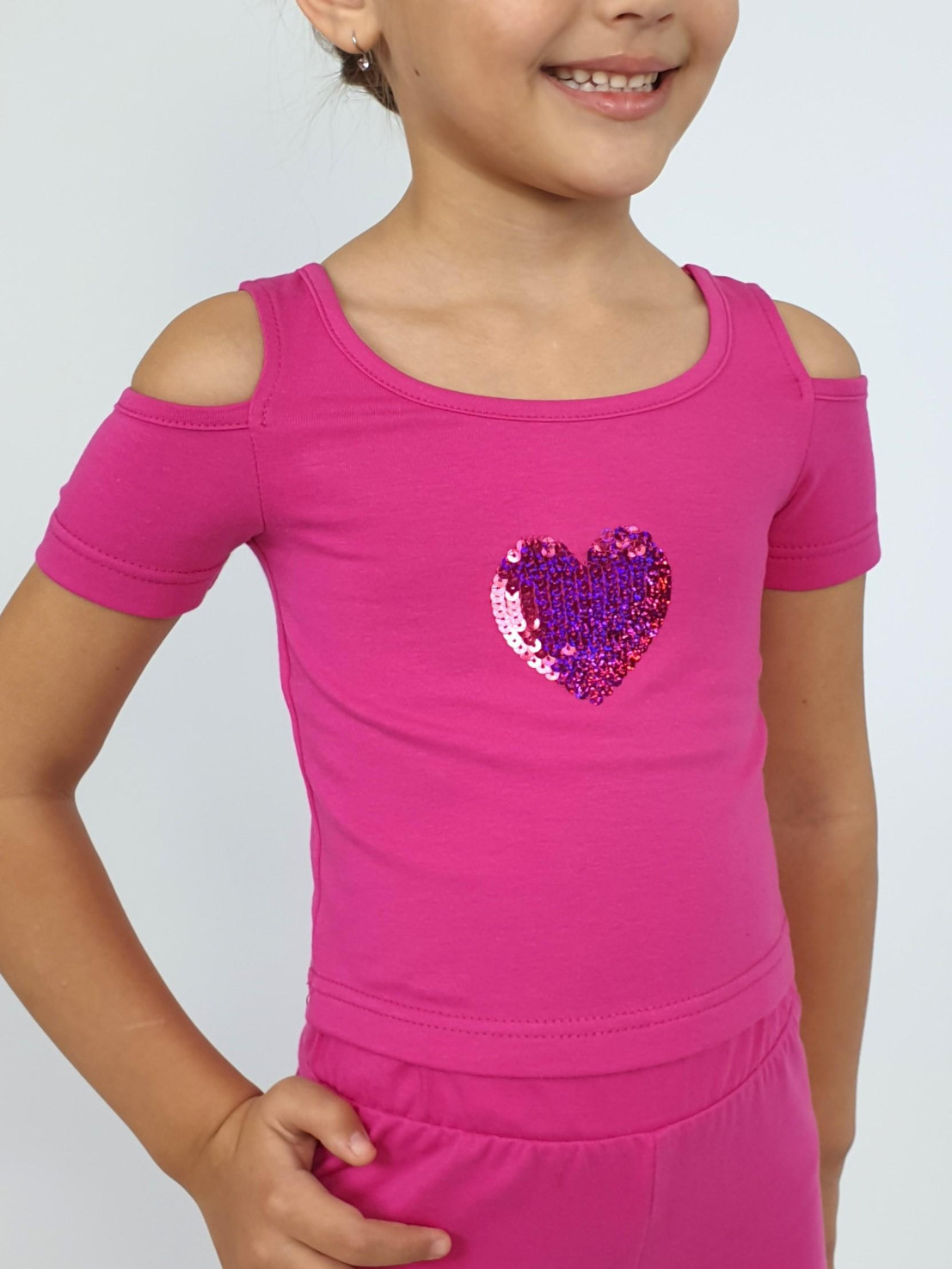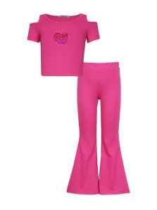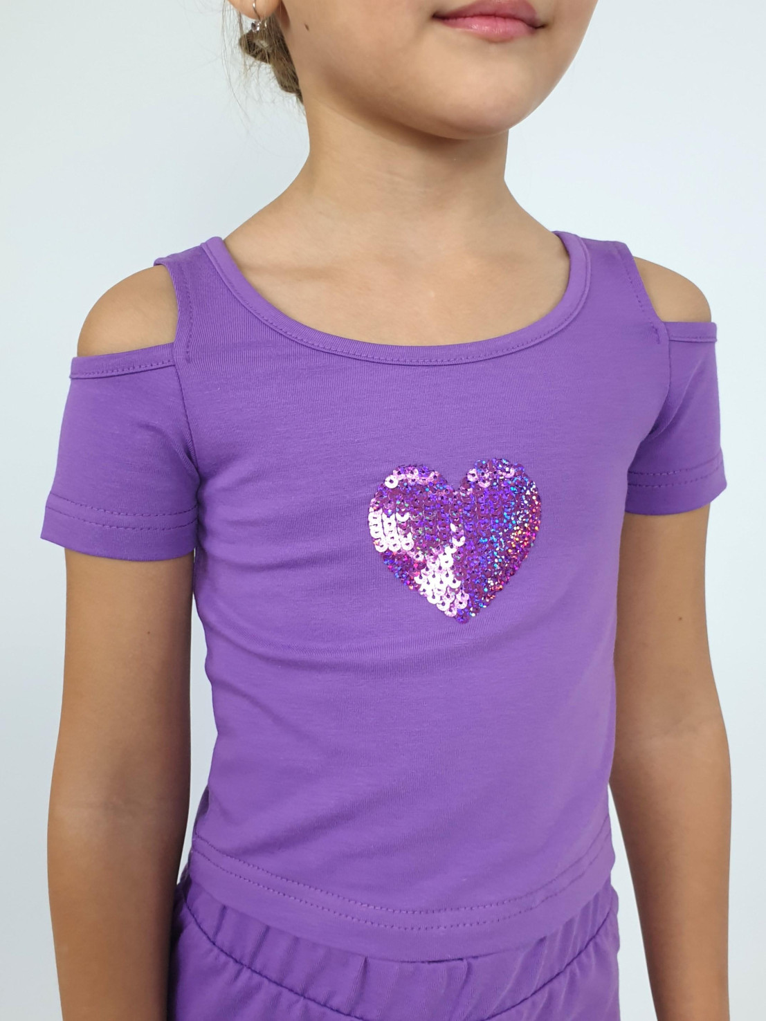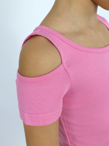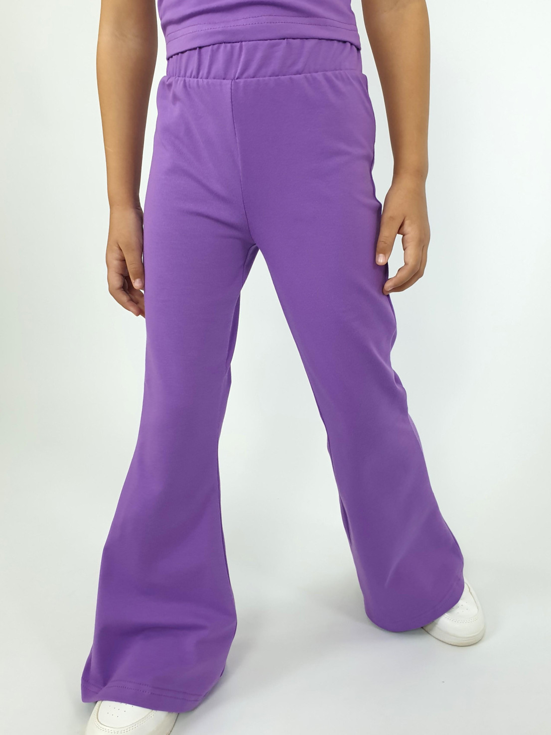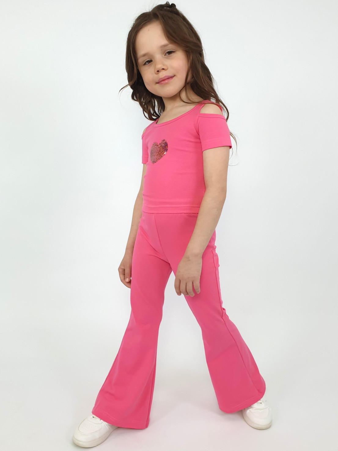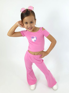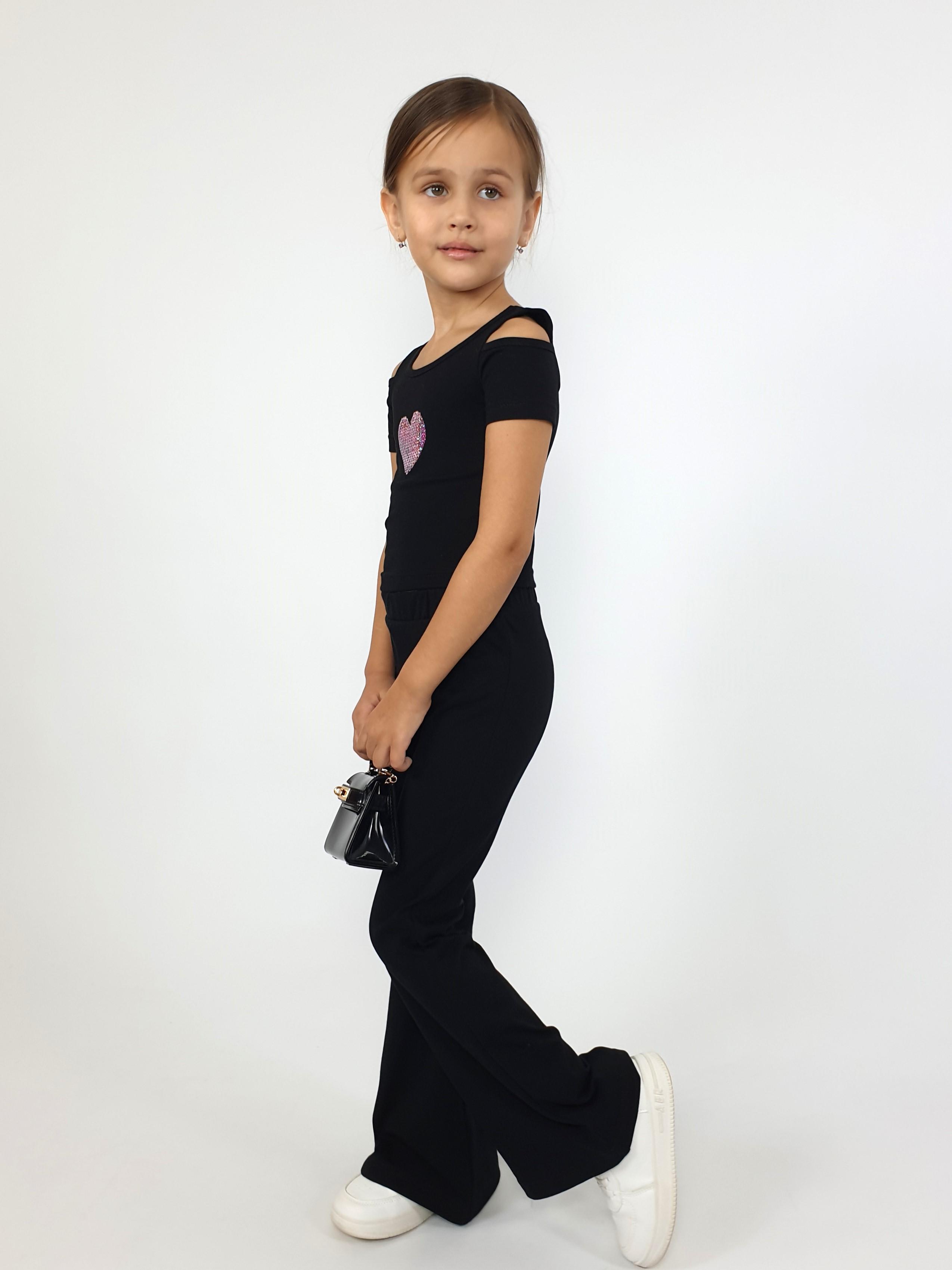 Кулирное полотно: 95% х/б,5% лайкра. Джемпер(фуфайка)-укороченный с коротким рукавом,с вырезом на плече.Горловина окантована.Вышивка(пайетки) на переде. Брюки-длинные,клеш.Пояс притачной с резинкой,низ подшит.