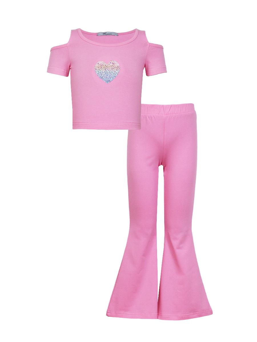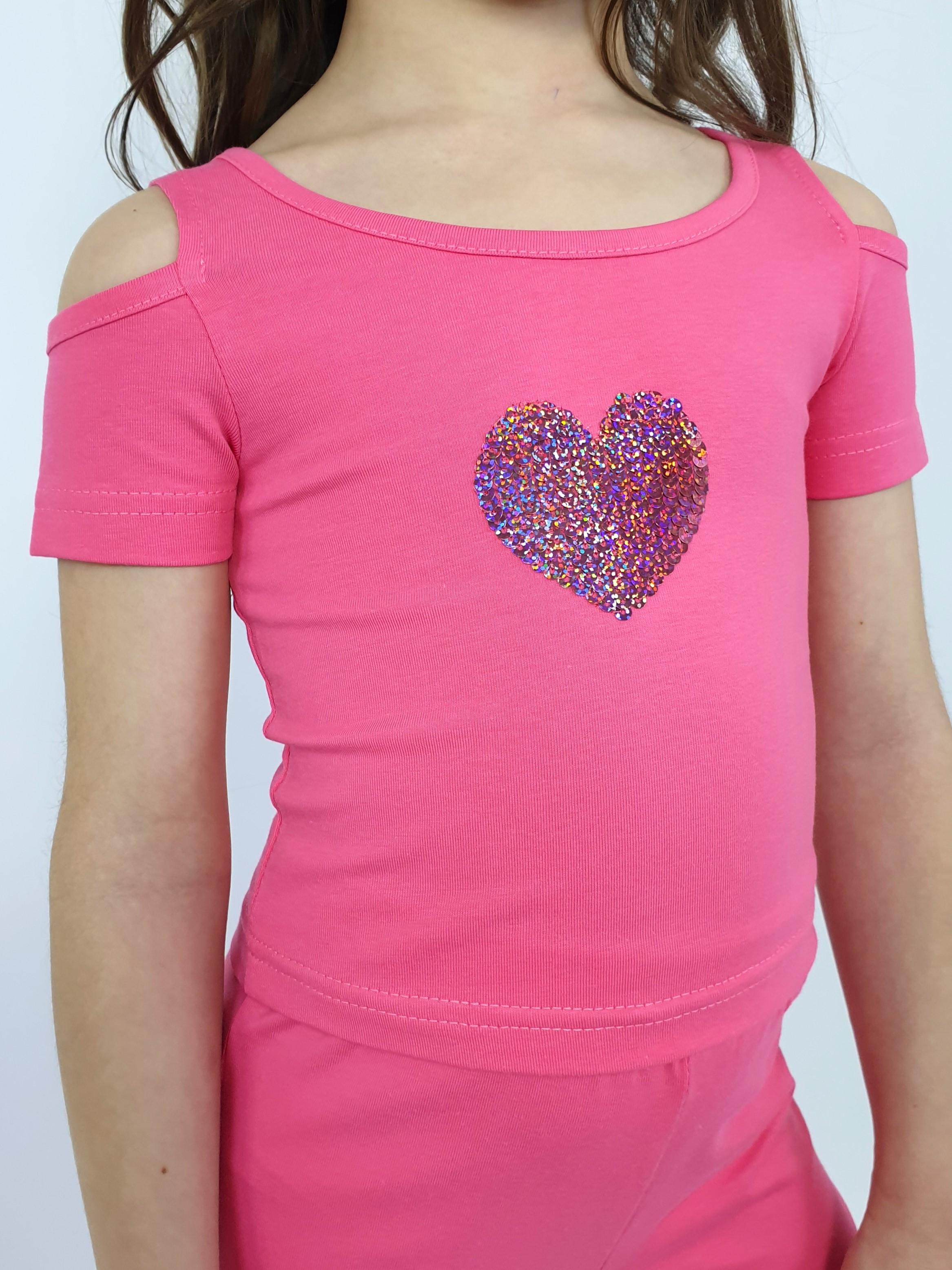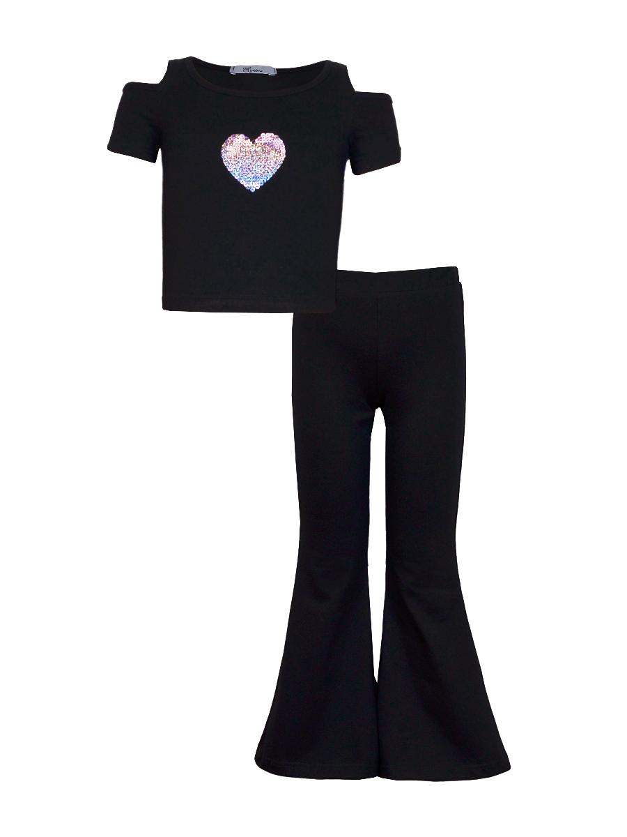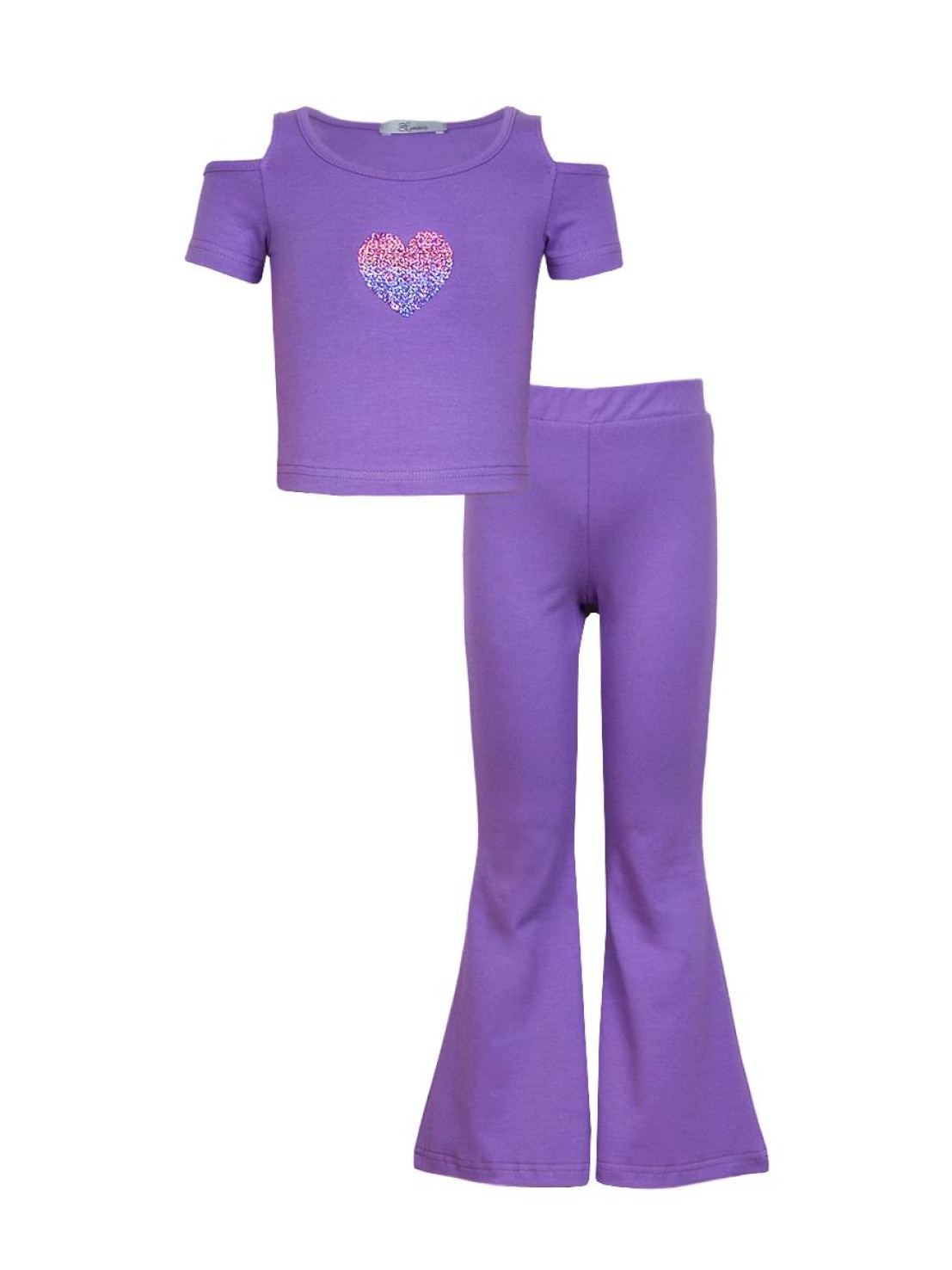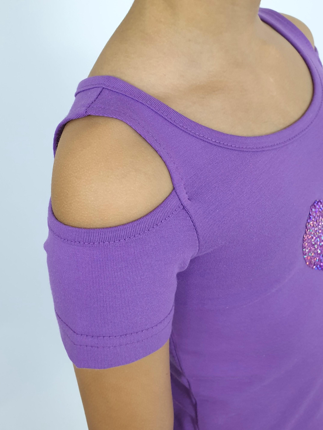 Кулирное полотно: 95% х/б,5% лайкра. Джемпер(фуфайка)-укороченный с коротким рукавом,с вырезом на плече.Горловина окантована.Вышивка(пайетки) на переде. Брюки-длинные,клеш.Пояс притачной с резинкой,низ подшит.