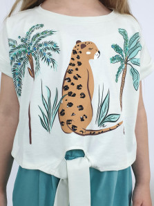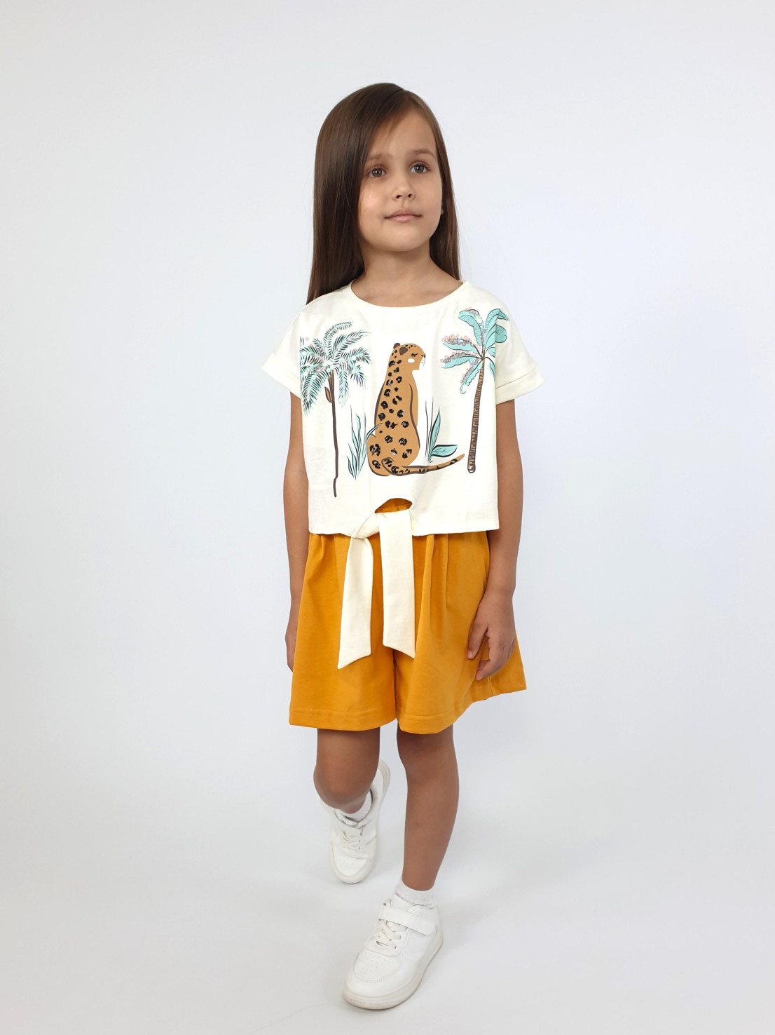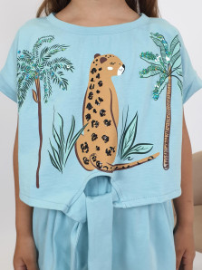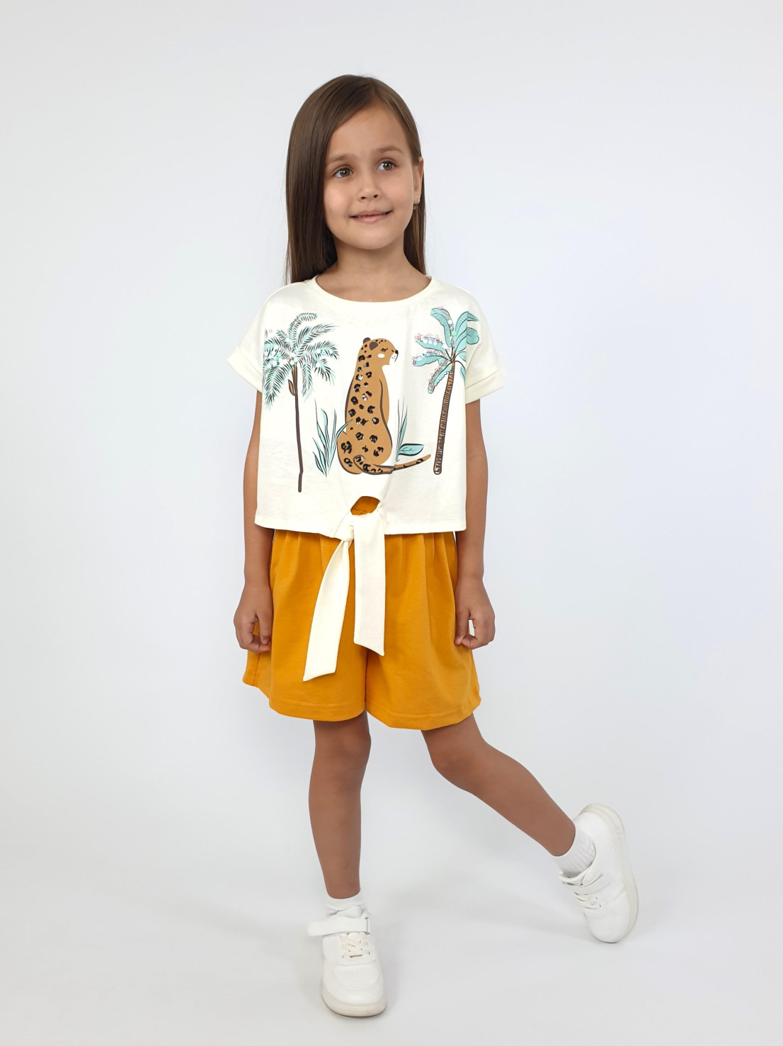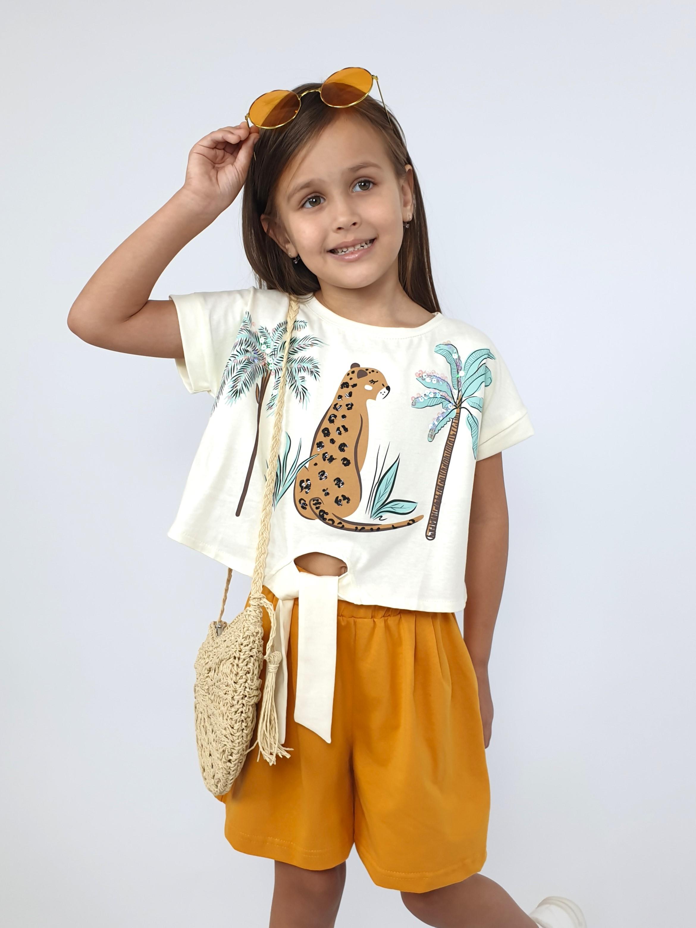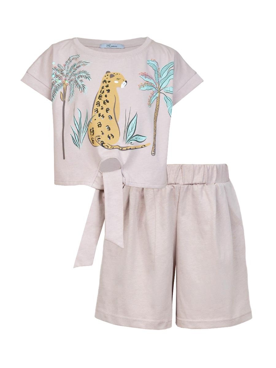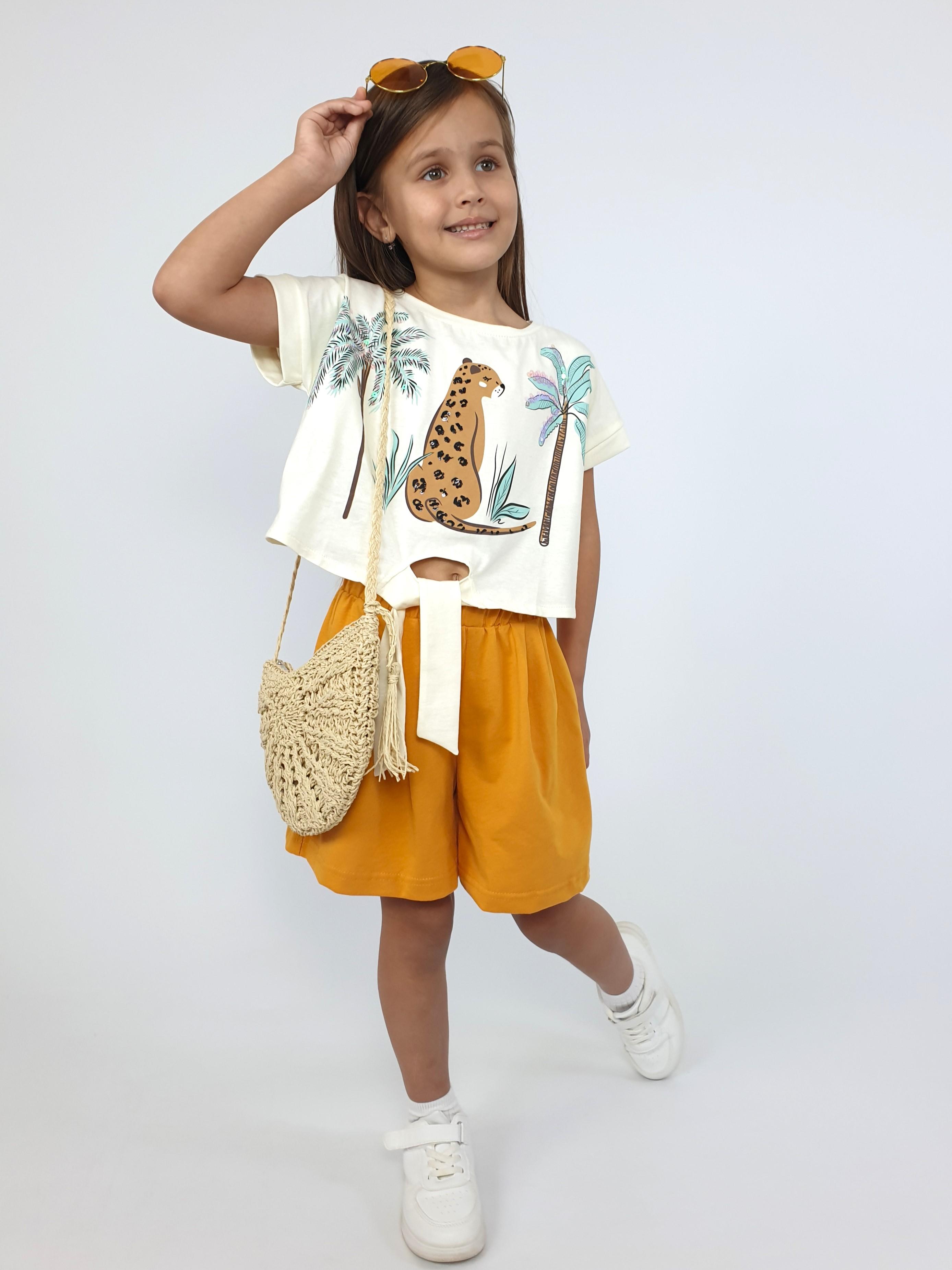 Кулирное полотно: 100% х/б. Джемпер-прямого силуэта,спущенное плечо с притачной манжетой.Внизу,спереди завязана на "узел".Горловина обработана планкой.Перед с печатью и вышивкой(пайетки). Шорты-короткие,складки спереди,два боковых кармана,пояс на резинке.