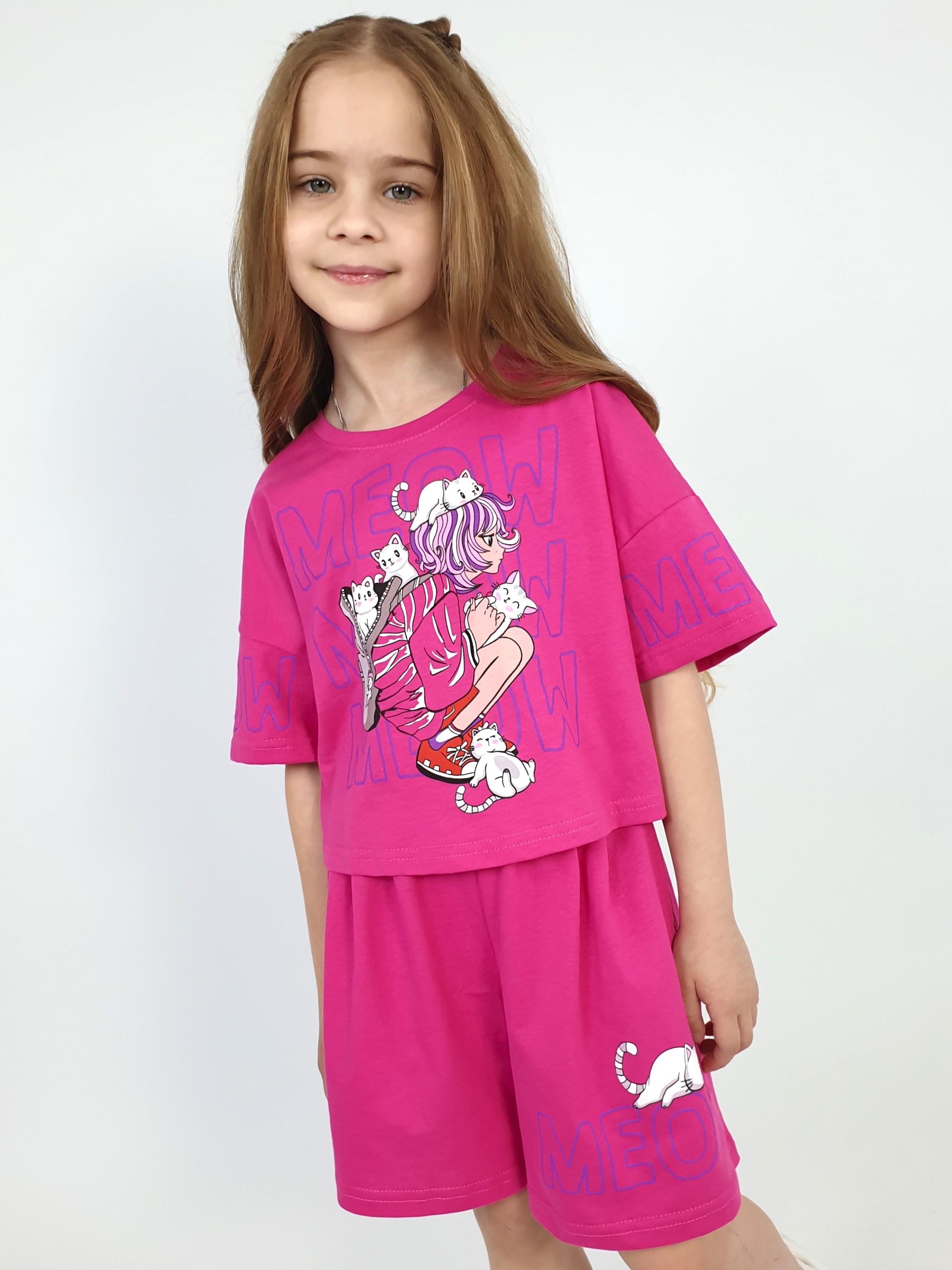 Кулирное полотно: 100% х/б. Джемпер(оверсайз)-укороченная,спущенное плечо,короткий рукав с печатью.Печать на переде,горловина обработана планкой. Шорты-короткие,складки спереди,два боковых кармана,пояс на резинке.Печать на левой половинке внизу.