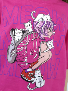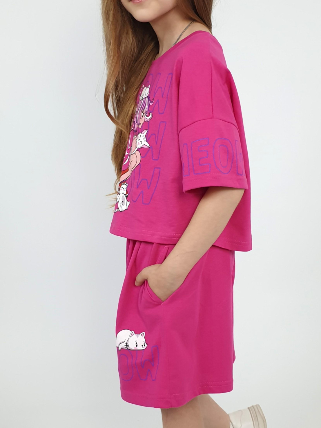 Кулирное полотно: 100% х/б. Джемпер(оверсайз)-укороченная,спущенное плечо,короткий рукав с печатью.Печать на переде,горловина обработана планкой. Шорты-короткие,складки спереди,два боковых кармана,пояс на резинке.Печать на левой половинке внизу.