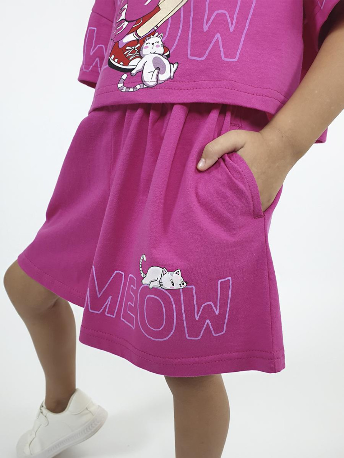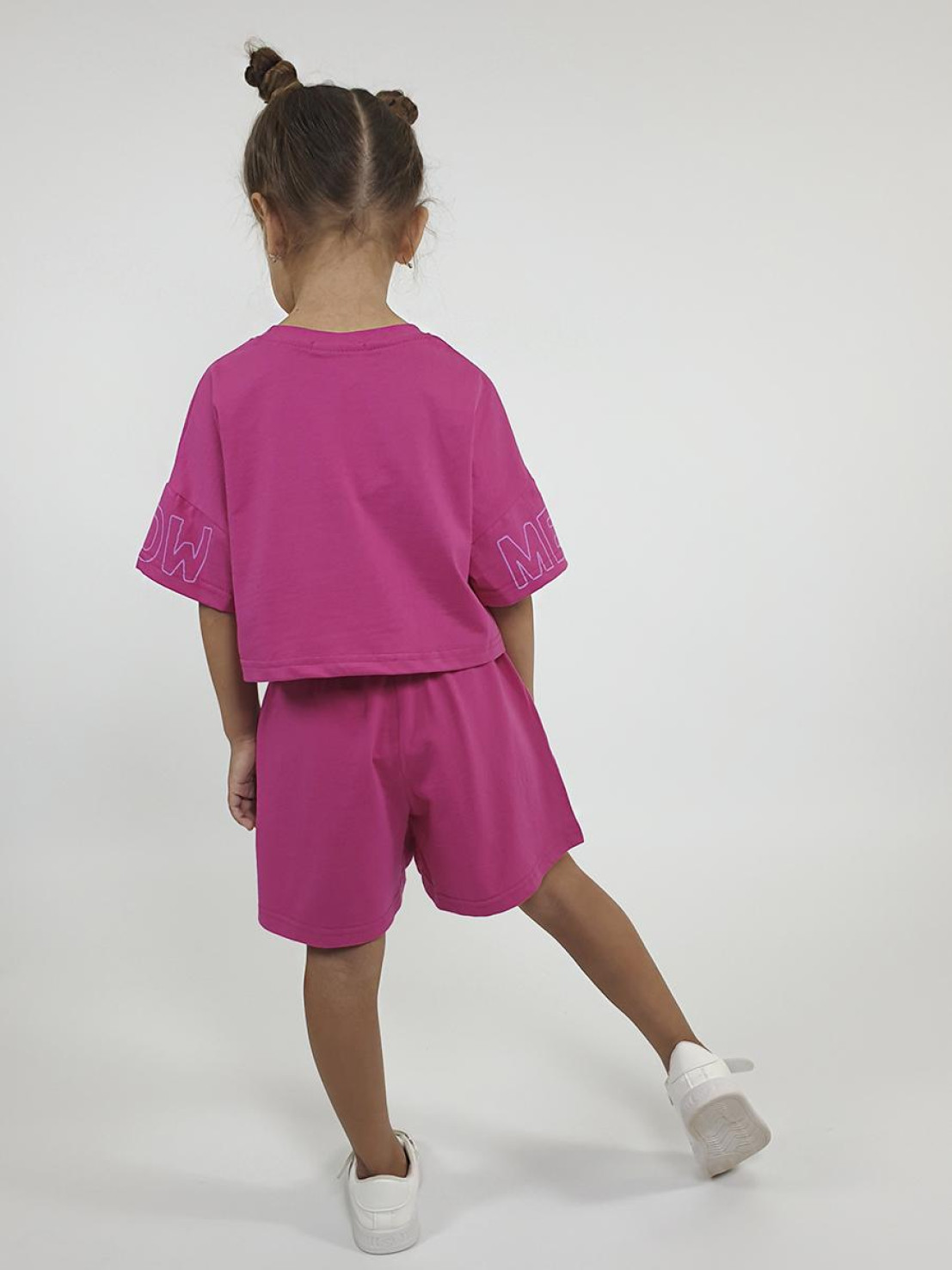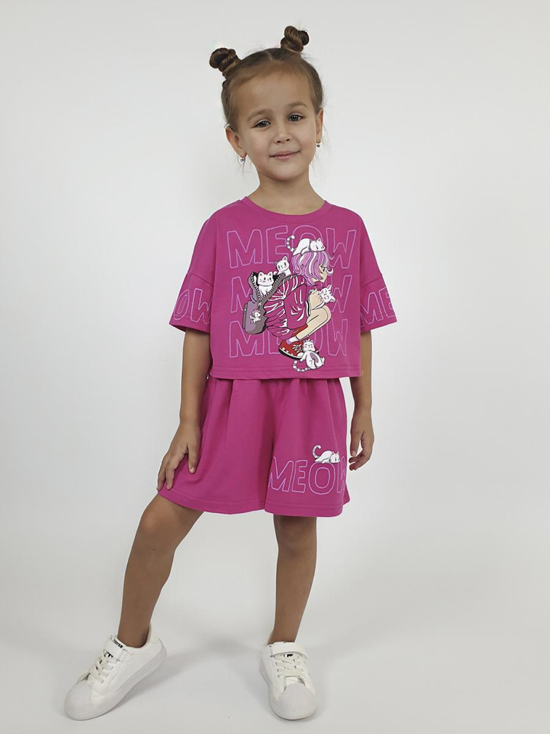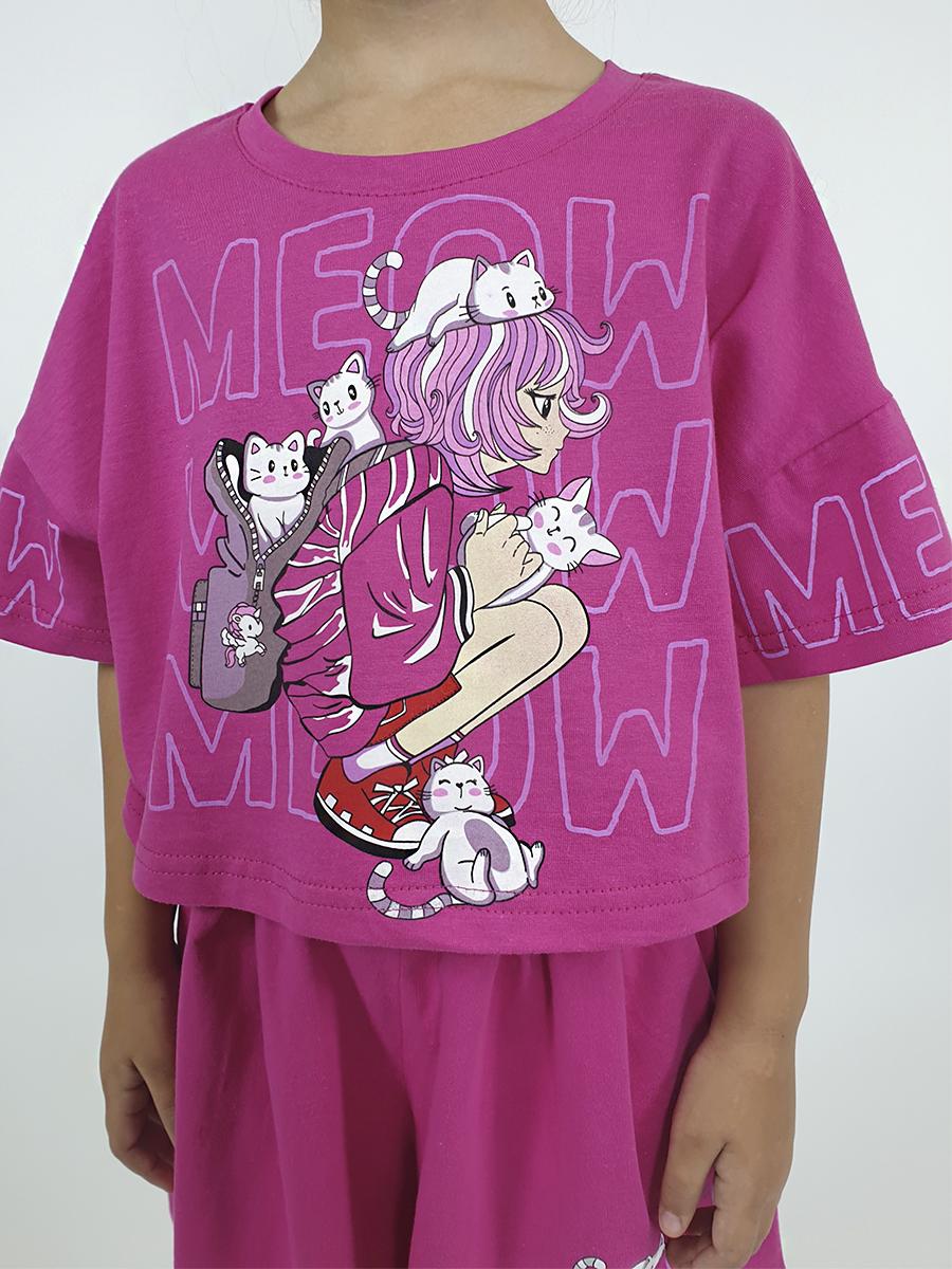 Кулирное полотно: 100% х/б. Джемпер(оверсайз)-укороченная,спущенное плечо,короткий рукав с печатью.Печать на переде,горловина обработана планкой. Шорты-короткие,складки спереди,два боковых кармана,пояс на резинке.Печать на левой половинке внизу.