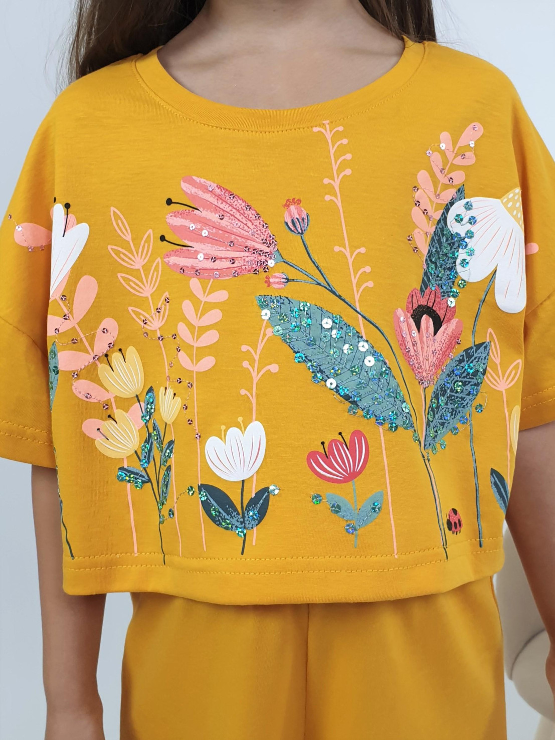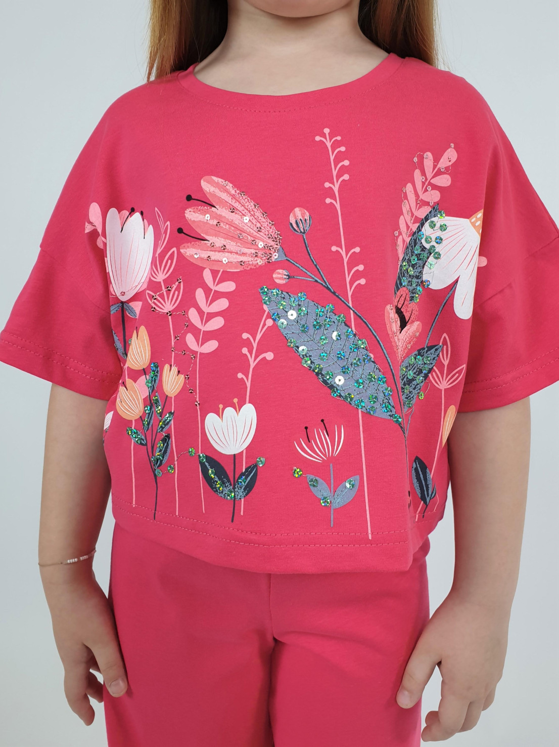 Кулирное полотно:100% х/б. Фуфайка-прямая,спущенное плечо,короткий рукав.Печать и вышивка пайетки на переде.Горловина обработана планкой,низ изделия подшит. Брюки-длинные на поясе с резинкой,расширены к низу.Печать внизу на передних половинках.