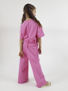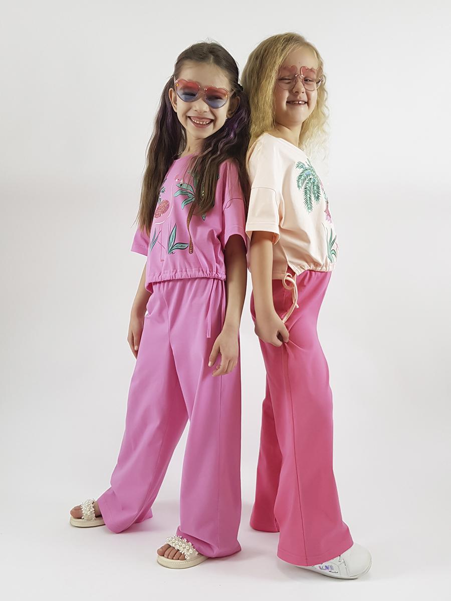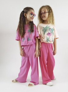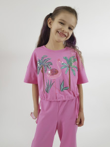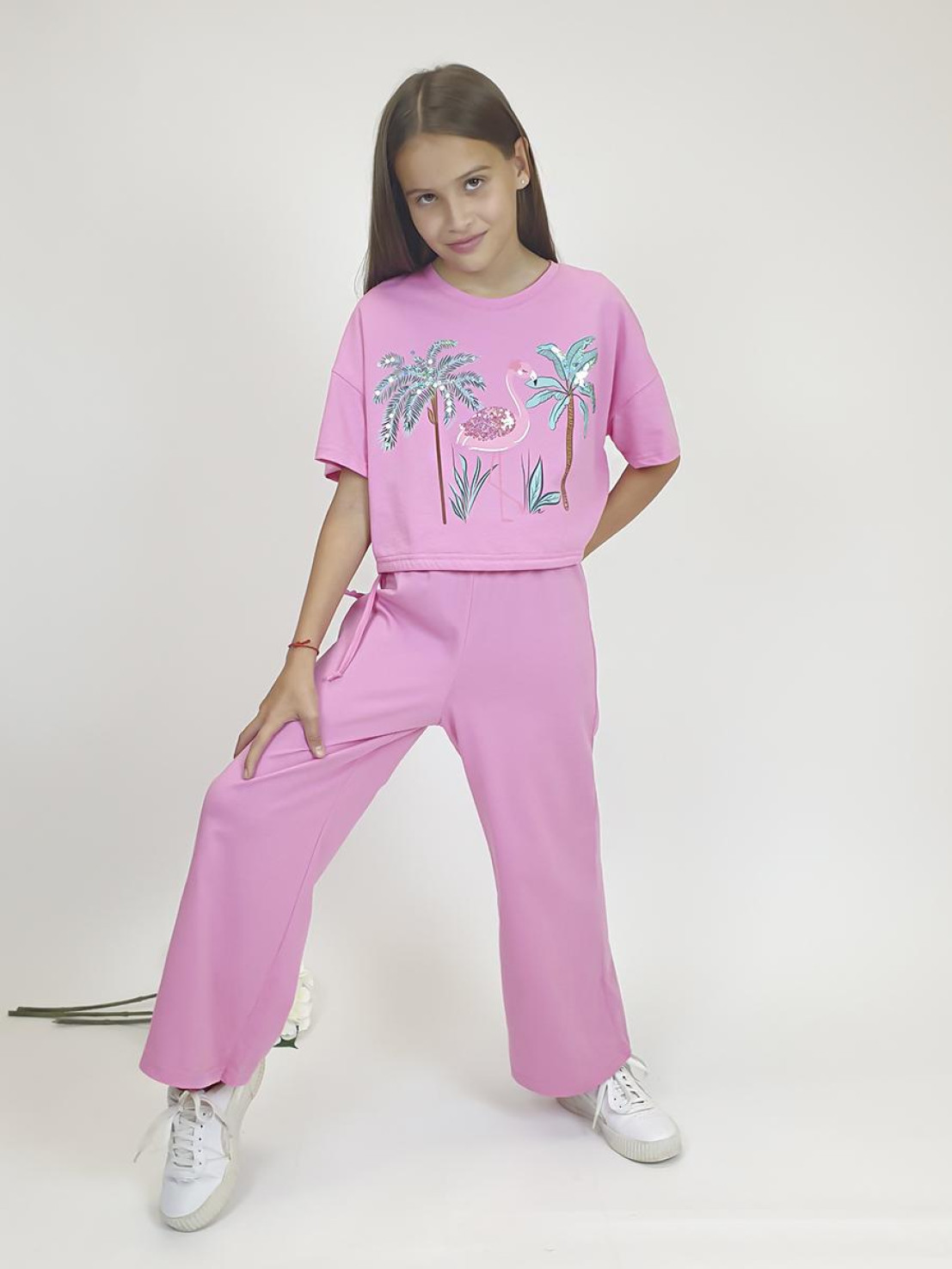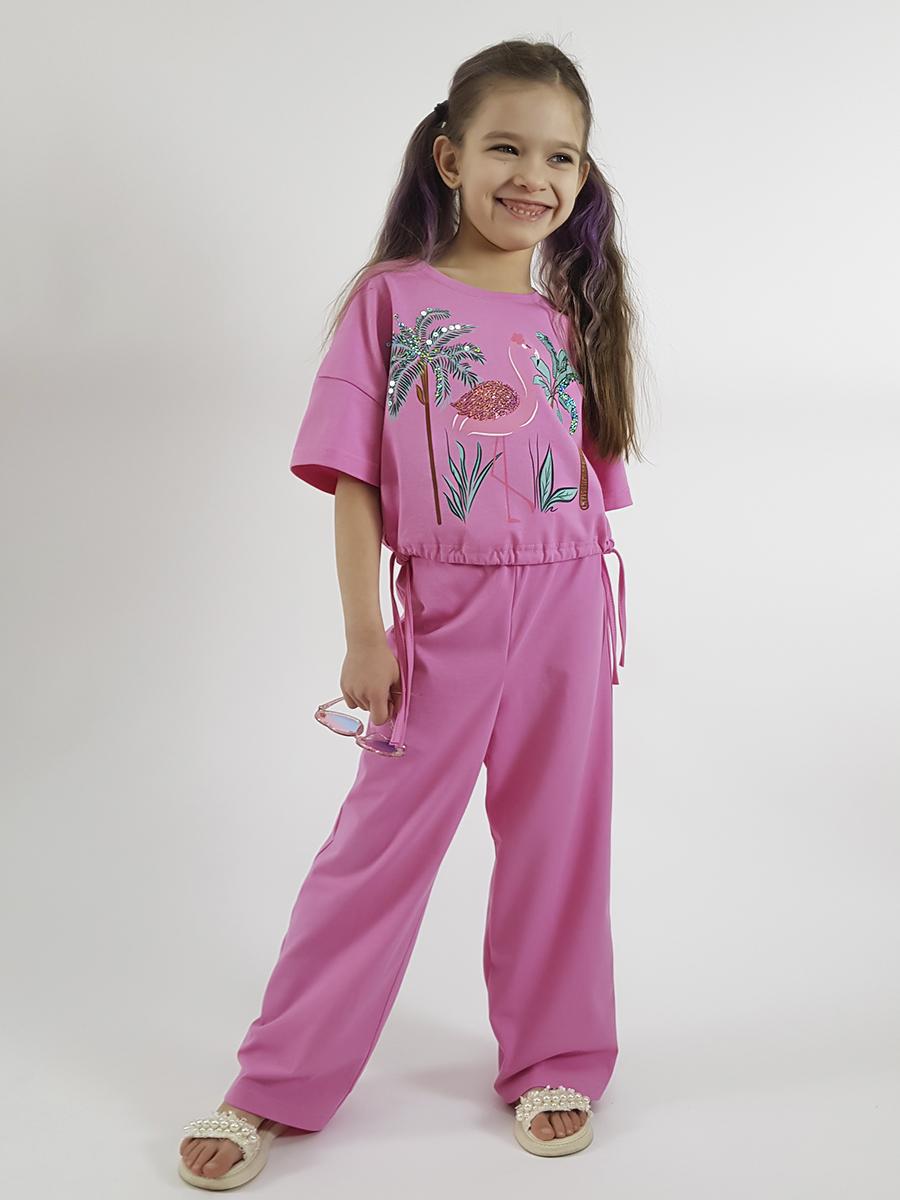 Кулирное полотно:100% х/б. Фуфайка-прямая,спущенное плечо,короткий рукав.Печать и вышивка пайетки на переде.Горловина обработана планкой,в низ изделия вставлен шнур и завязан сбоку. Брюки-длинные на поясе с резинкой,расширены к низу.