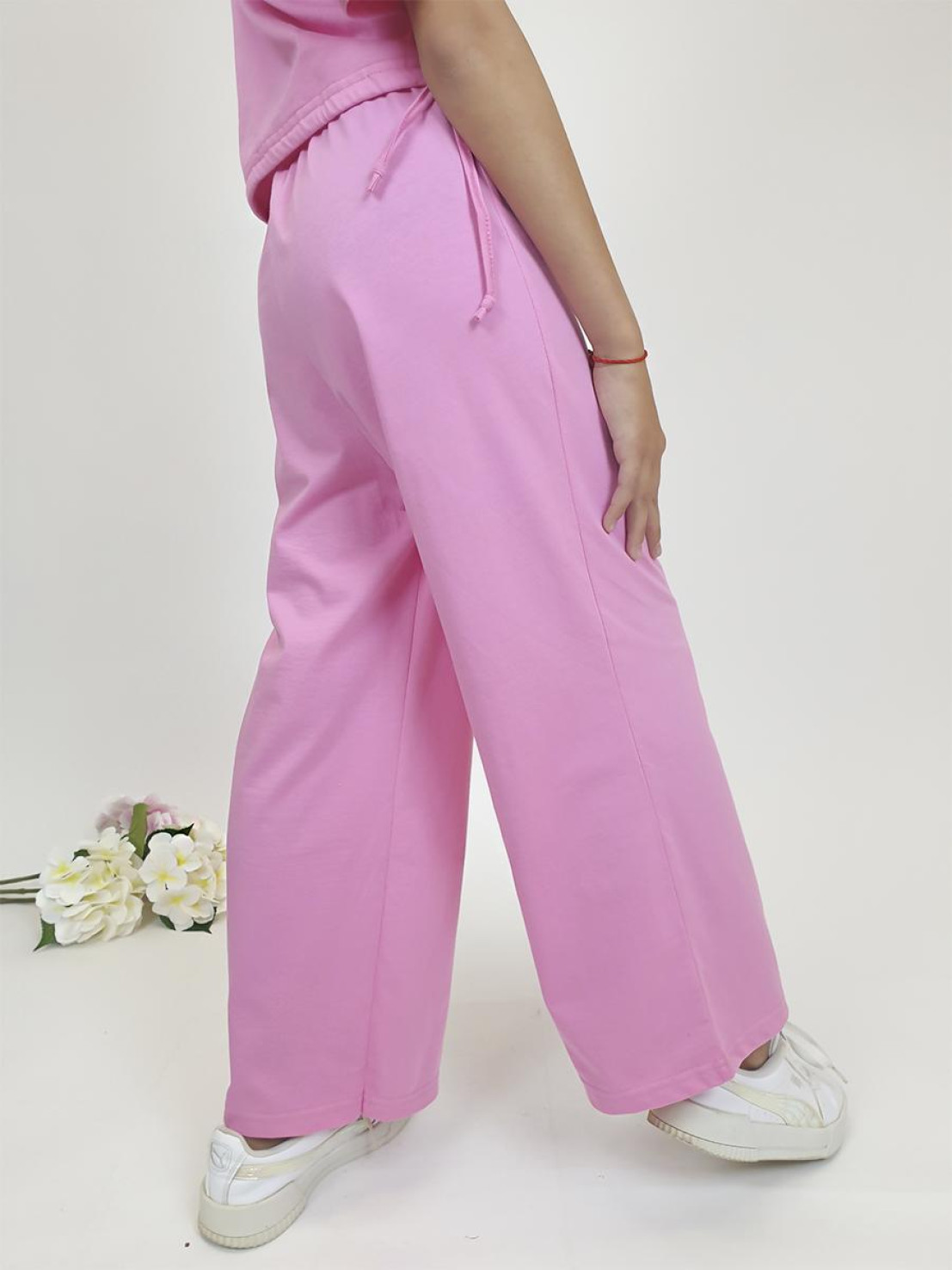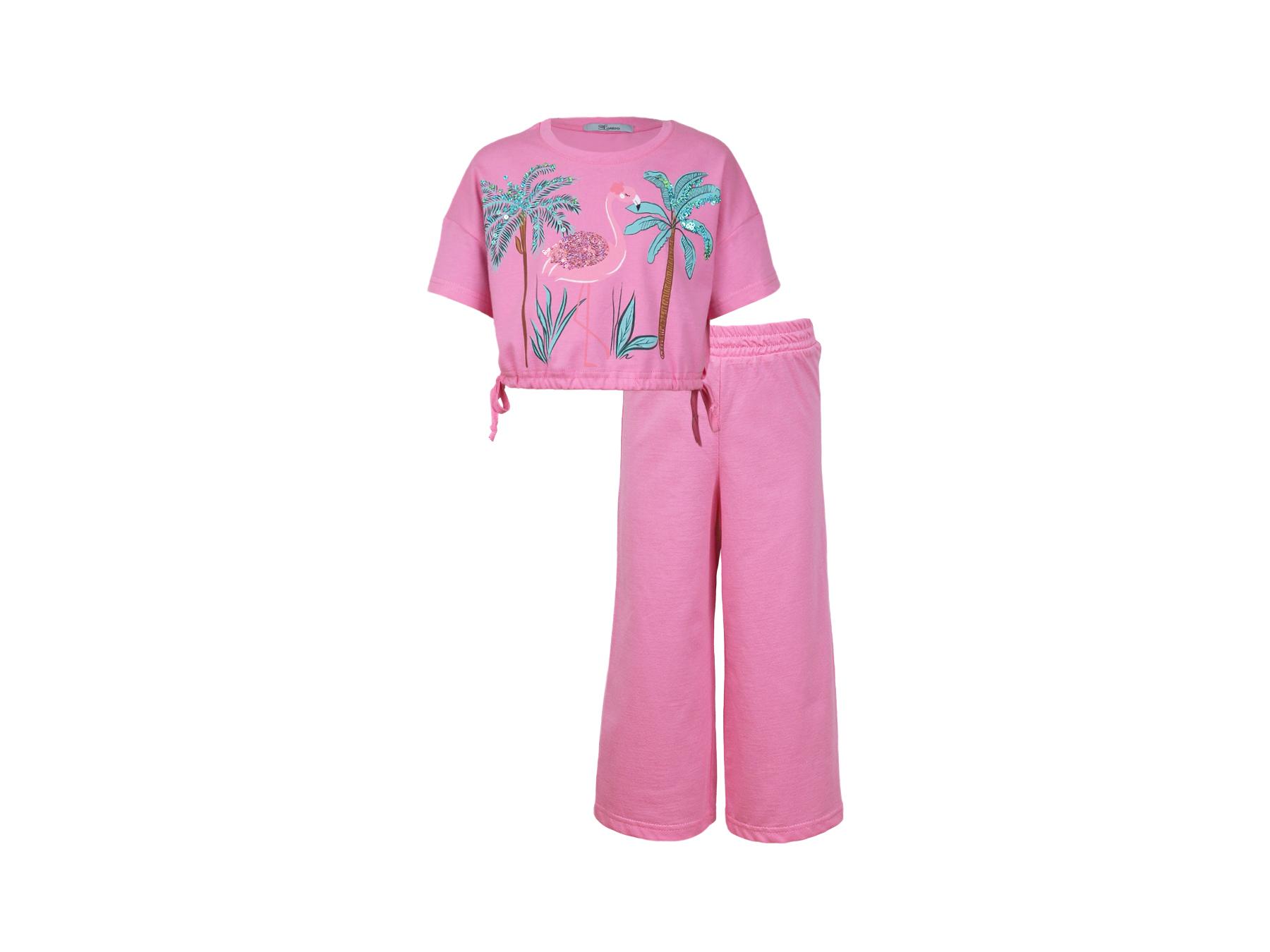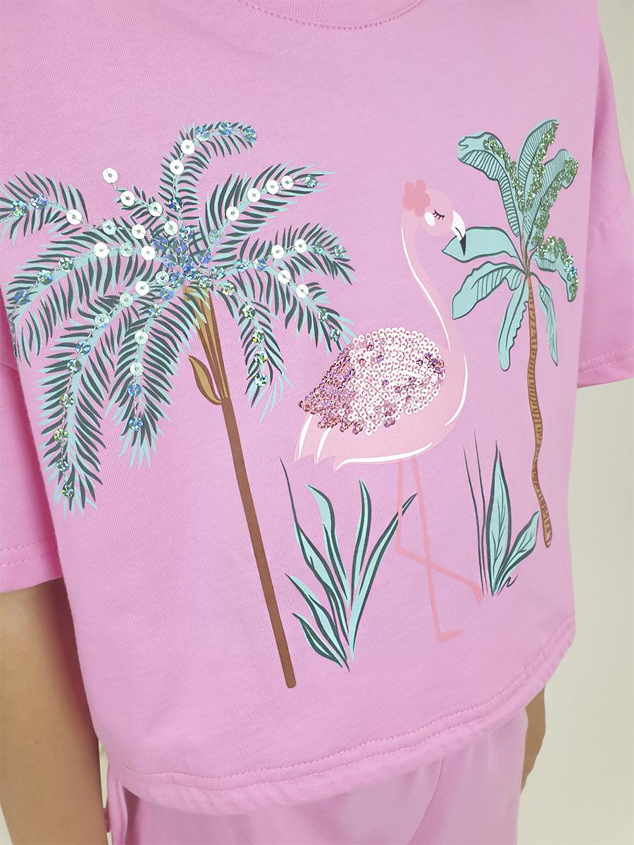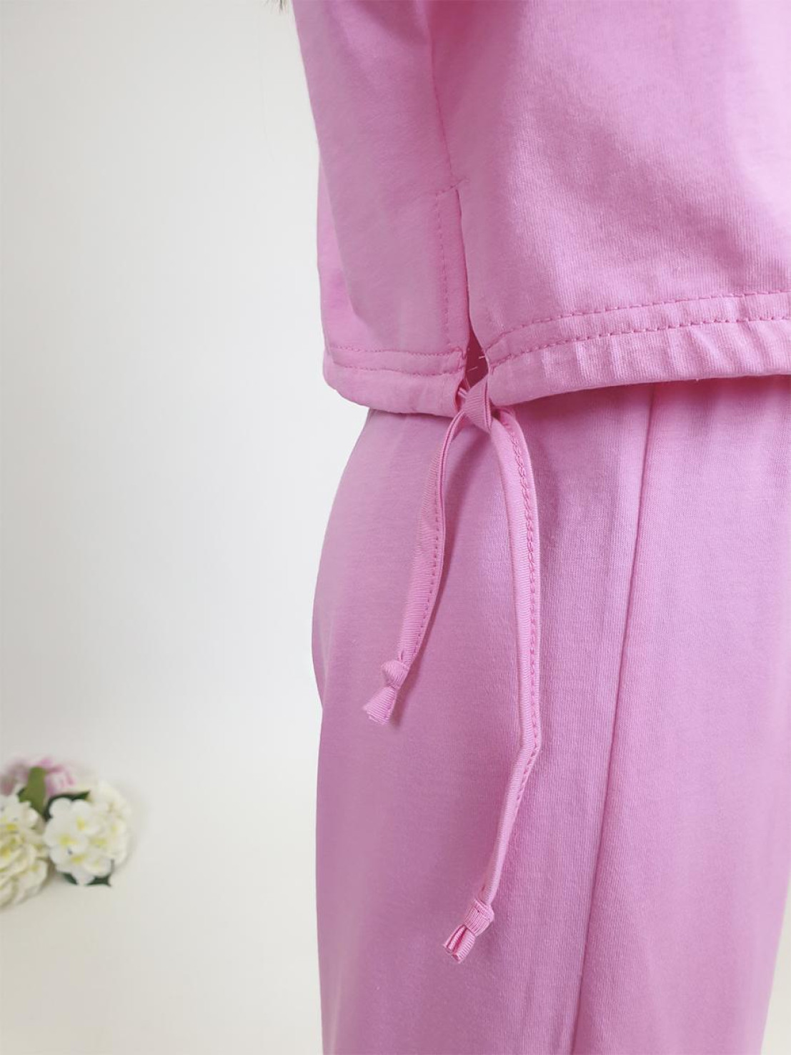 Кулирное полотно:100% х/б. Фуфайка-прямая,спущенное плечо,короткий рукав.Печать и вышивка пайетки на переде.Горловина обработана планкой,в низ изделия вставлен шнур и завязан сбоку. Брюки-длинные на поясе с резинкой,расширены к низу.