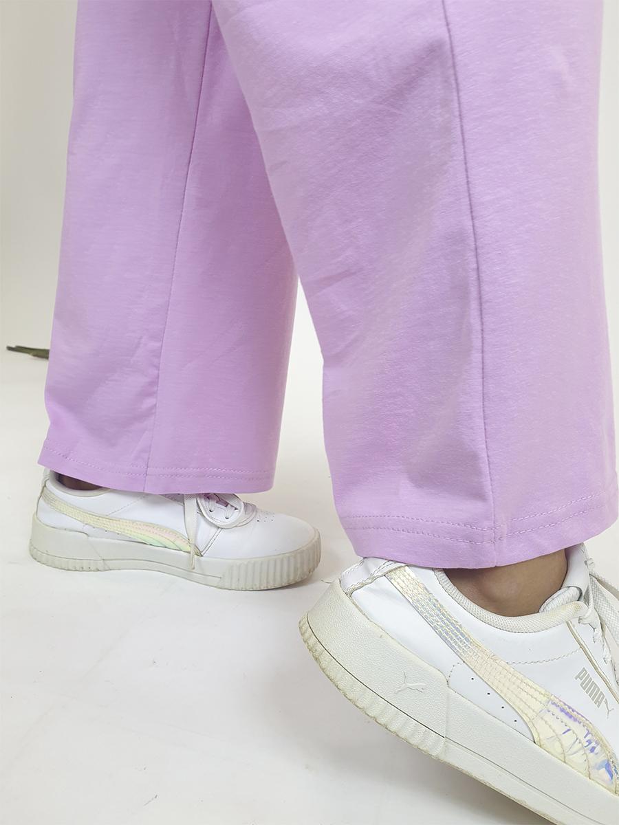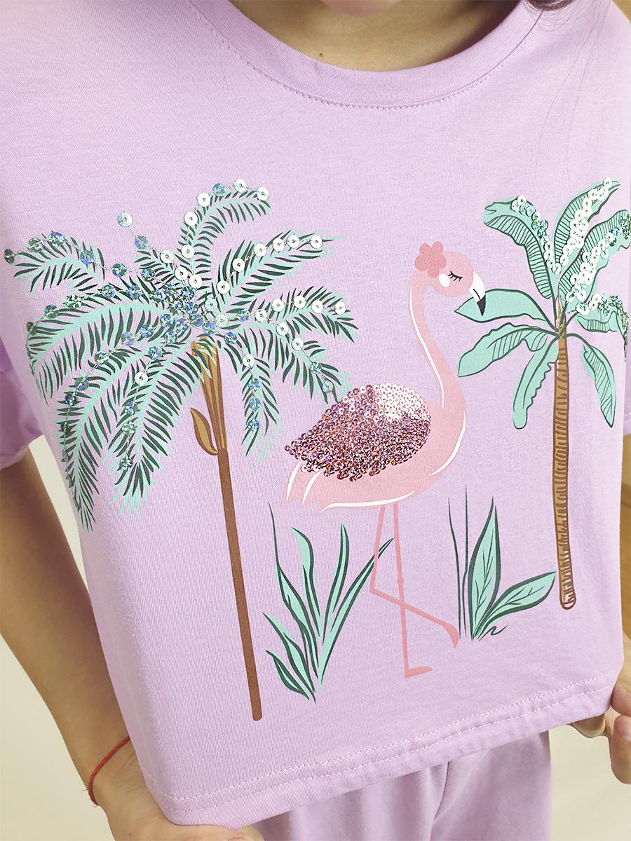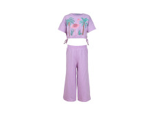 Кулирное полотно:100% х/б. Фуфайка-прямая,спущенное плечо,короткий рукав.Печать и вышивка пайетки на переде.Горловина обработана планкой,в низ изделия вставлен шнур и завязан сбоку. Брюки-длинные на поясе с резинкой,расширены к низу.