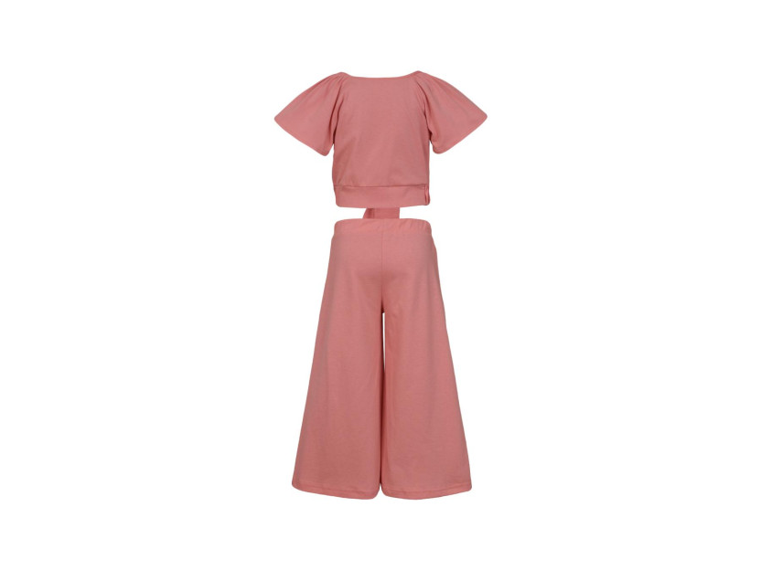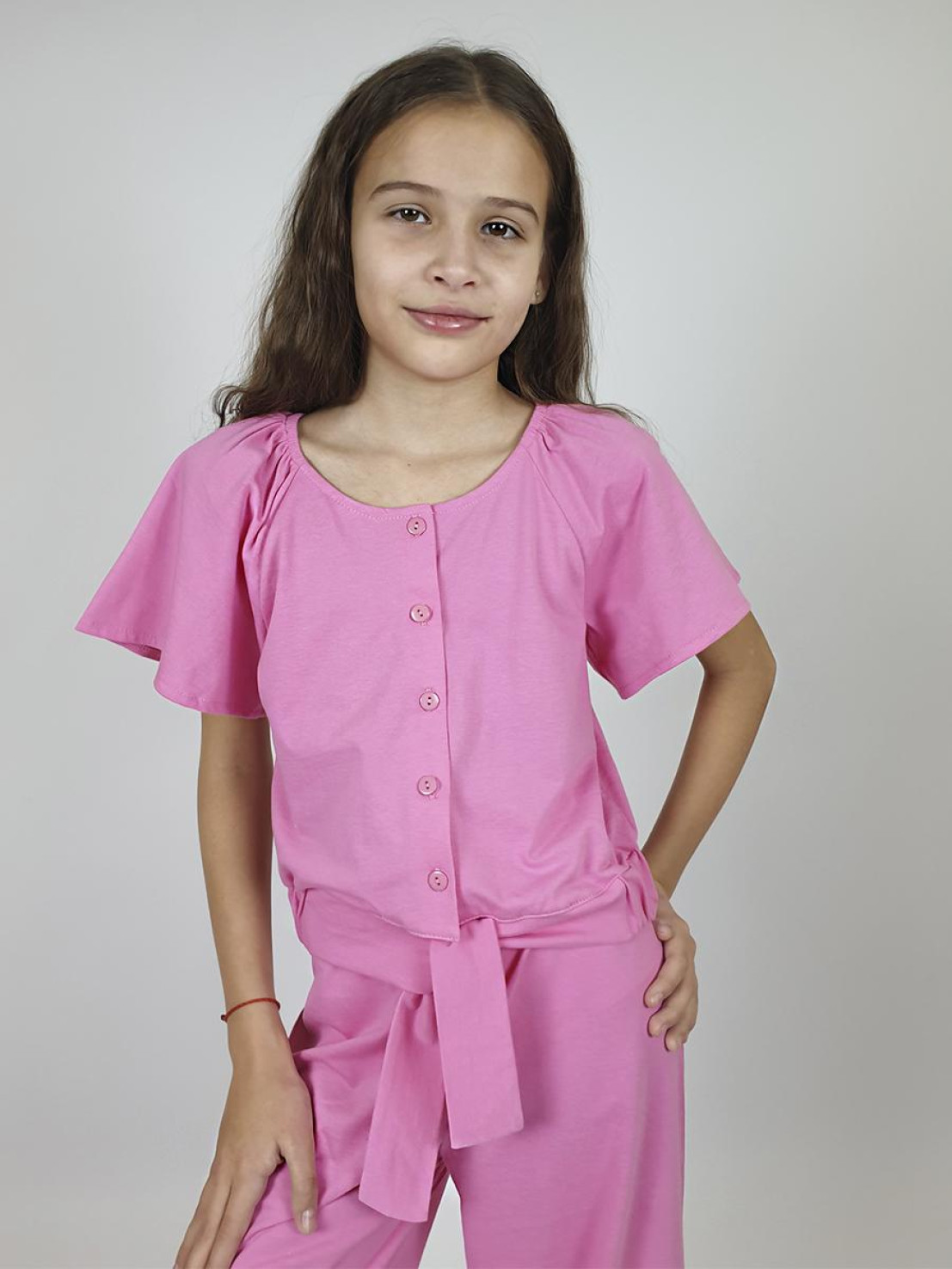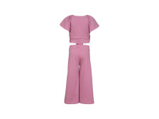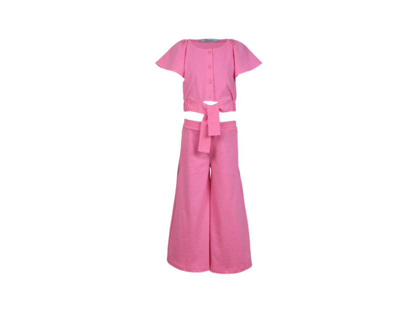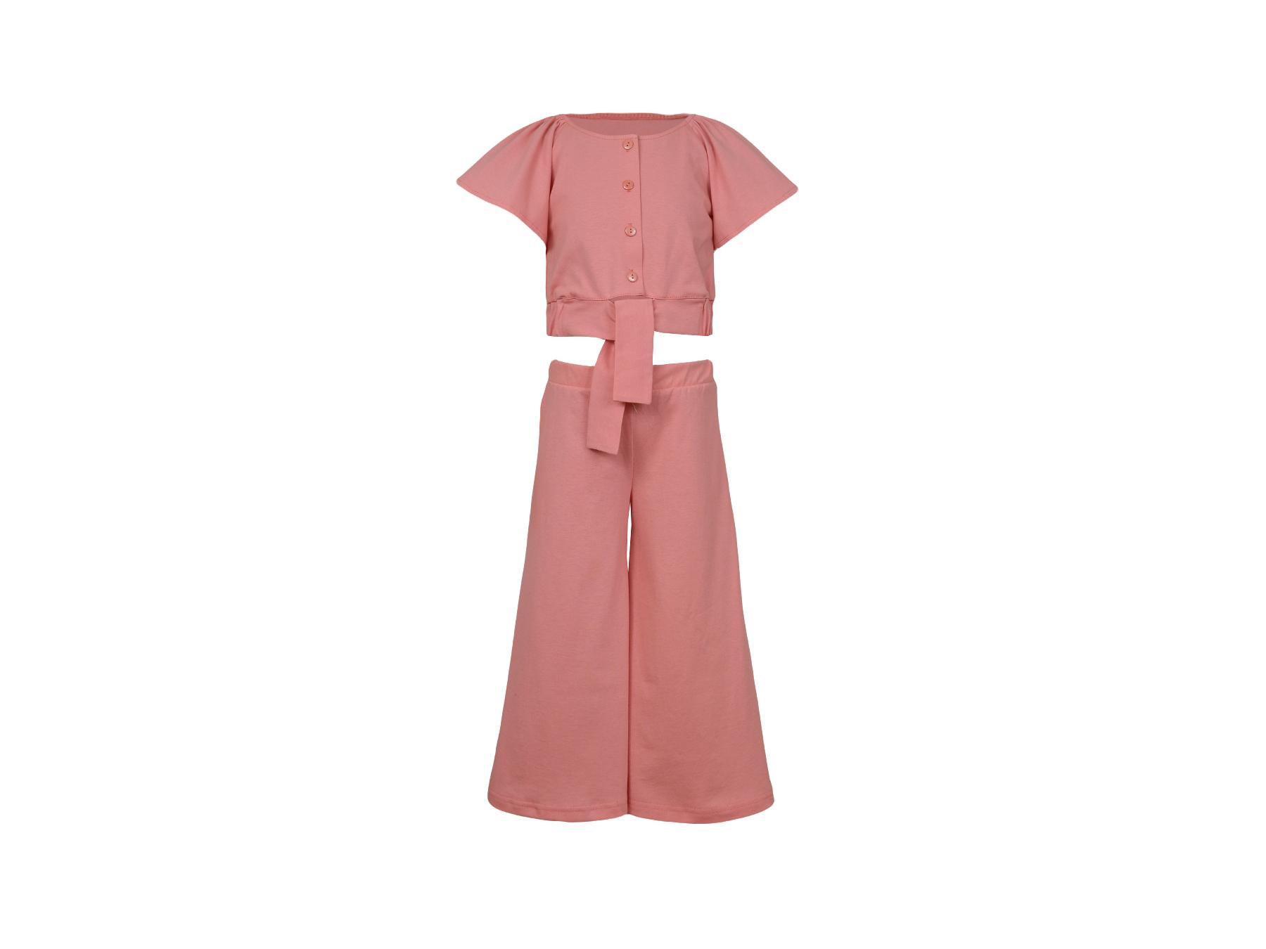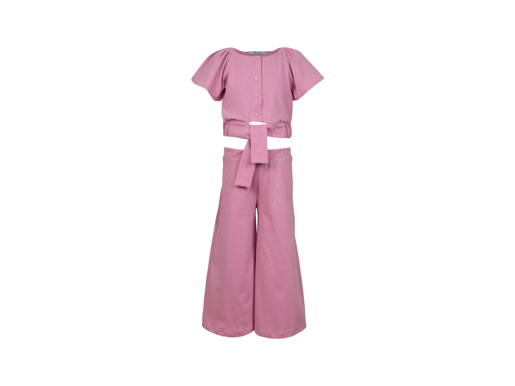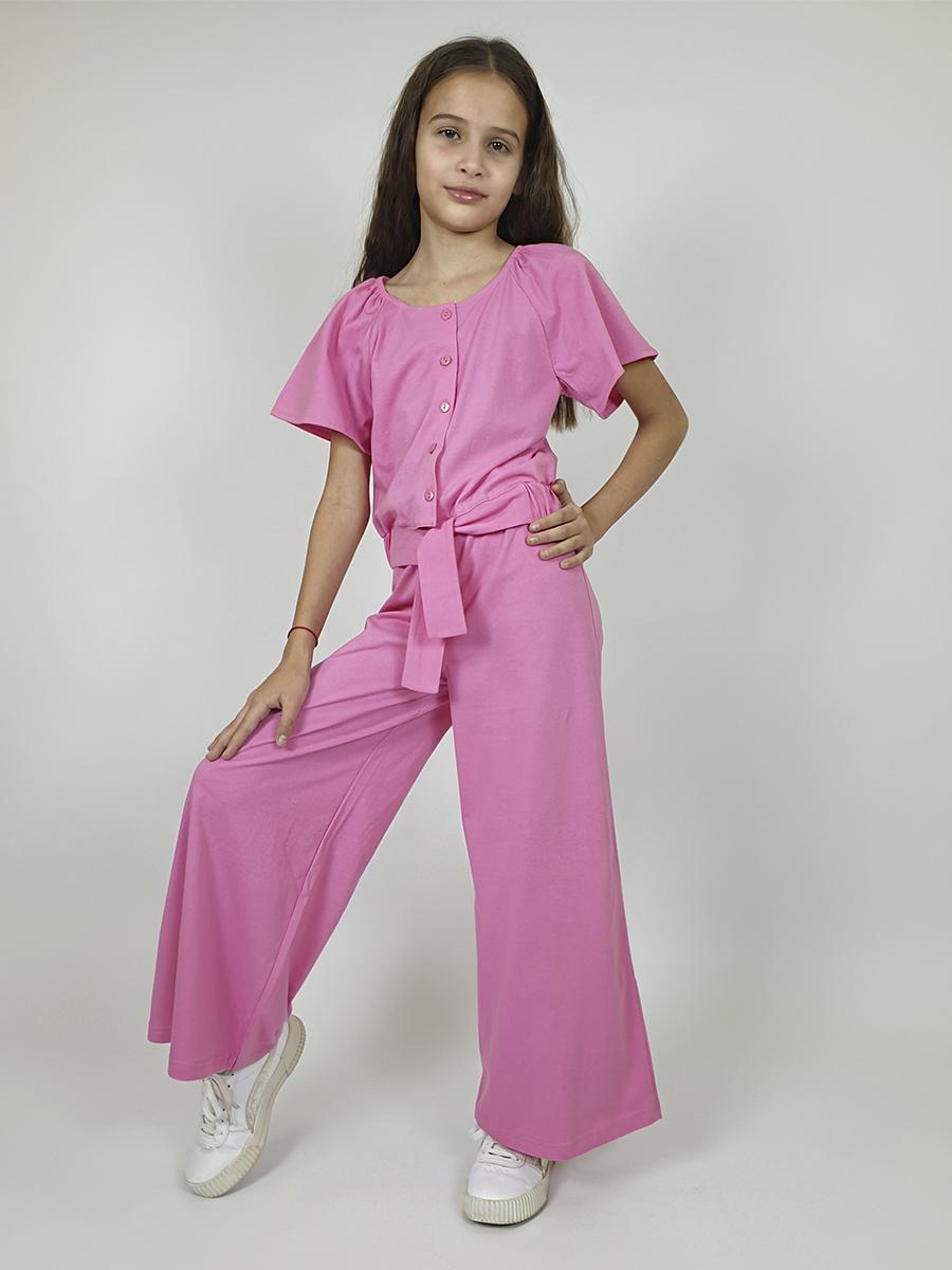Комплект для девочки. Кулирное полотно: 100% х/б. Фуфайка-прямая на поясе с резинкой и завязанными концами на переде.Рукав реглан,короткий в горловине собран на резинку.Центральная застежка на пуговицы.Вырез горловины переда и спинки подшит. Брюки-на поясе с резинкой,расширены к низу.