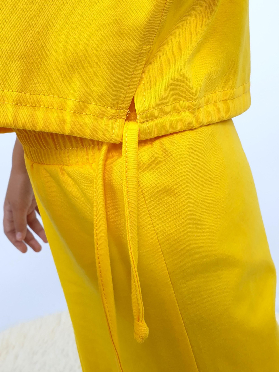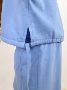 Кулирное полотно :100% х/б. Фуфайка-прямая,спущенное плечо,короткий рукав.Горловина обработана планкой,в низ изделия вставлен шнур и завязан сбоку. Брюки-на поясе с резинкой,расширены к низу.