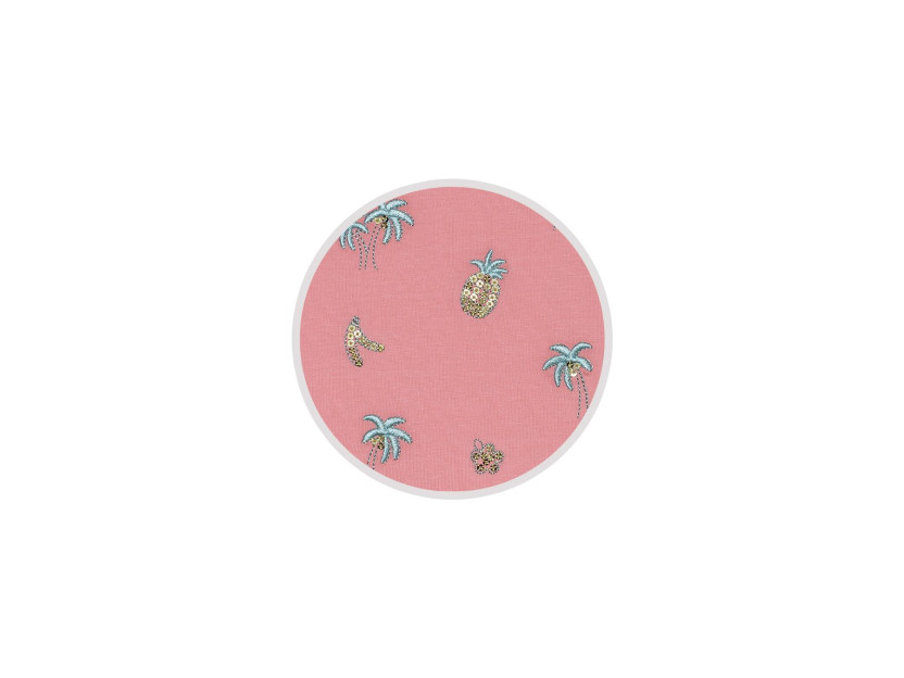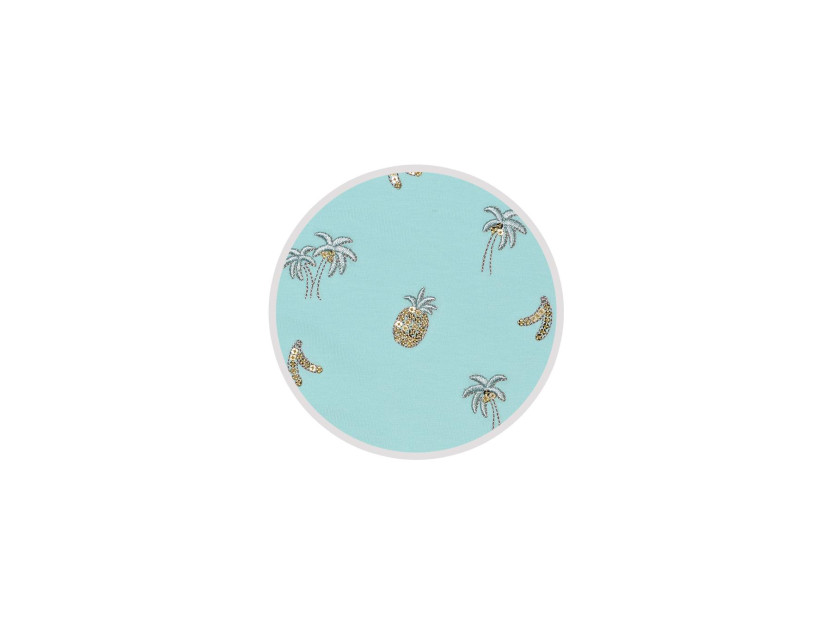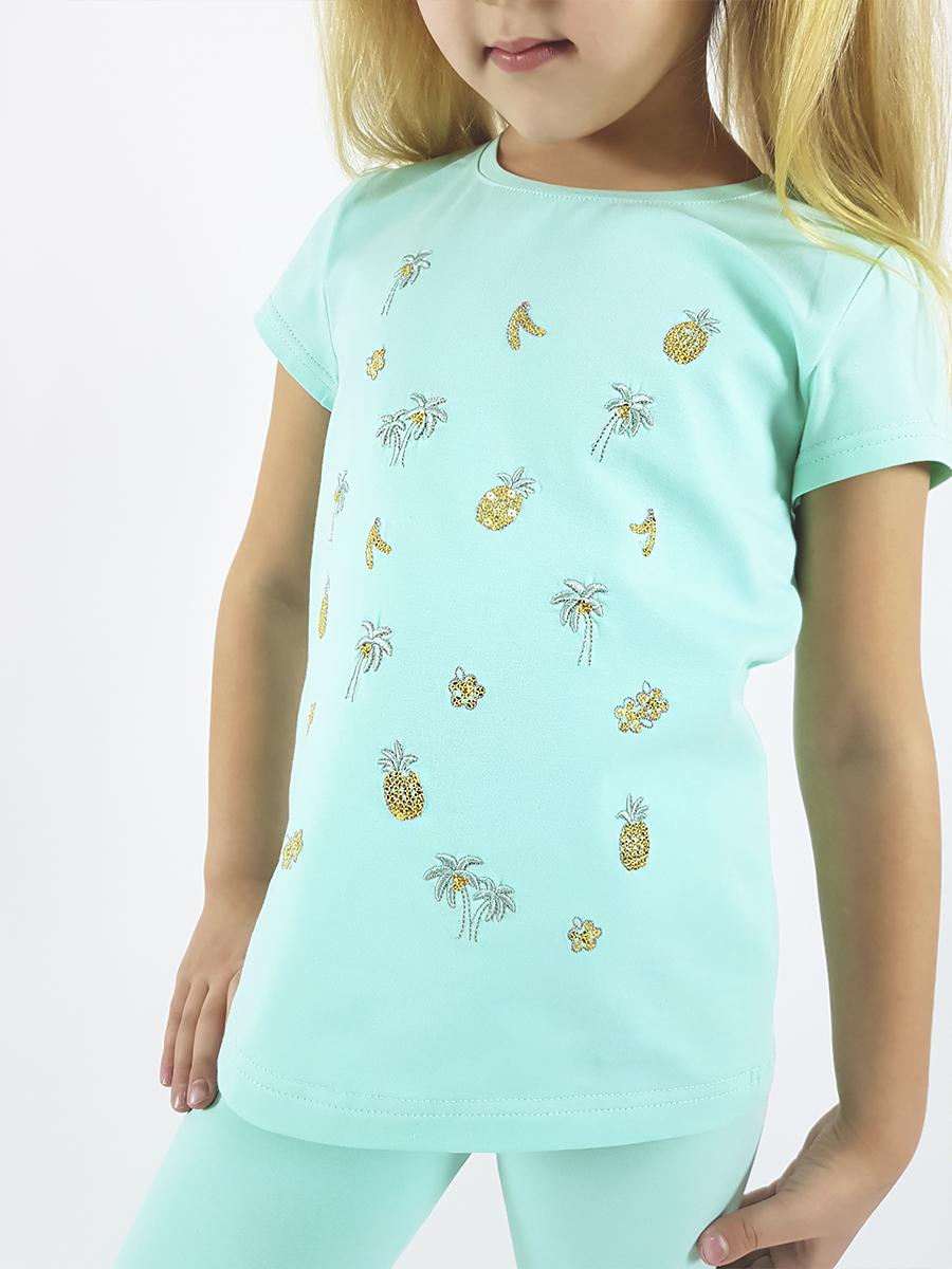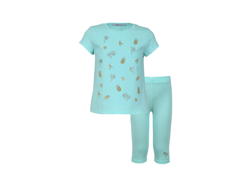 Кулирное полотно: 95% х/б.,5% лайкра. Фуфайка-полуприлегающий силуэт,вышивка(пайетки)на переде,короткий втачной рукав.Низ рукава и фуфайки подшит.Горловина обработана планкой. Лосины-укороченные с вышивкой на левой стороне внизу,вверху на резинке.