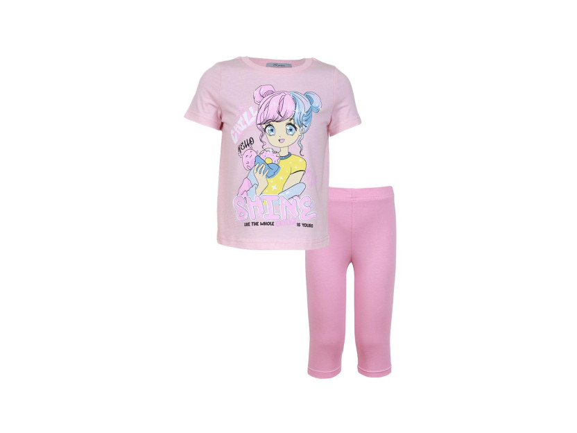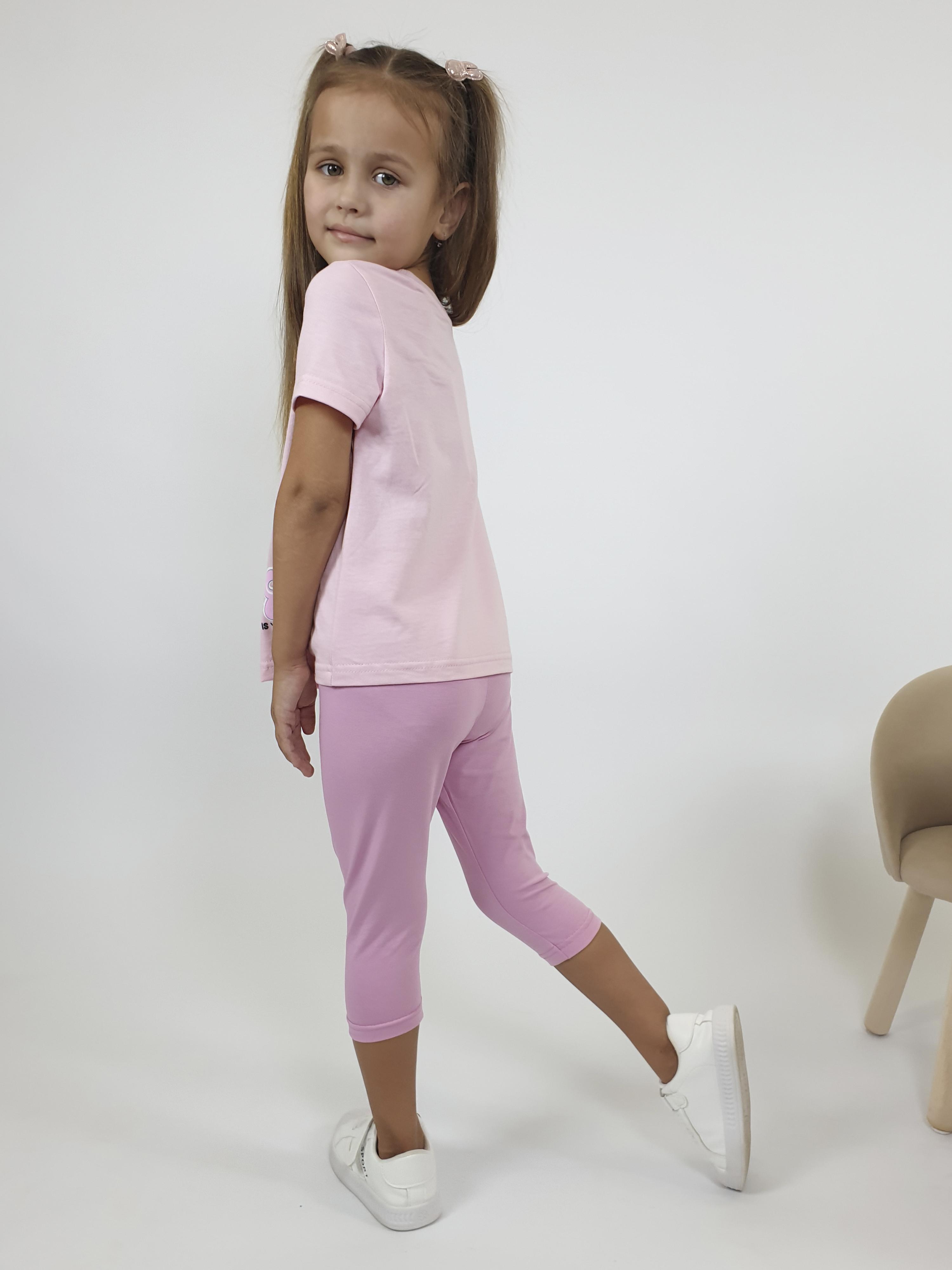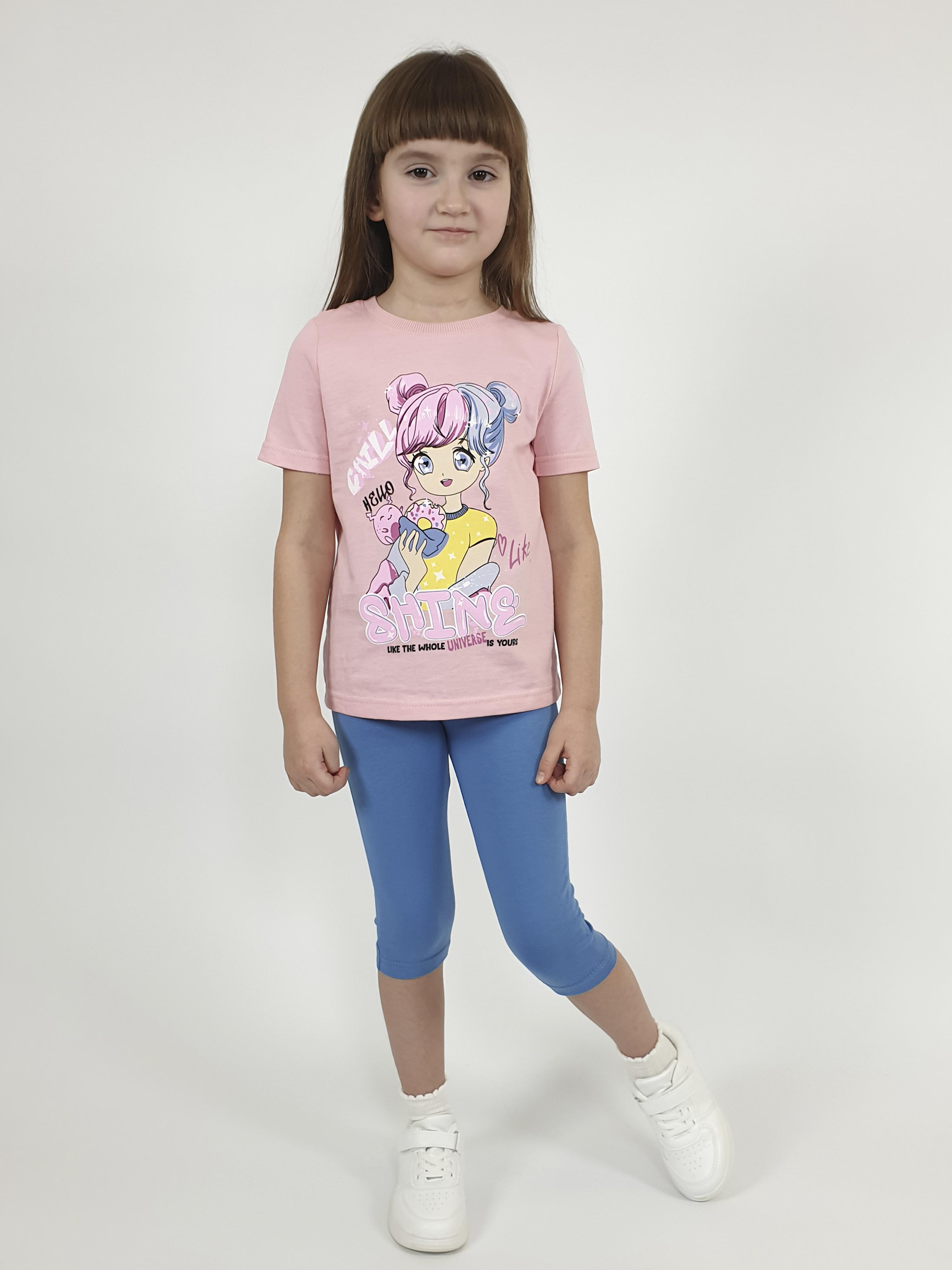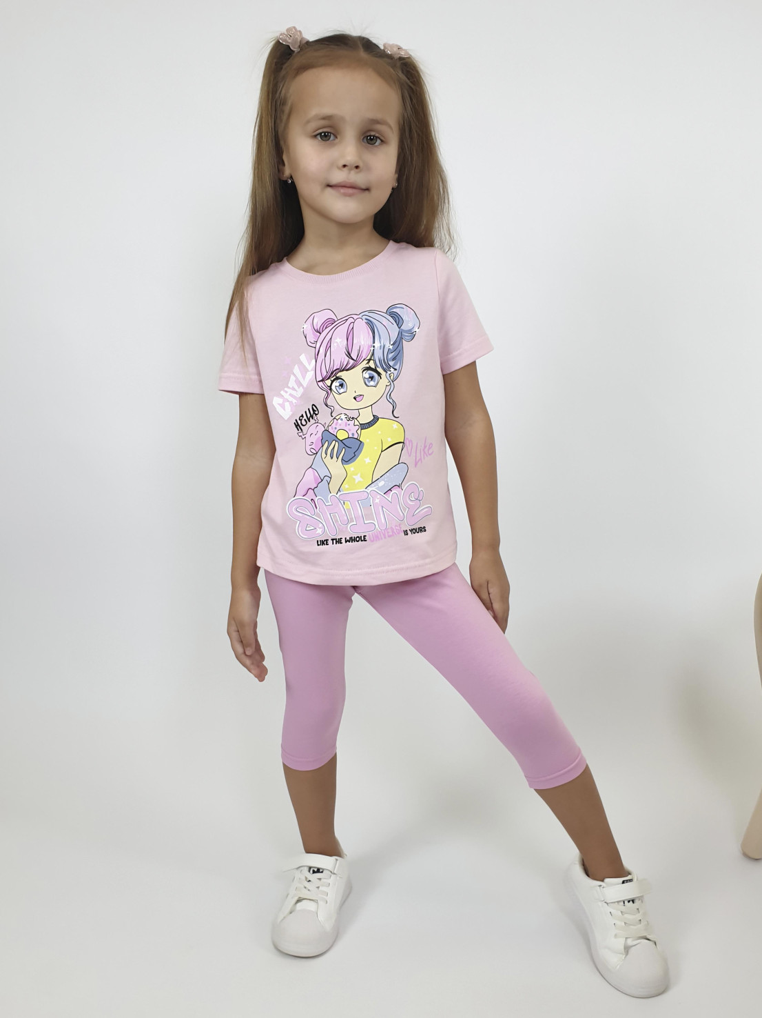 Кулирное полотно:фуфайка 100% х/б.,лосины 95% х/б.,5% лайкра. Фуфайка-прямой силуэт,печать на переде,короткий втачной рукав.Низ рукава и фуфайки подшит.Горловина обработана ластиком. Лосины-укороченные,вверху на резинке.