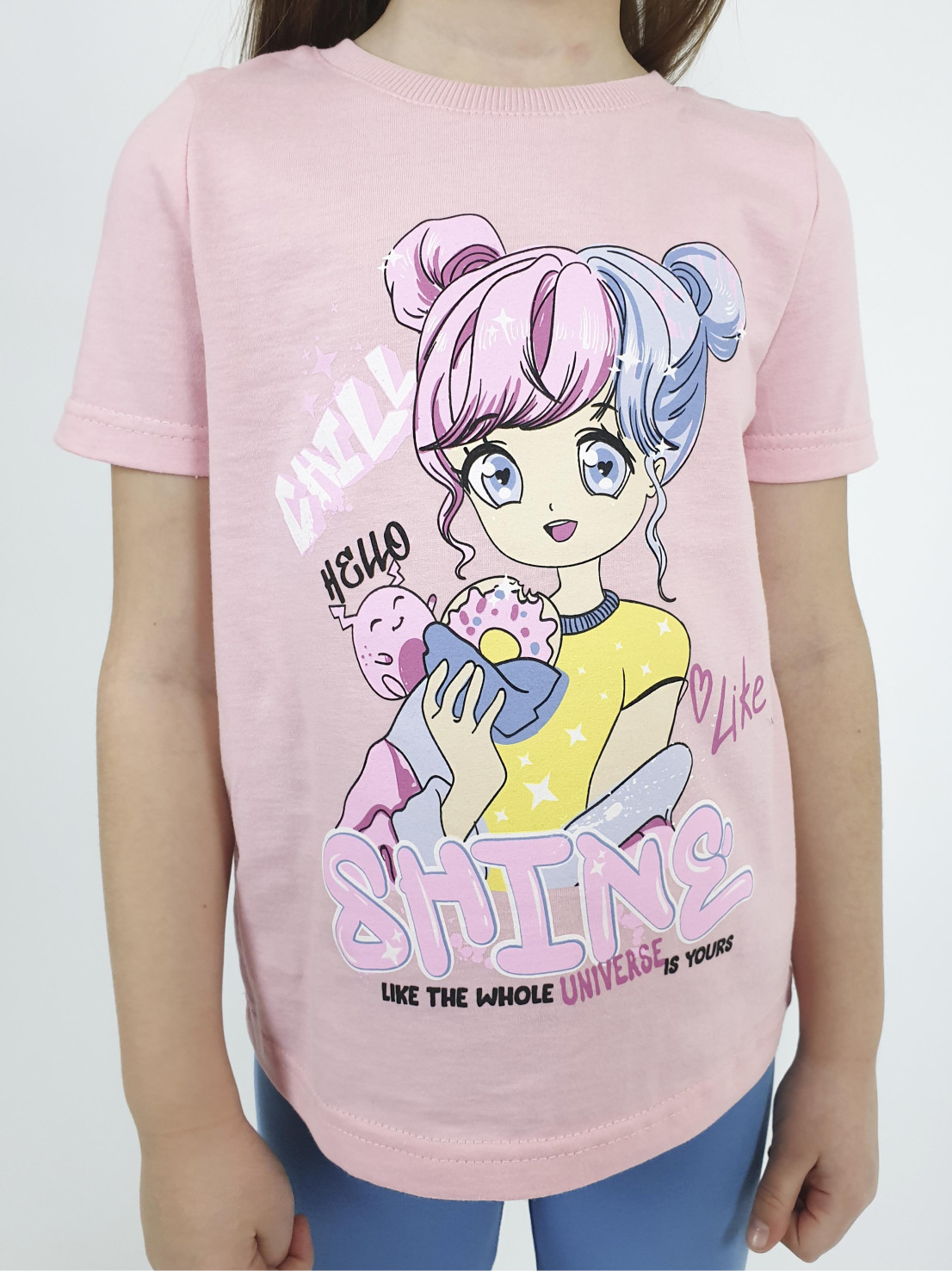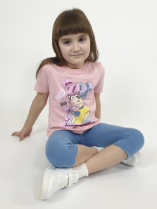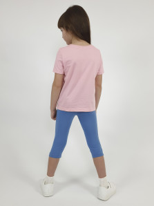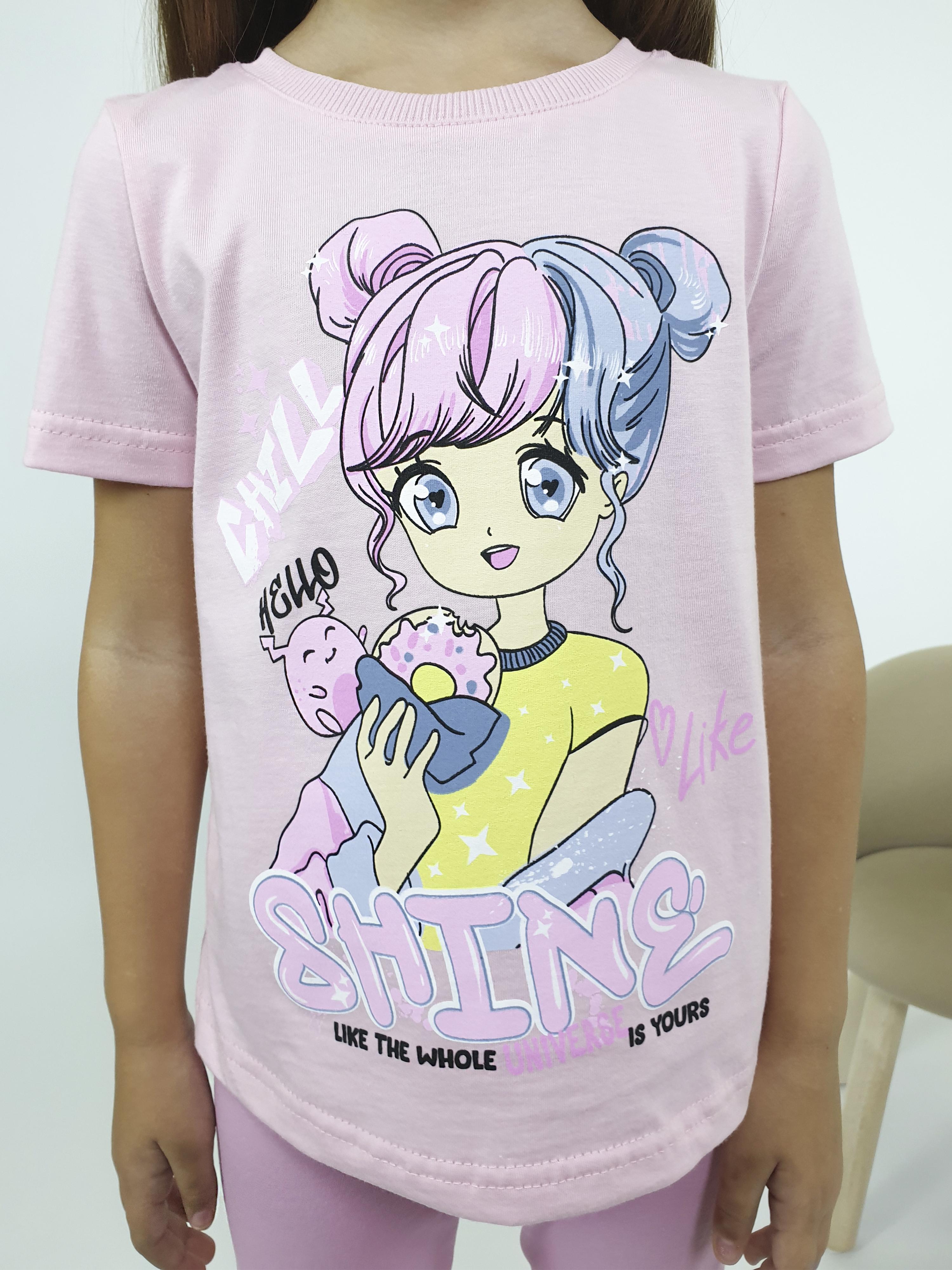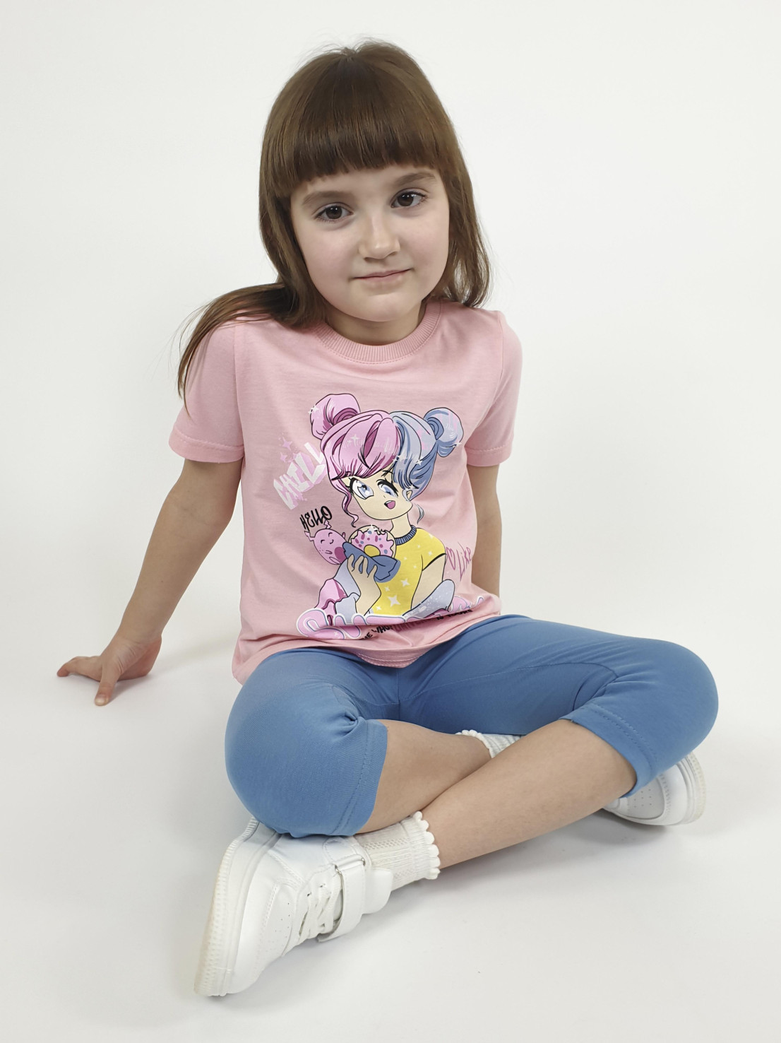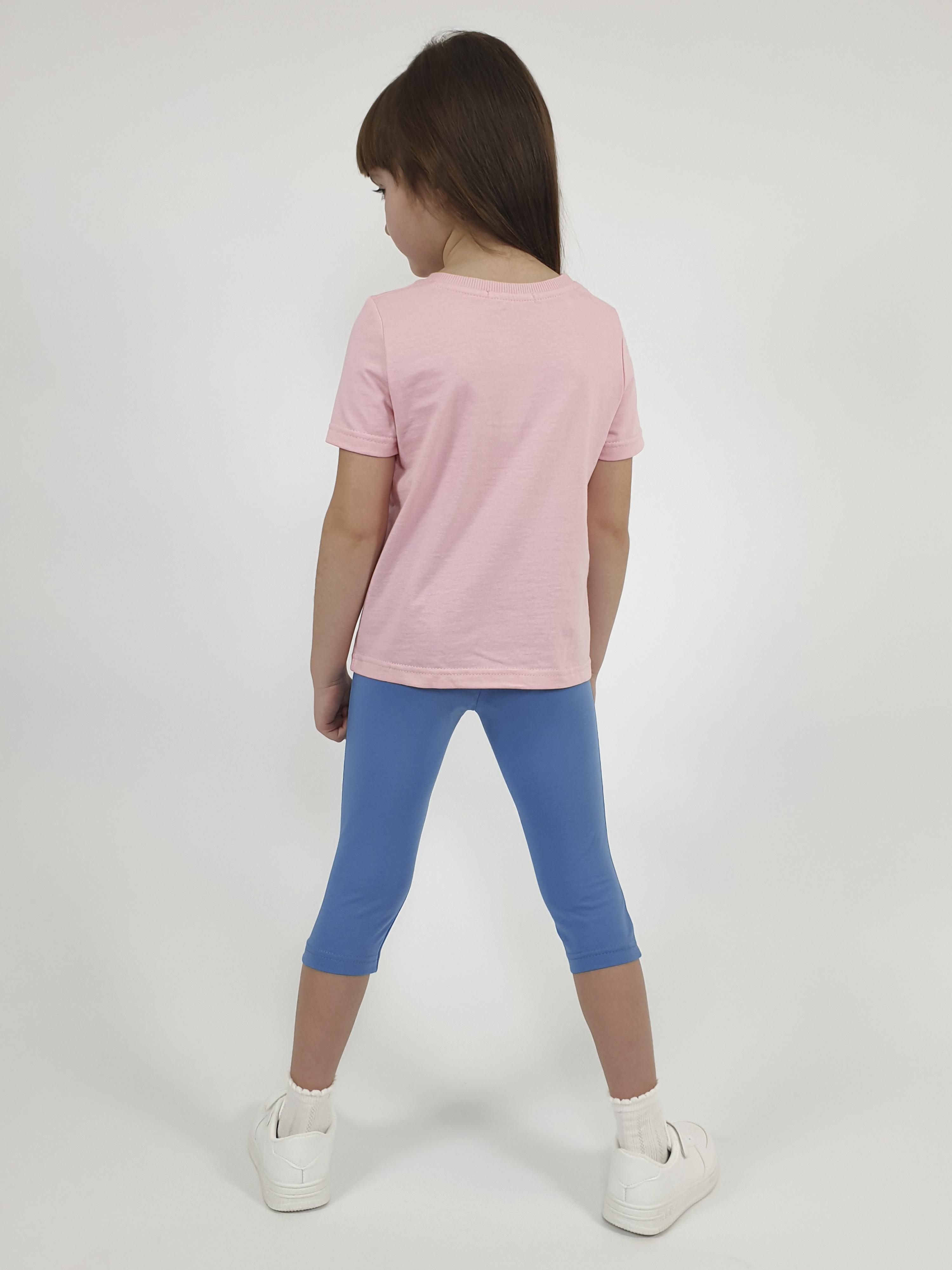 Кулирное полотно:фуфайка 100% х/б.,лосины 95% х/б.,5% лайкра. Фуфайка-прямой силуэт,печать на переде,короткий втачной рукав.Низ рукава и фуфайки подшит.Горловина обработана ластиком. Лосины-укороченные,вверху на резинке.