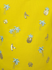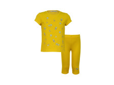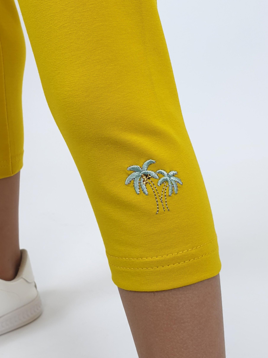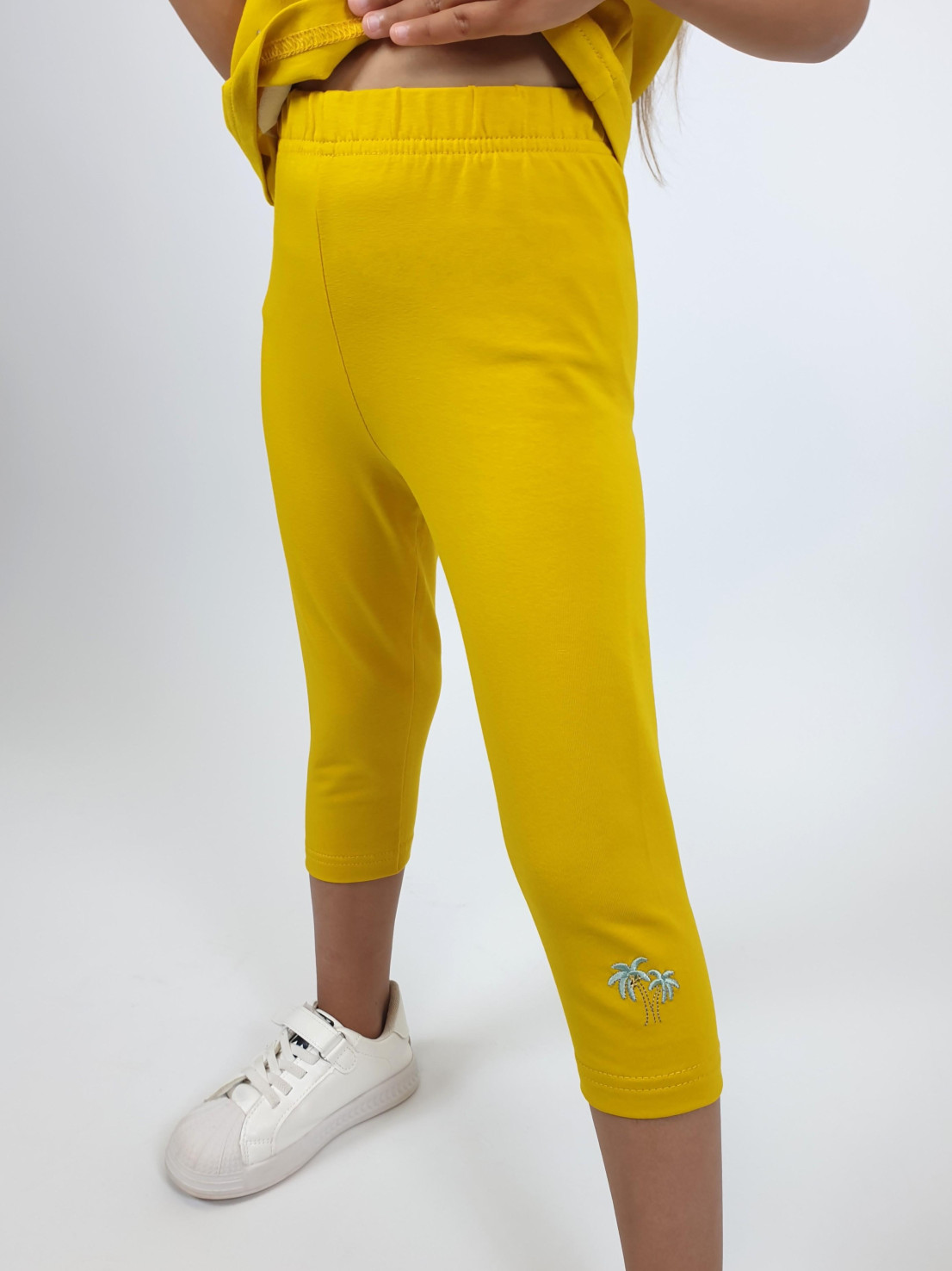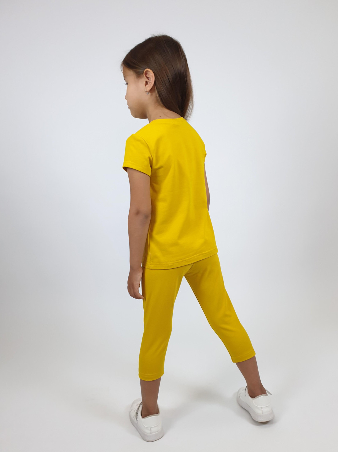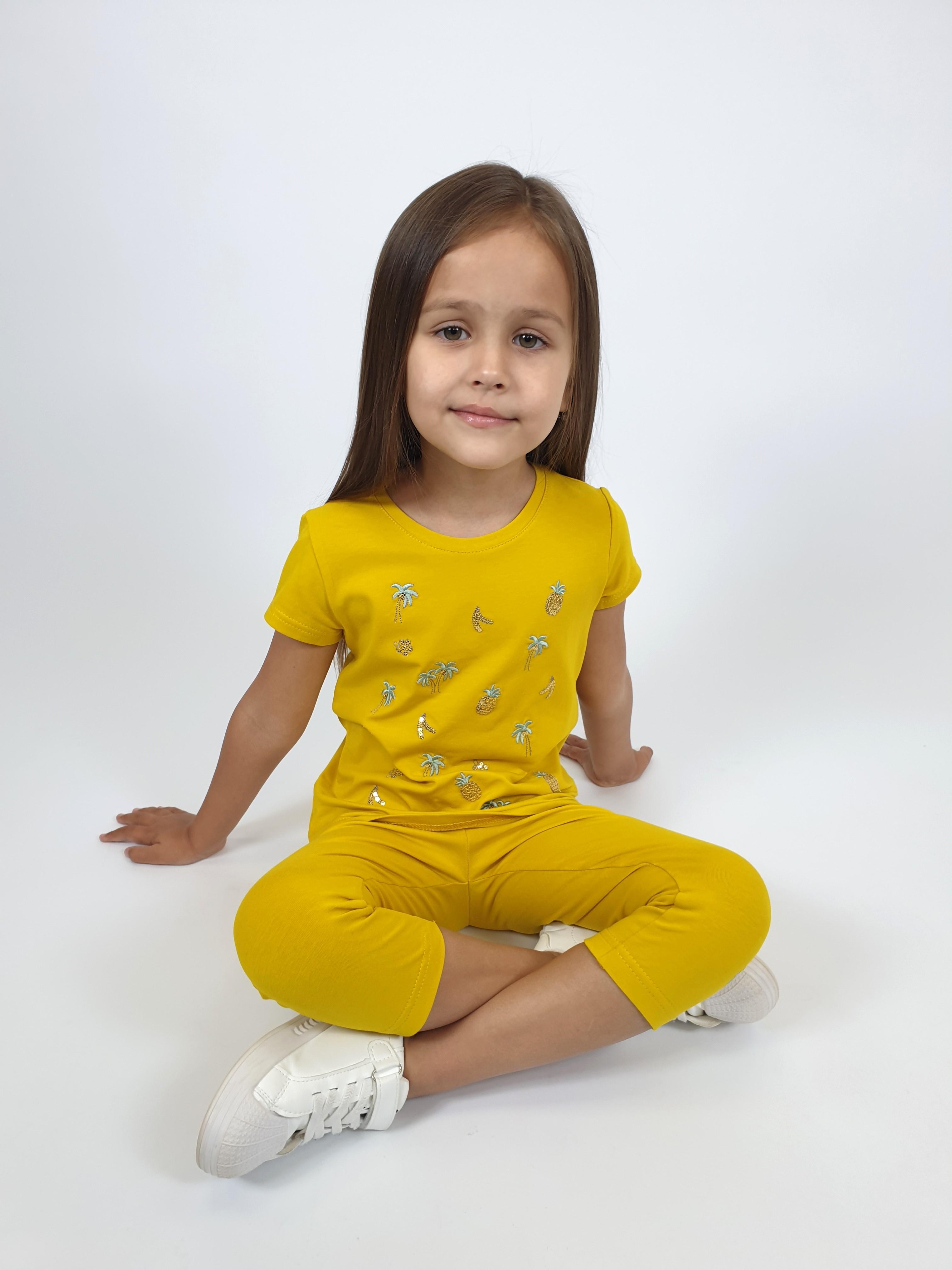 Кулирное полотно: 95% х/б.,5% лайкра. Фуфайка-полуприлегающий силуэт,вышивка(пайетки)на переде,короткий втачной рукав.Низ рукава и фуфайки подшит.Горловина обработана планкой. Лосины-укороченные с вышивкой на левой стороне внизу,вверху на резинке.