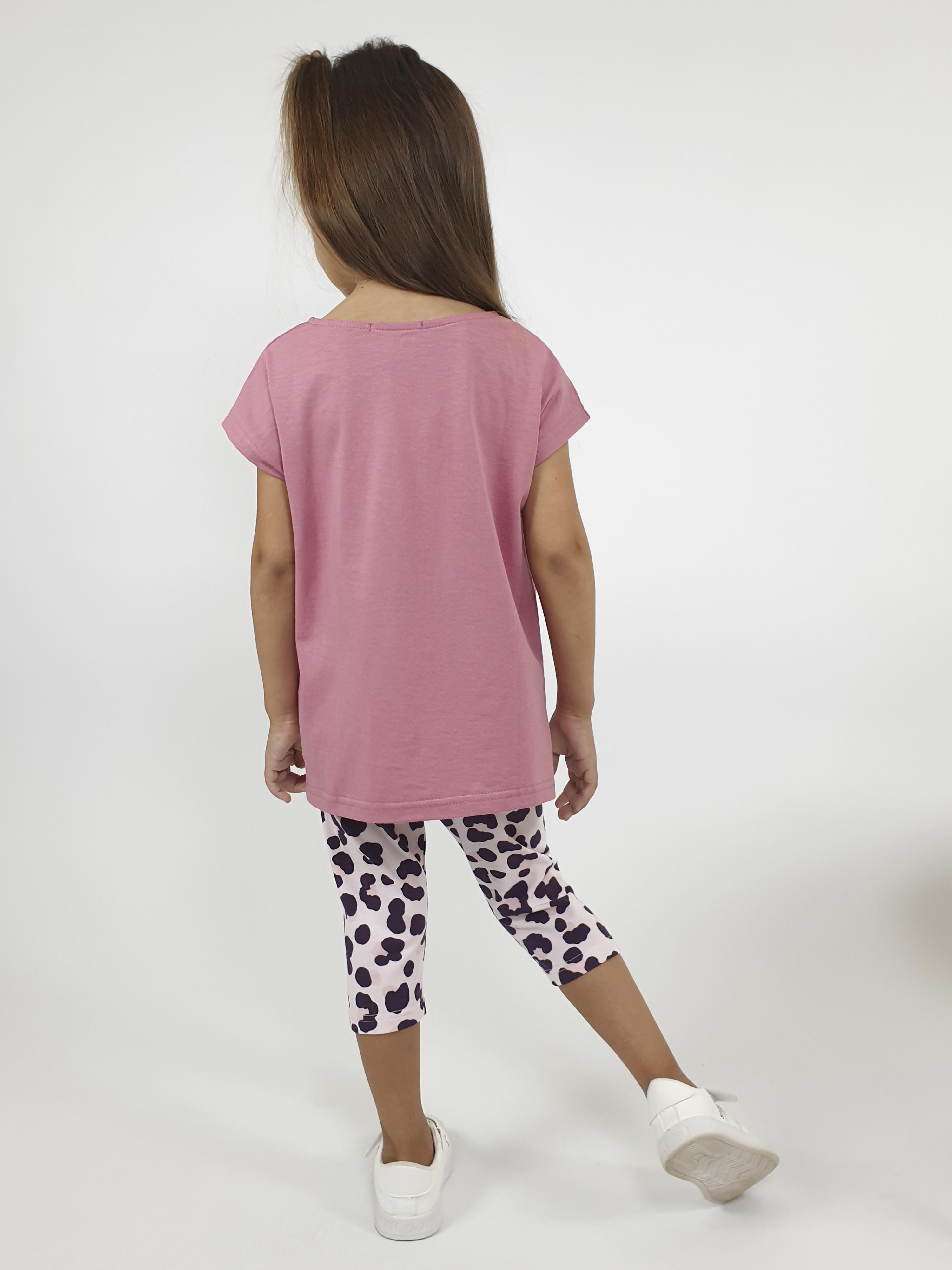Кулирное полотно:фуфайка 100% х/б.,лосины 95% х/б,5% лайкра. Фуфайка-прямой силуэт,удлиненная спинка с разрезами,перед с вышивкой(пайетки).Спущенное плечо,горловина окантована и подшита. Лосины-укороченные на резинке.