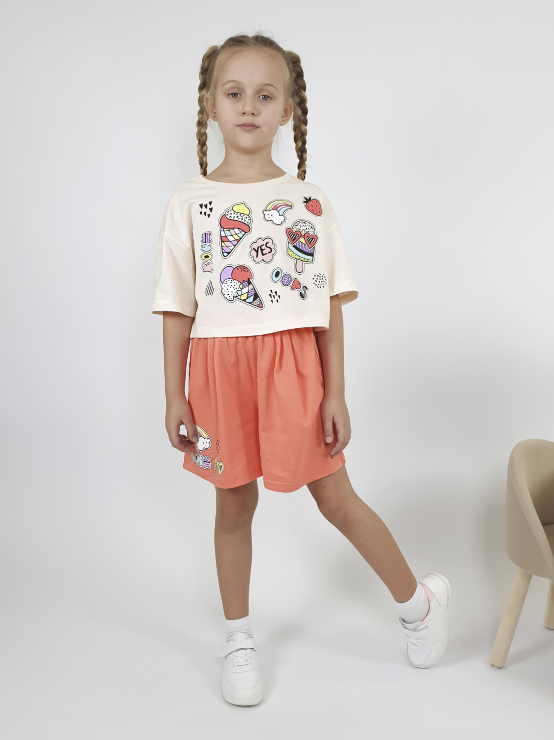Кулирное полотно:100% х/б. Фуфайка(оверсайз)-укороченная,спущенное плечо,короткий рукав.Печать на переде,горловина обработана планкой. Шорты-короткие,складки спереди,два боковых кармана,пояс на резинке.Печать на правой передней половинке внизу.