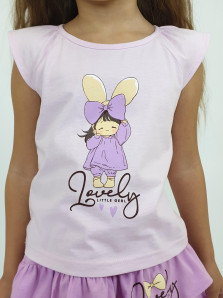Кулирное полотно: 100% х/б. Фуфайка-прямого силуэта,укороченная,рукав реглан со сборкой,горловина окантована.Печать по переду. Юбка-на кокетке с резинкой и двумя рюшами.Печать на переде верхней рюши с левой стороны.