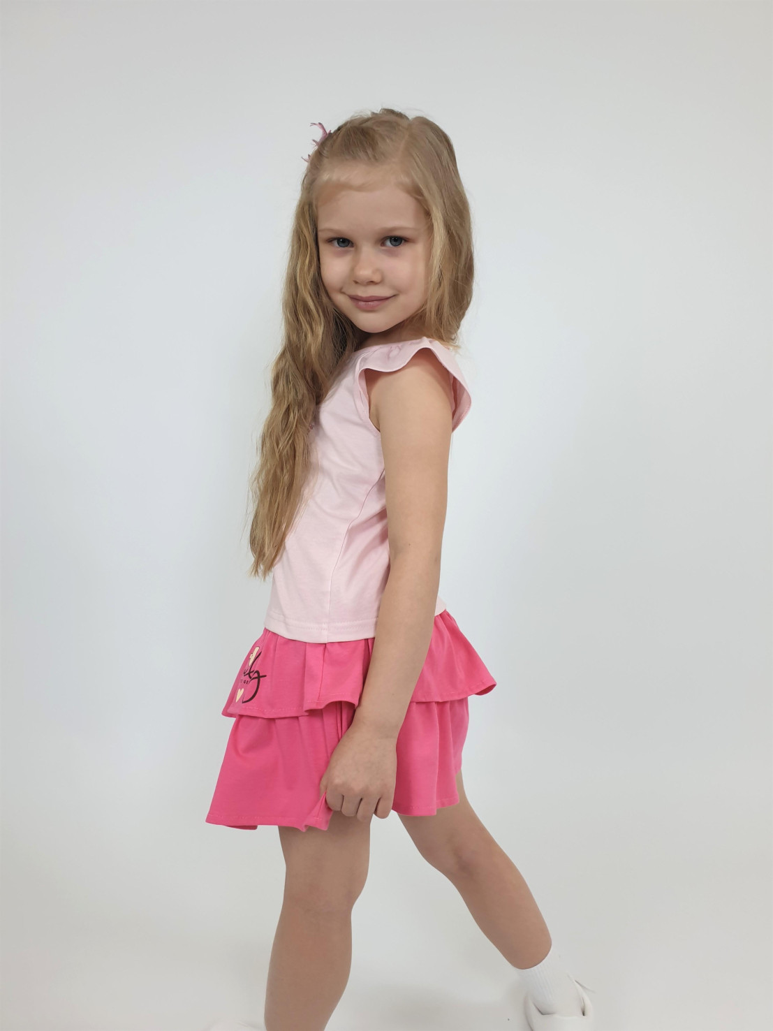 Кулирное полотно: 100% х/б. Фуфайка-прямого силуэта,укороченная,рукав реглан со сборкой,горловина окантована.Печать по переду. Юбка-на кокетке с резинкой и двумя рюшами.Печать на переде верхней рюши с левой стороны.