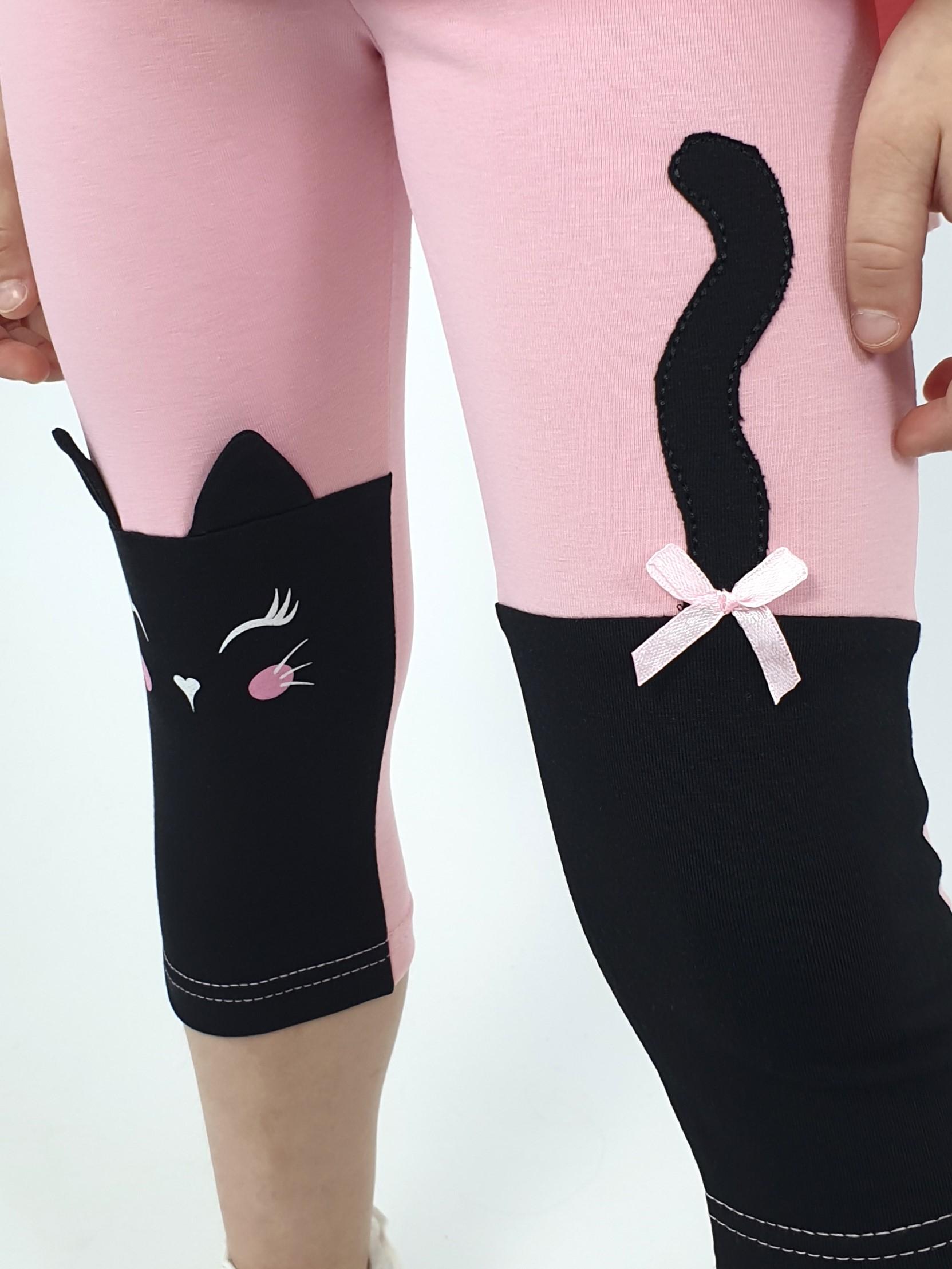 Кулирное полотно:95% х/б,5% лайкра. Фуфайка-прямой силуэт,удлиненная спинка с разрезами,перед с печатью.Спущенное плечо,горловина окантована и подшита. Лосины-укороченные,передние половинки с подрезами.Вышивка-аппликация слева,печать на правой передней стороне.Отделочный бантик.
