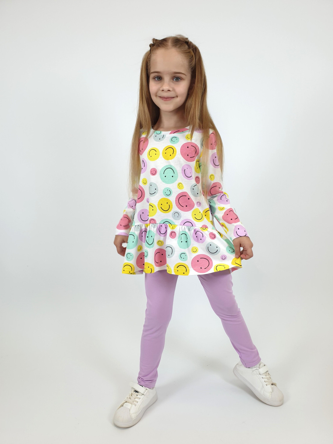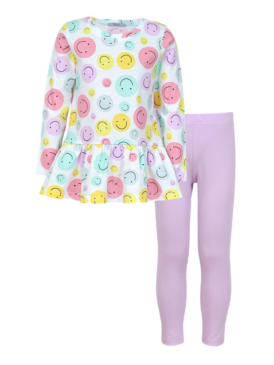 Кулирное полотно:фуфайка 100% х/б.,лосины 95% х/б,5% лайкра. Фуфайка-силуэт трапеция,внизу волан.Рукав втачной,длинный.Горловина обработана планкой. Лосины-длинные,вверху на резинке.