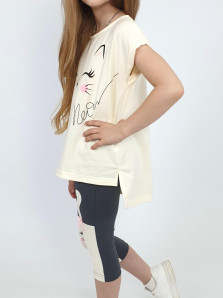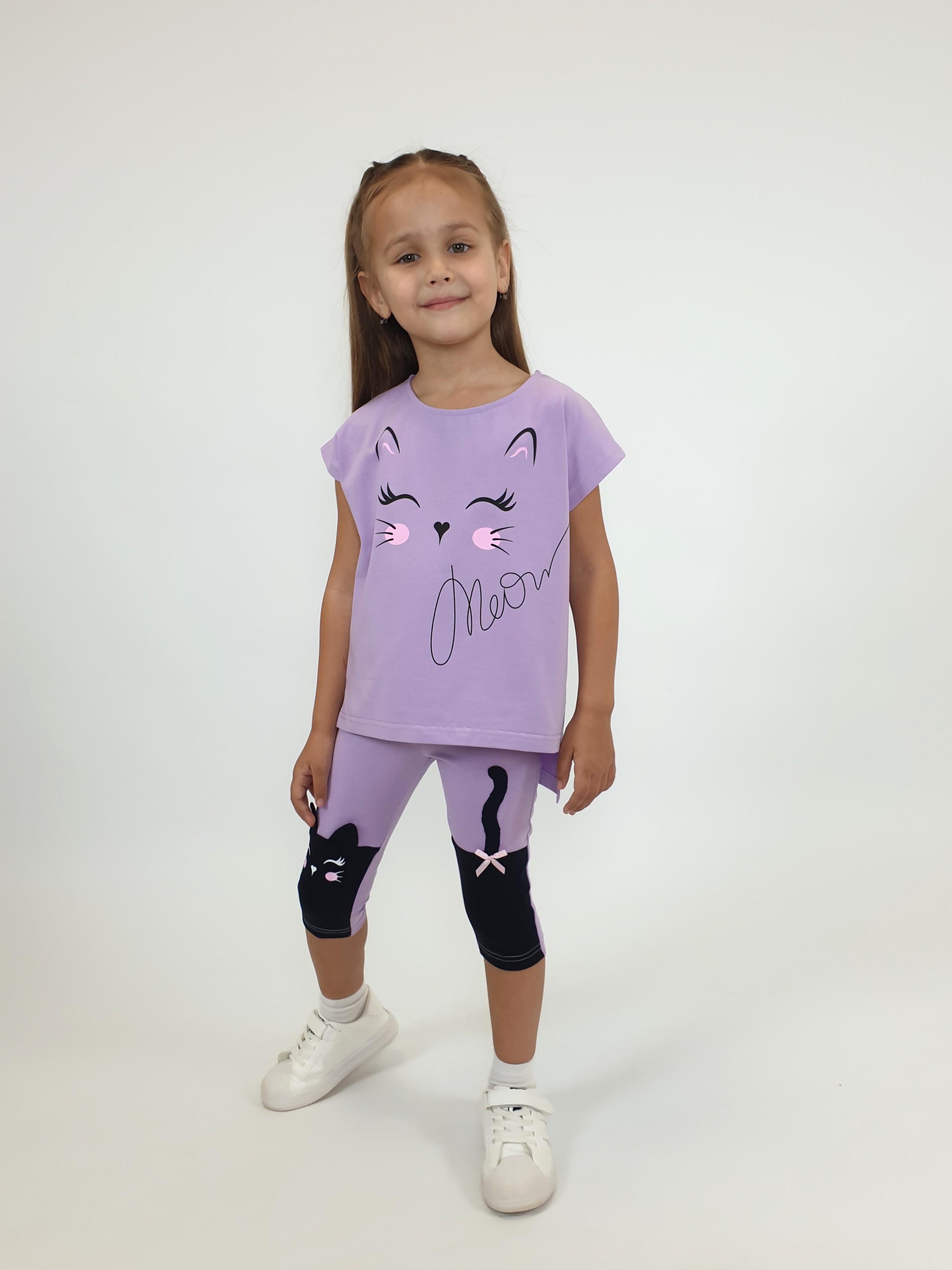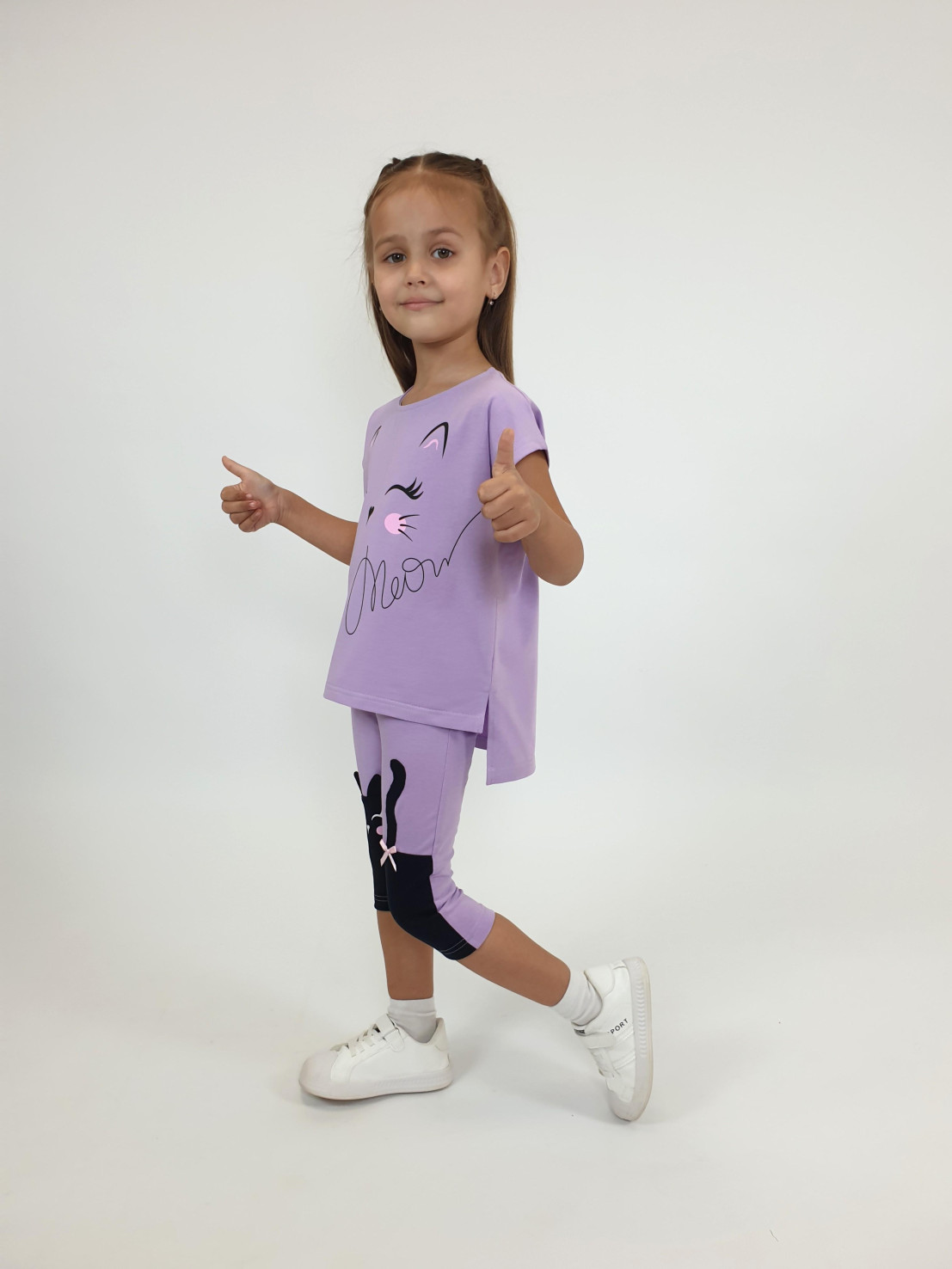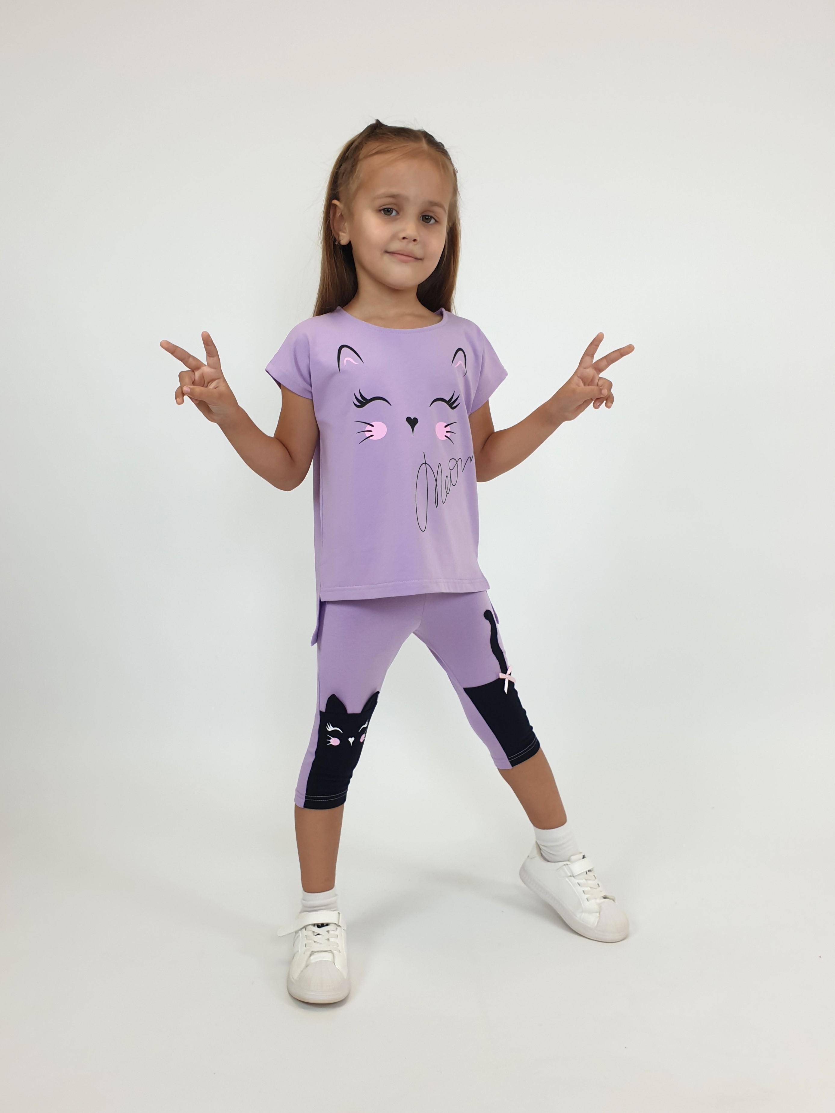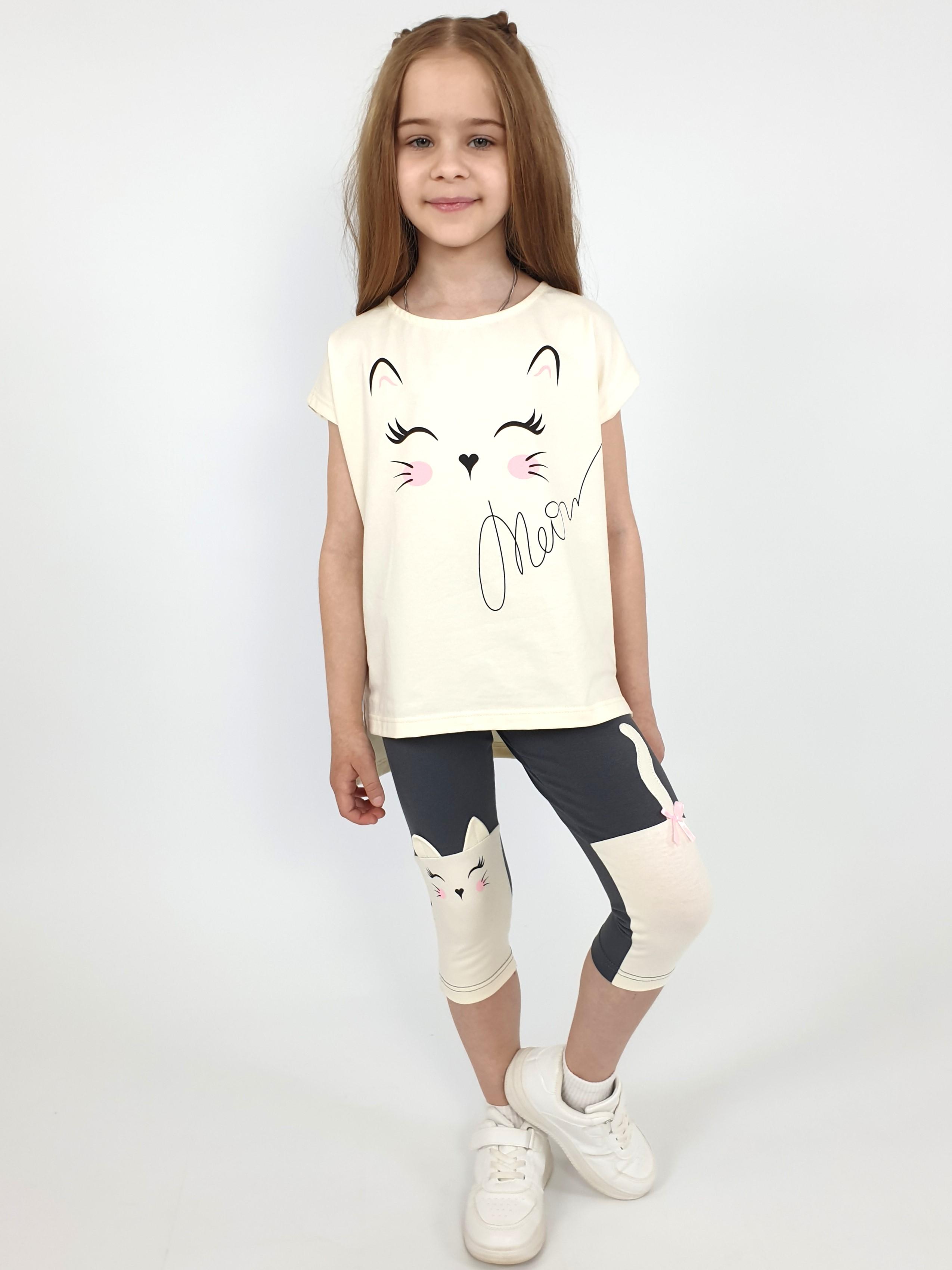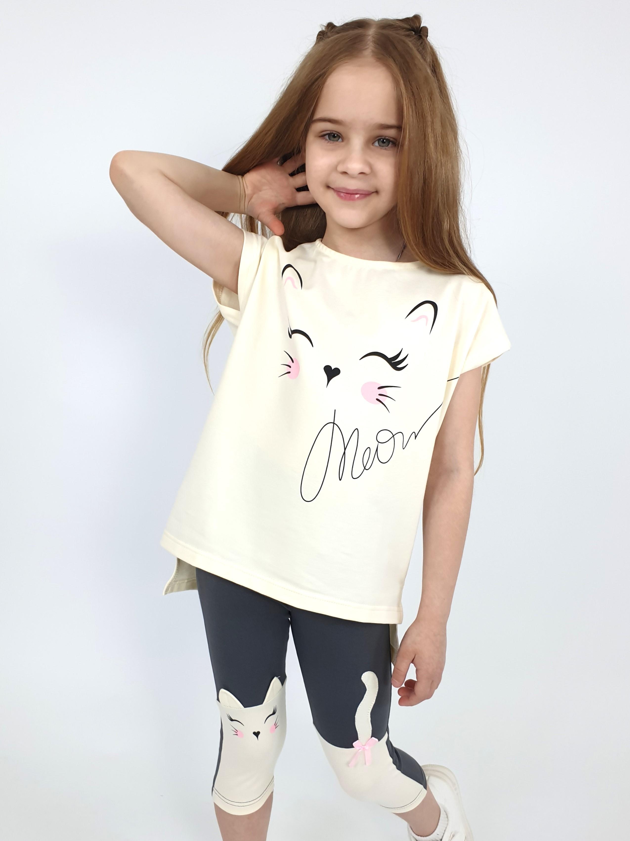 Кулирное полотно:95% х/б,5% лайкра. Фуфайка-прямой силуэт,удлиненная спинка с разрезами,перед с печатью.Спущенное плечо,горловина окантована и подшита. Лосины-укороченные,передние половинки с подрезами.Вышивка-аппликация слева,печать на правой передней стороне.Отделочный бантик.