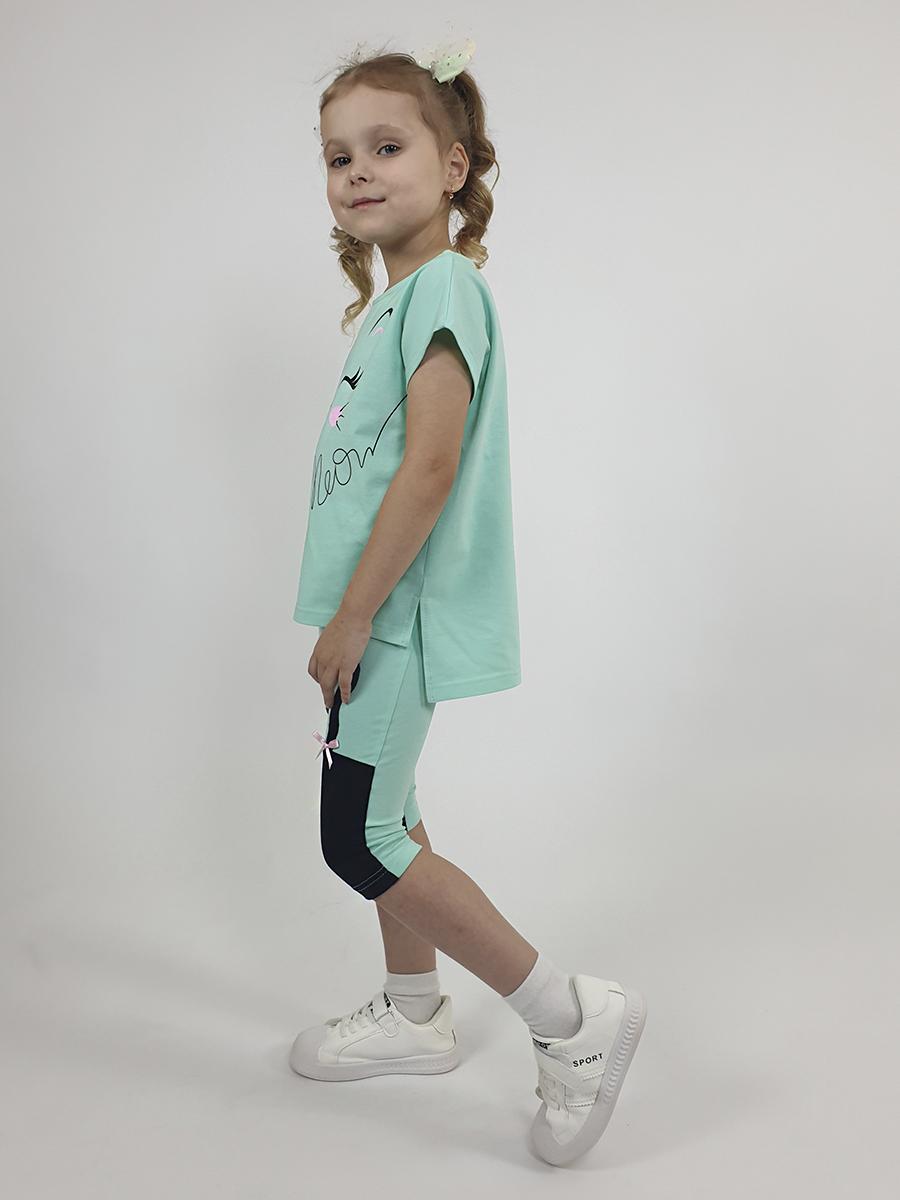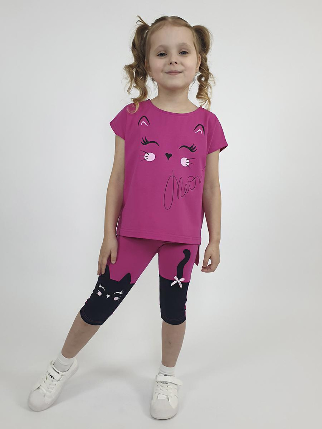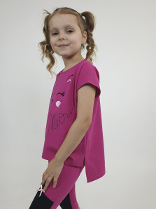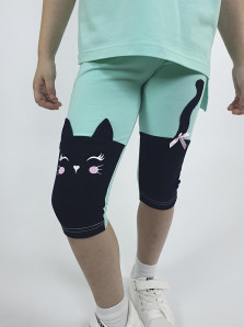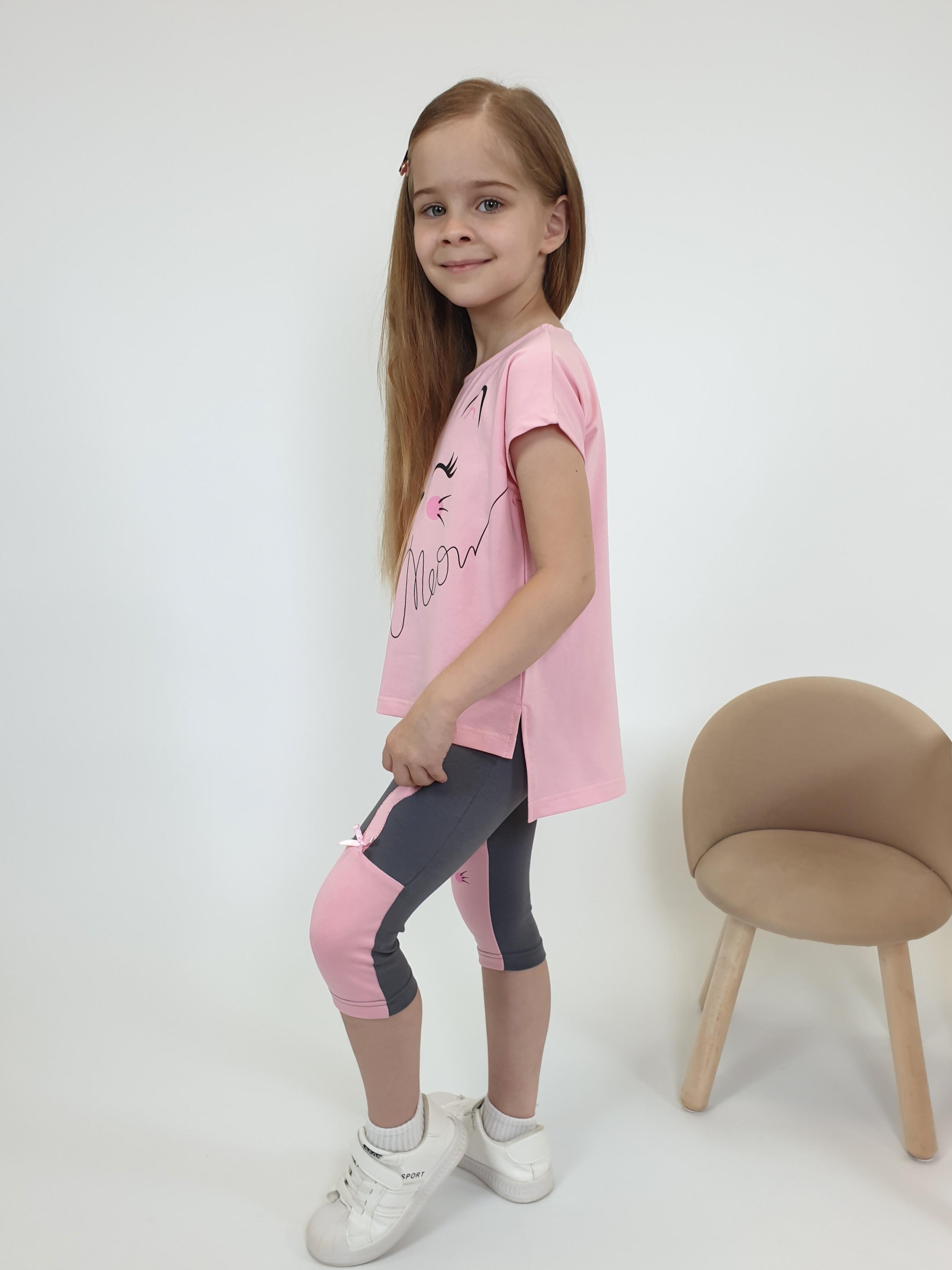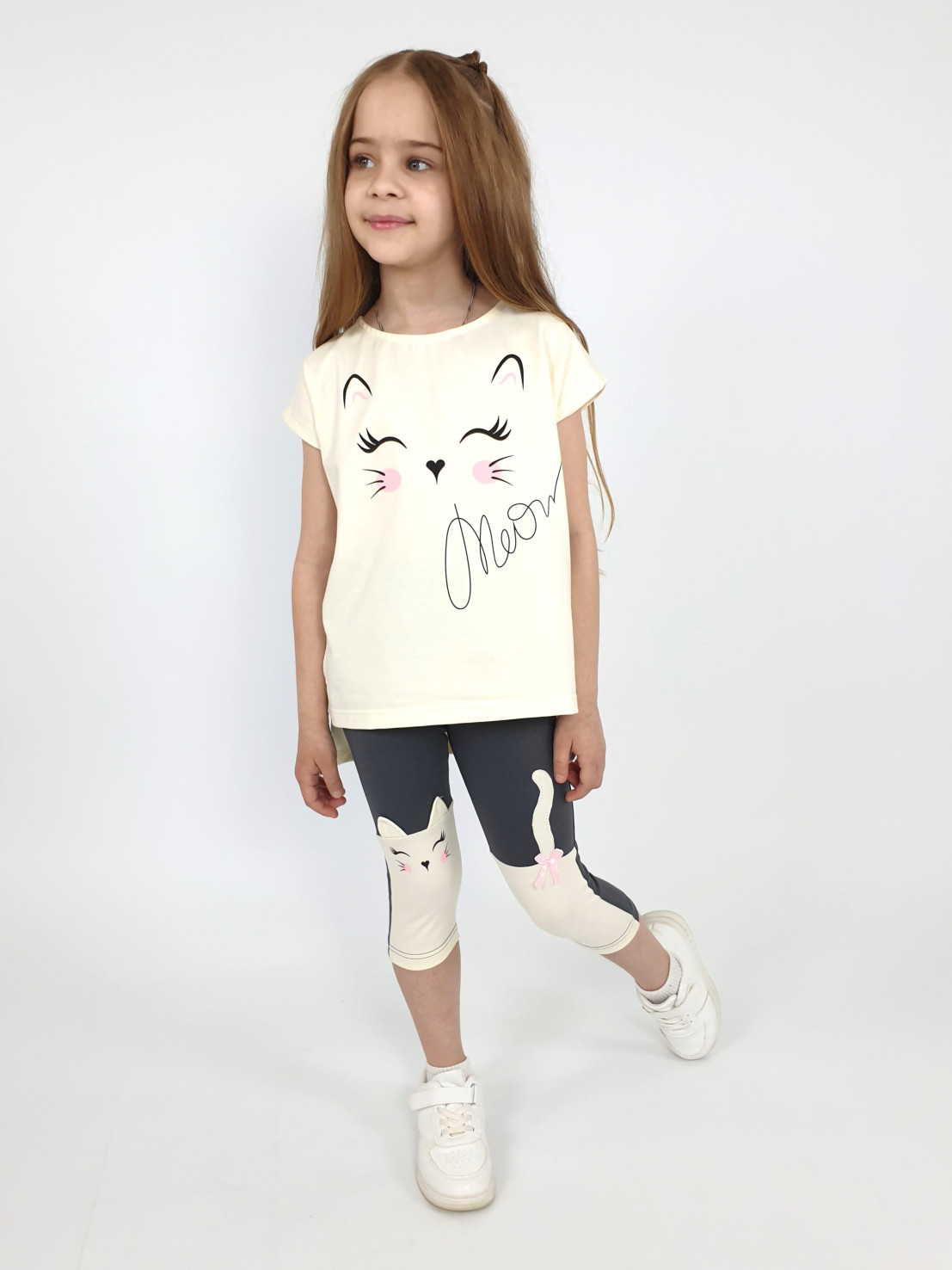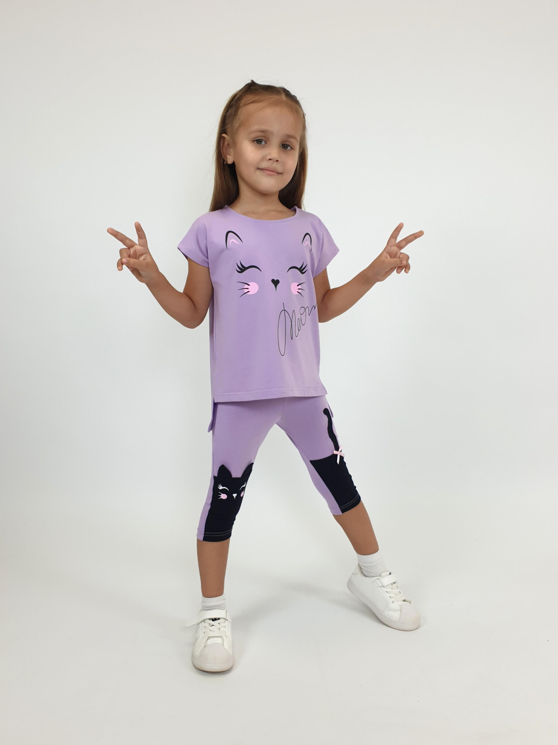 Кулирное полотно:95% х/б,5% лайкра. Фуфайка-прямой силуэт,удлиненная спинка с разрезами,перед с печатью.Спущенное плечо,горловина окантована и подшита. Лосины-укороченные,передние половинки с подрезами.Вышивка-аппликация слева,печать на правой передней стороне.Отделочный бантик.