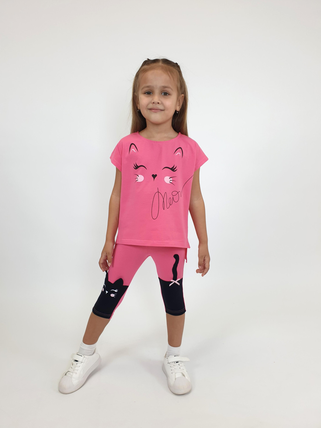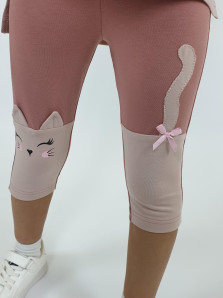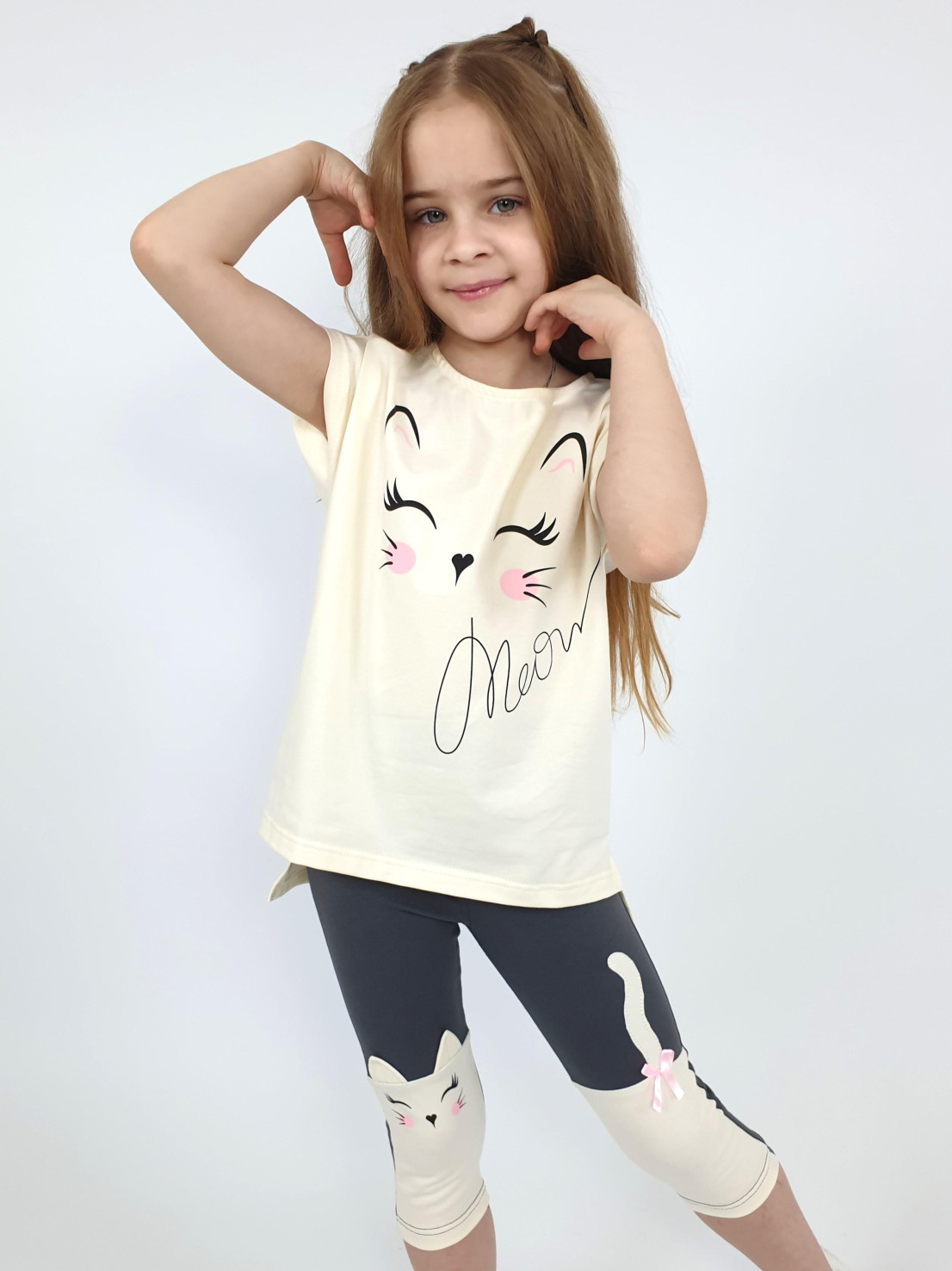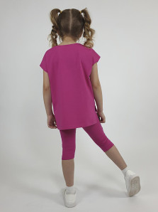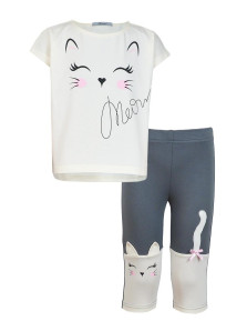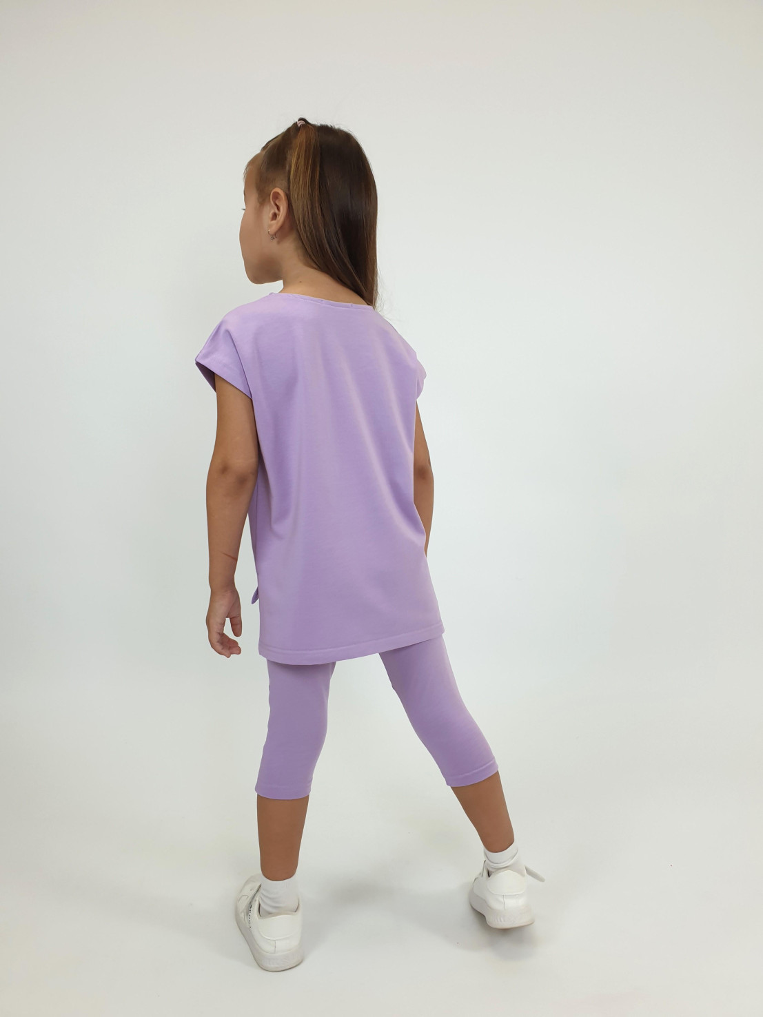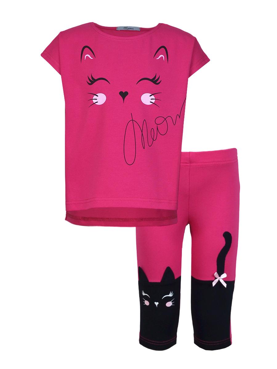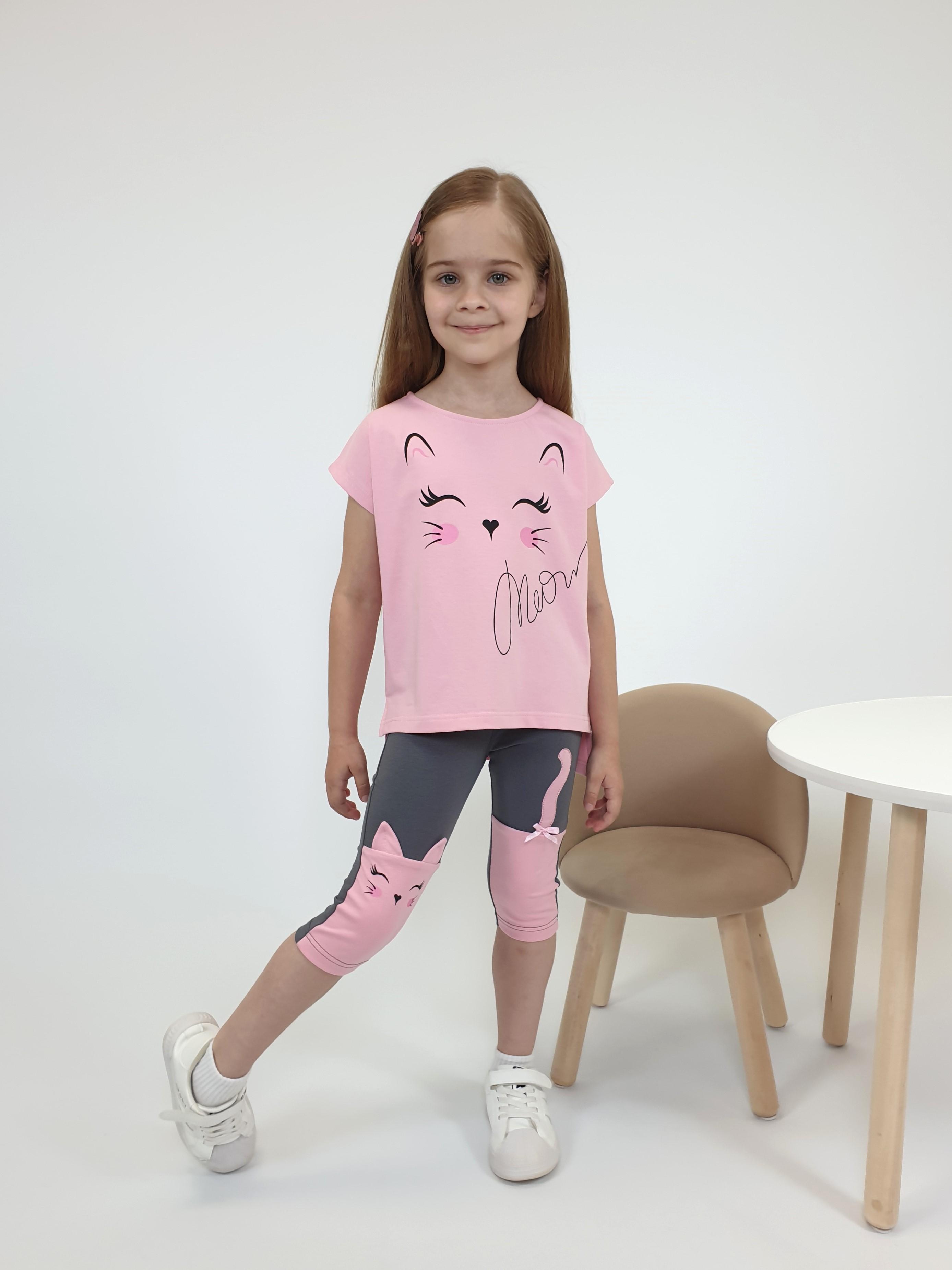 Кулирное полотно:95% х/б,5% лайкра. Фуфайка-прямой силуэт,удлиненная спинка с разрезами,перед с печатью.Спущенное плечо,горловина окантована и подшита. Лосины-укороченные,передние половинки с подрезами.Вышивка-аппликация слева,печать на правой передней стороне.Отделочный бантик.