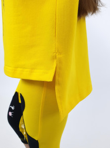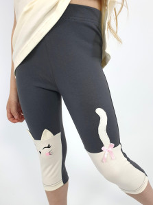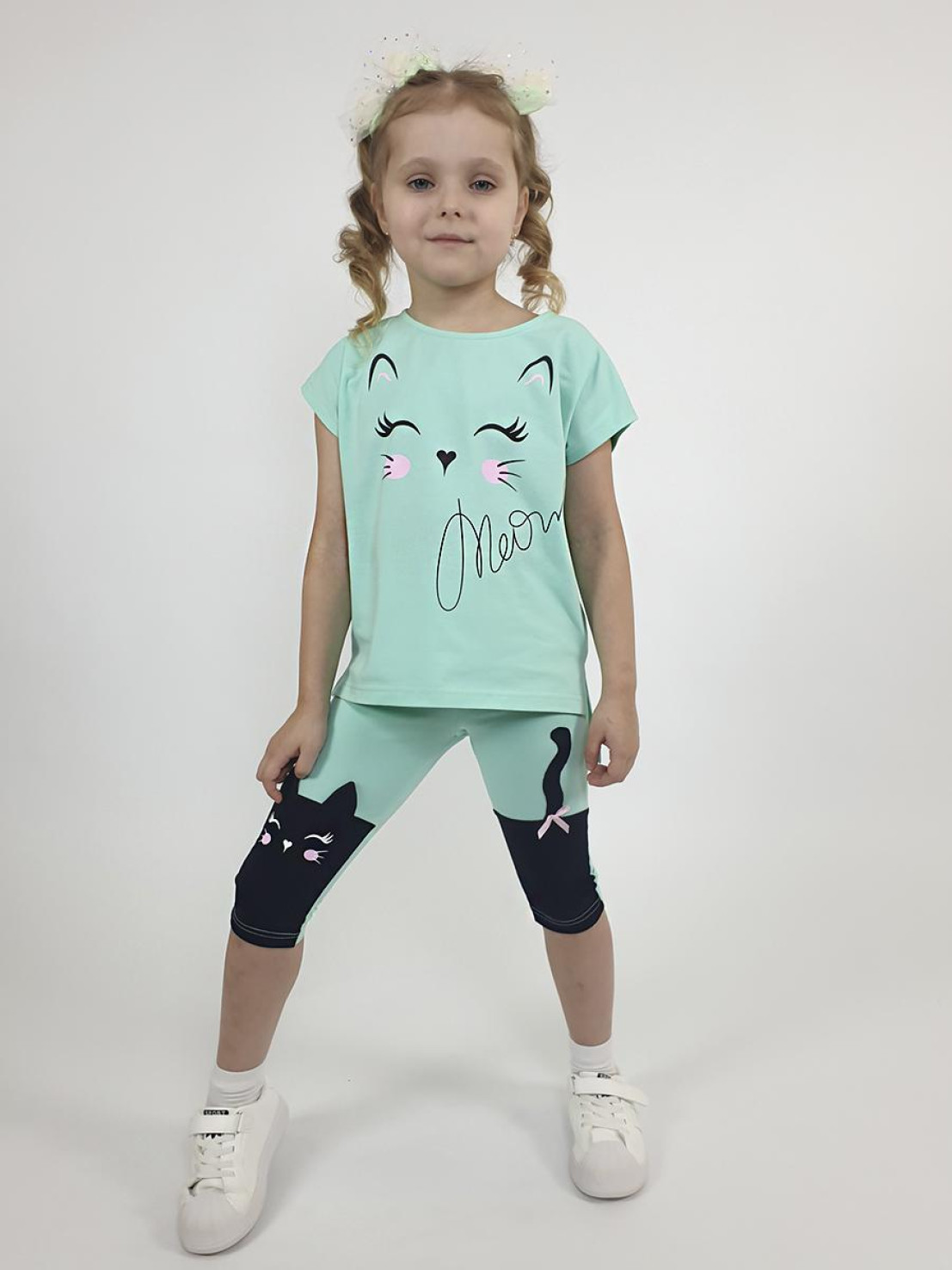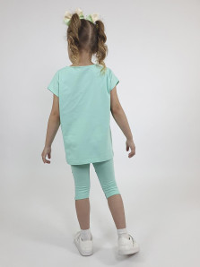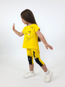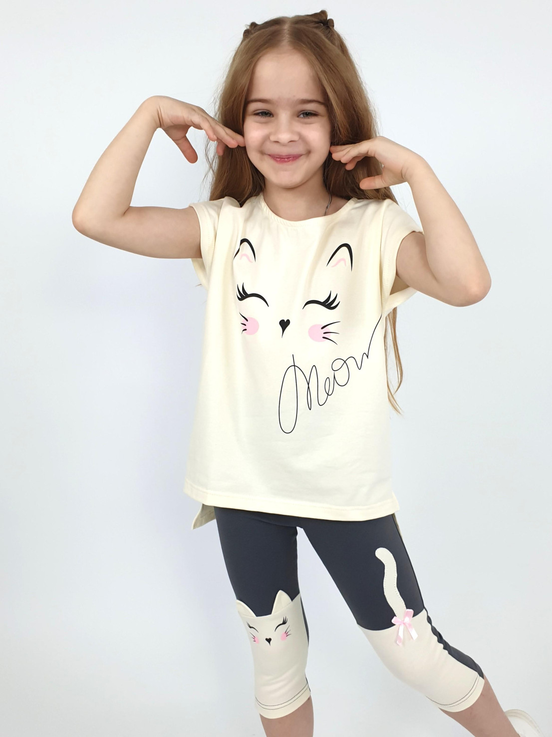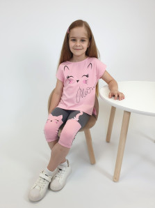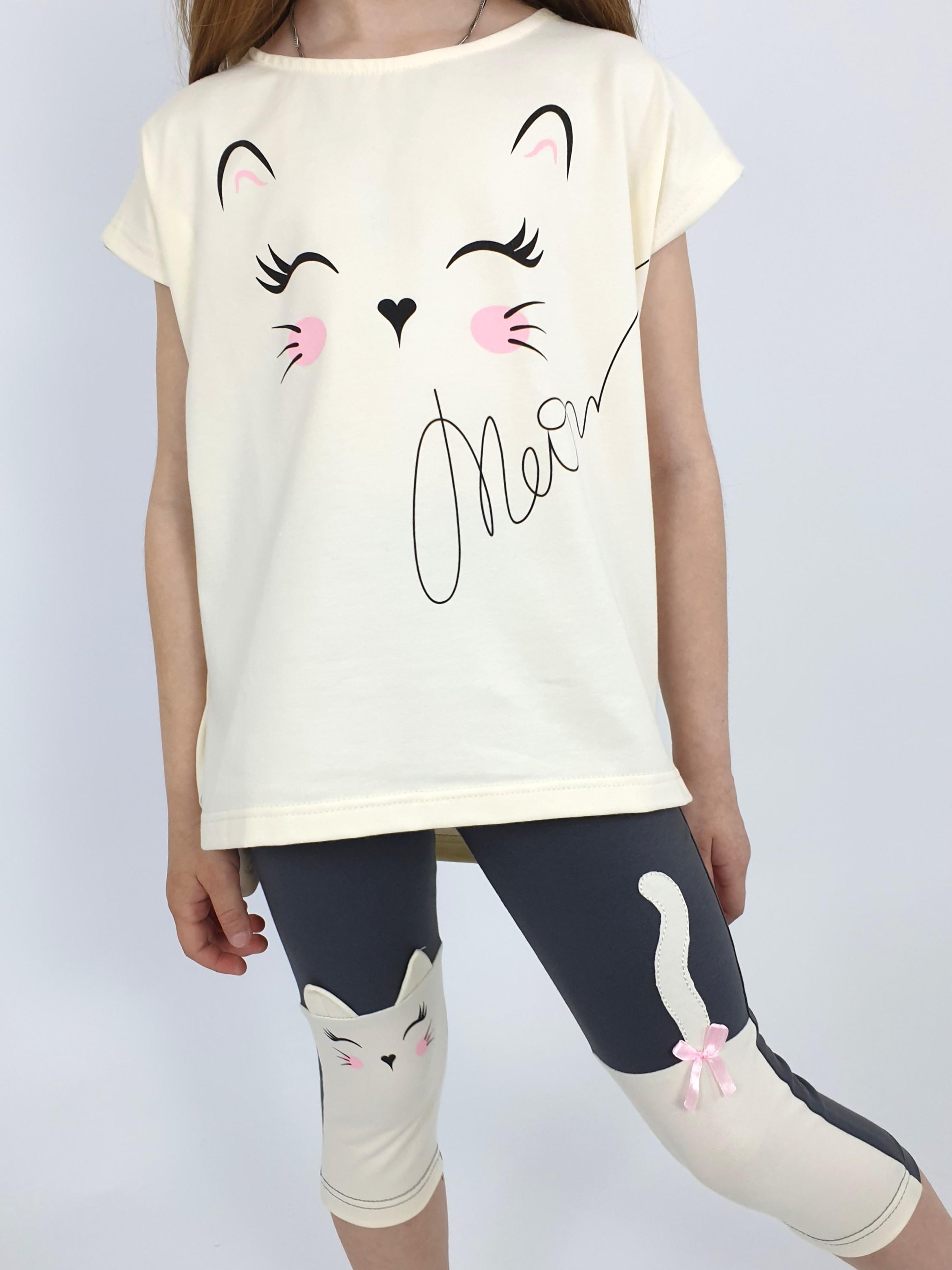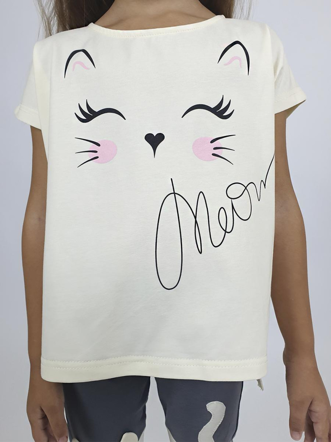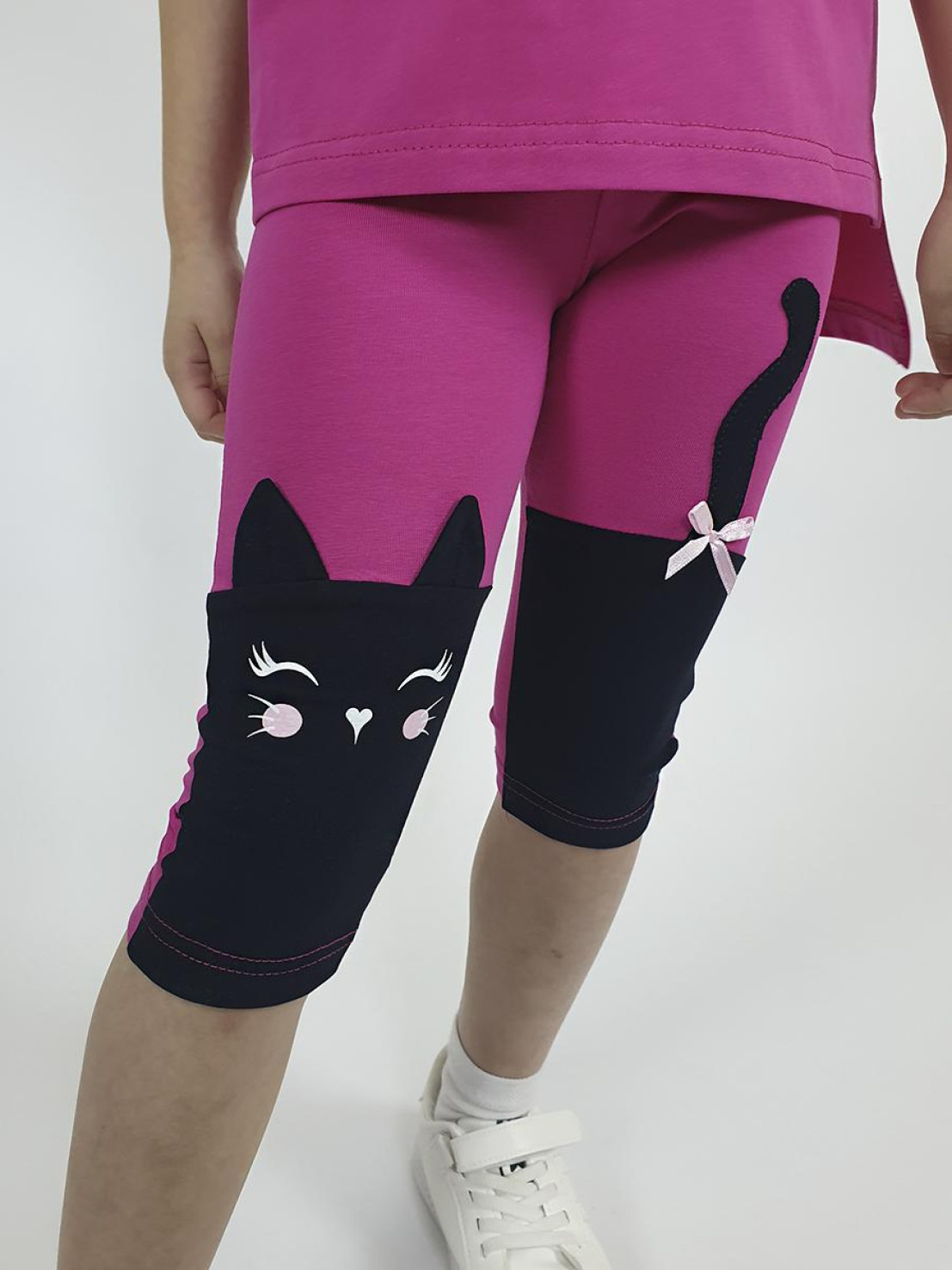 Кулирное полотно:95% х/б,5% лайкра. Фуфайка-прямой силуэт,удлиненная спинка с разрезами,перед с печатью.Спущенное плечо,горловина окантована и подшита. Лосины-укороченные,передние половинки с подрезами.Вышивка-аппликация слева,печать на правой передней стороне.Отделочный бантик.