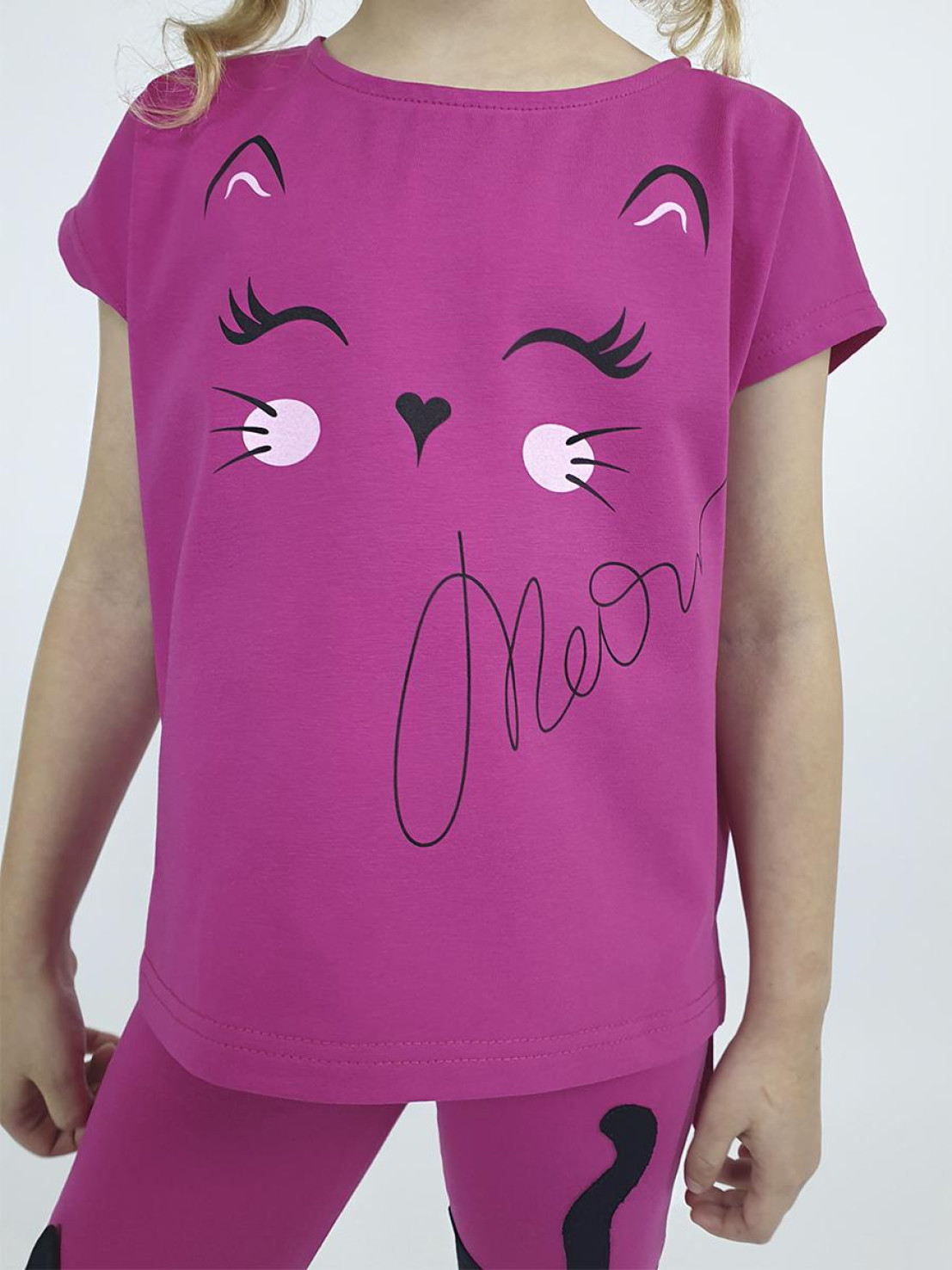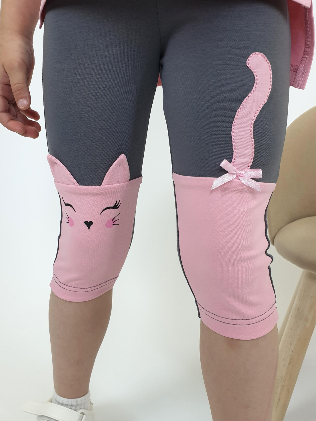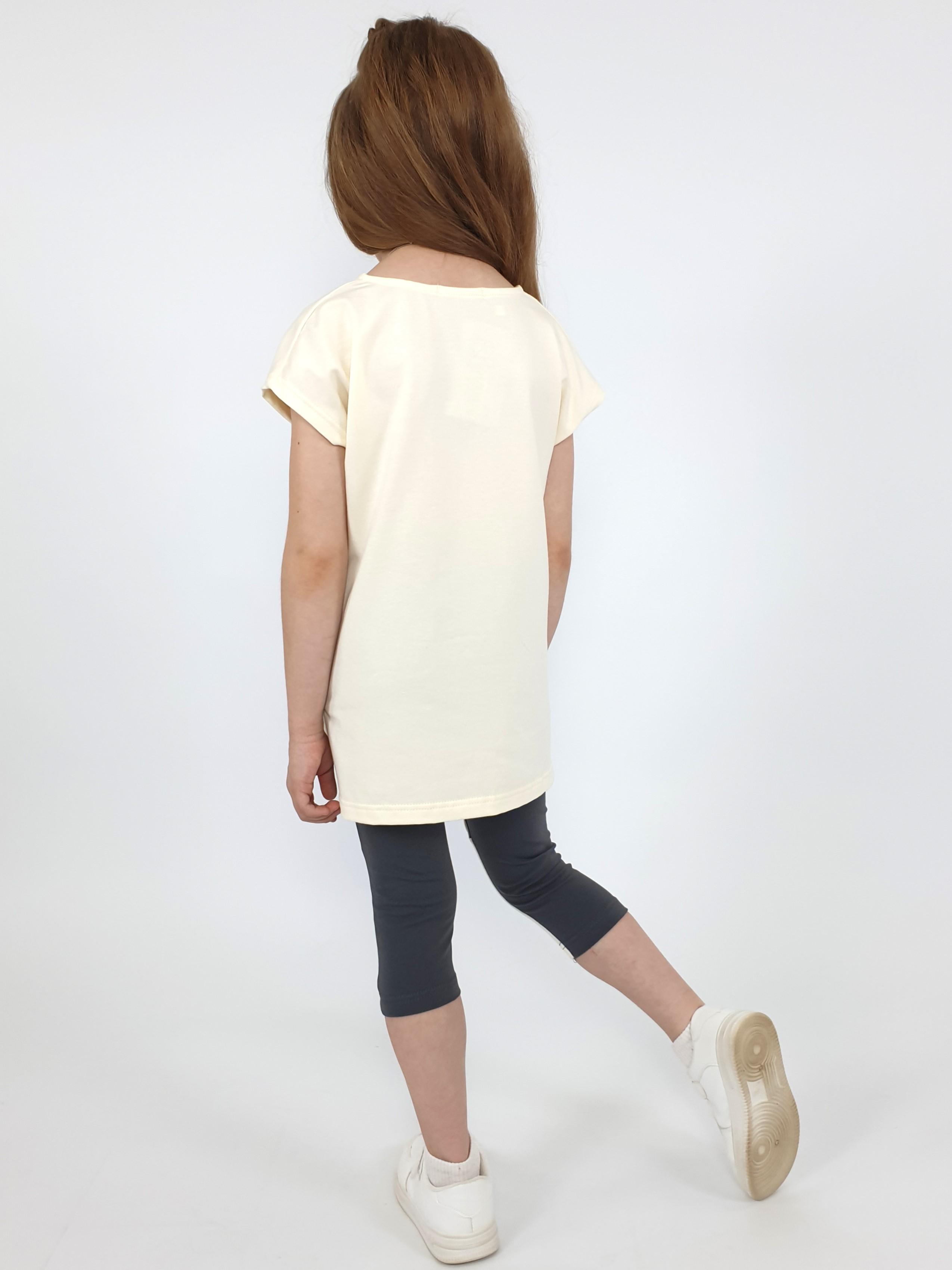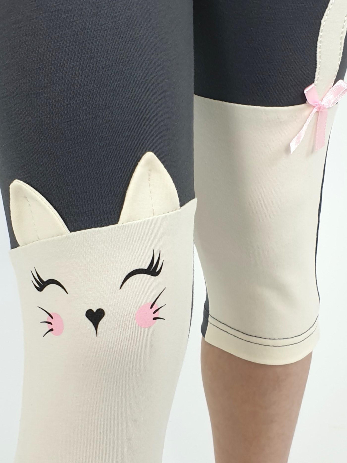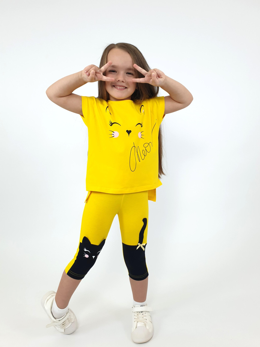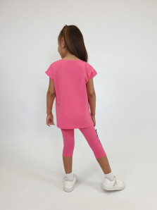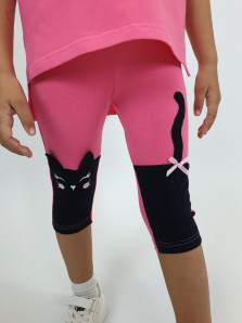 Кулирное полотно:95% х/б,5% лайкра. Фуфайка-прямой силуэт,удлиненная спинка с разрезами,перед с печатью.Спущенное плечо,горловина окантована и подшита. Лосины-укороченные,передние половинки с подрезами.Вышивка-аппликация слева,печать на правой передней стороне.Отделочный бантик.