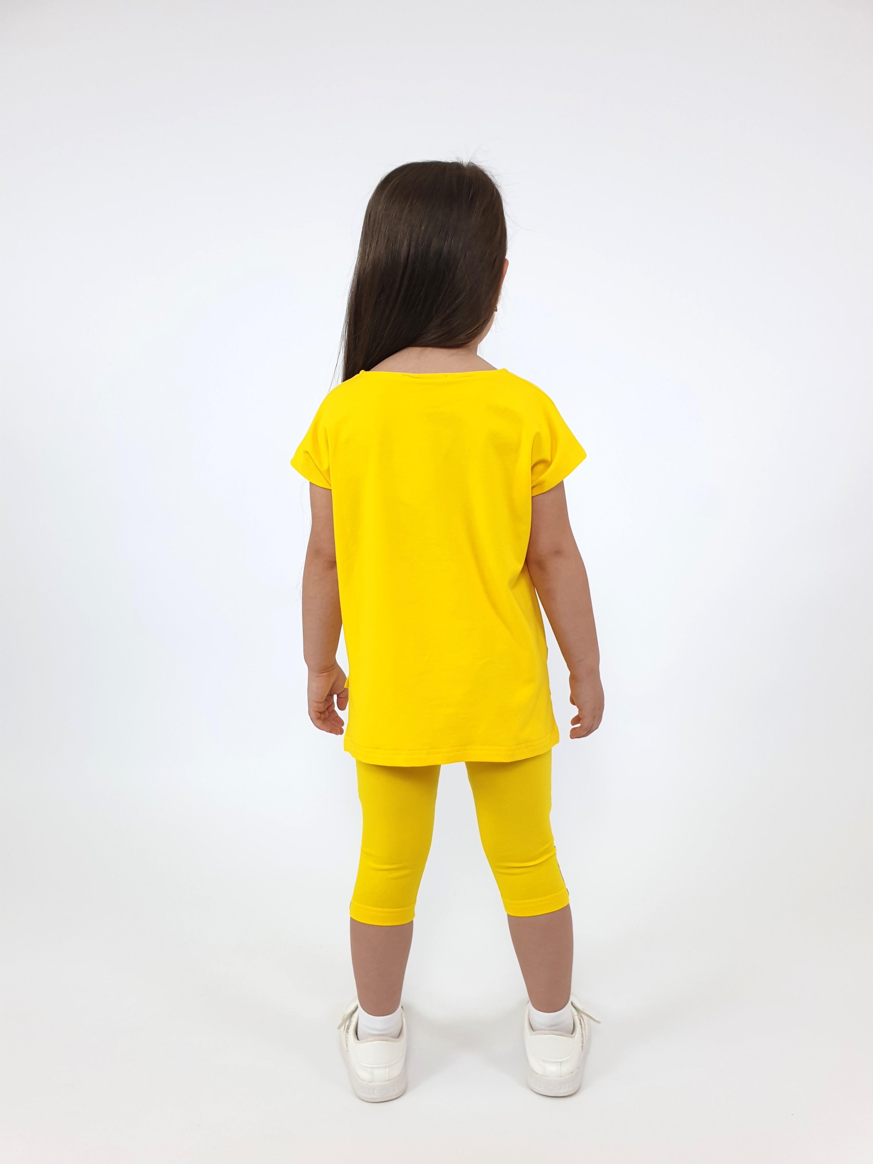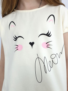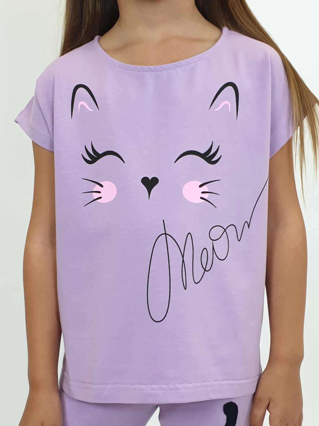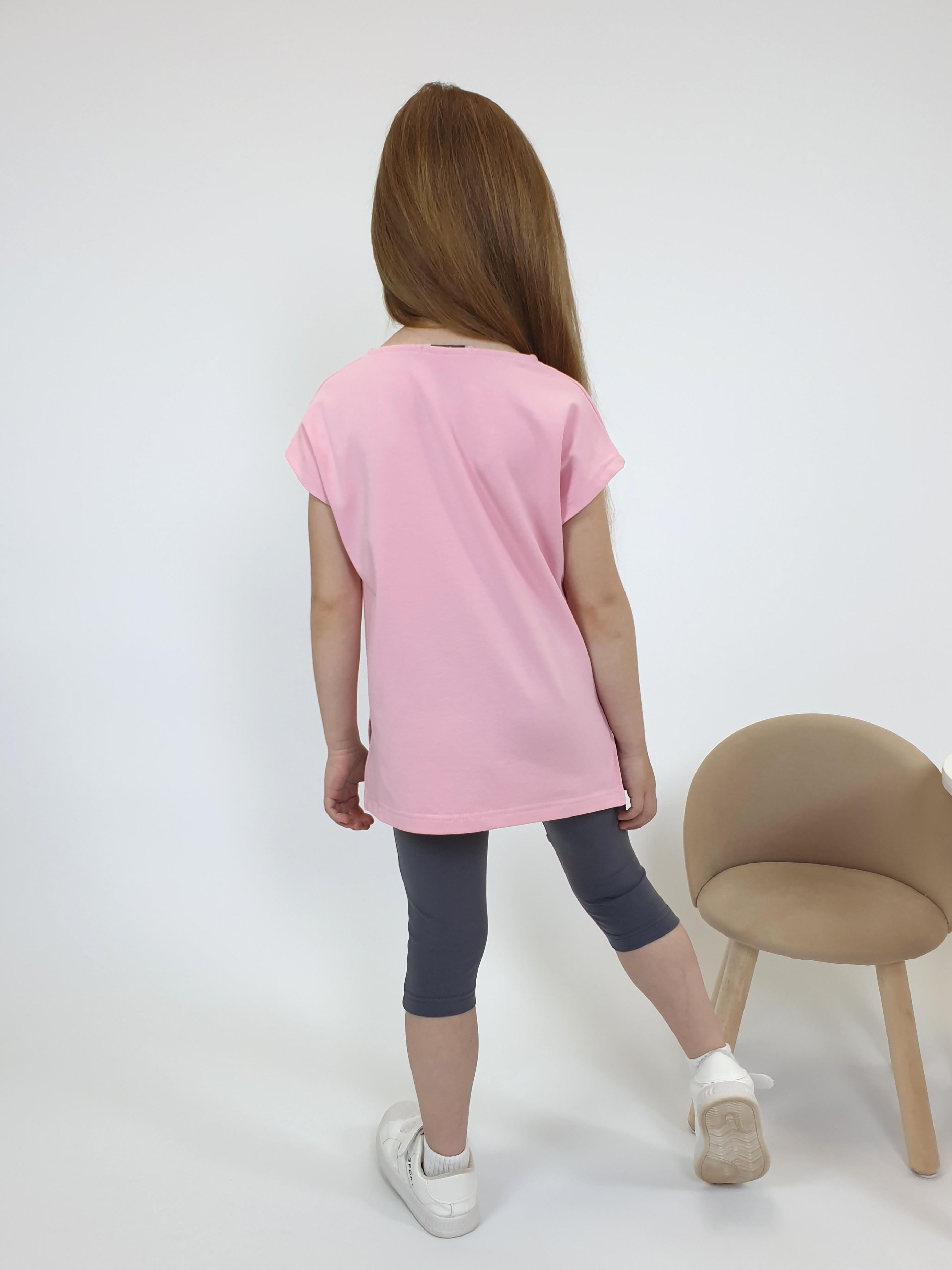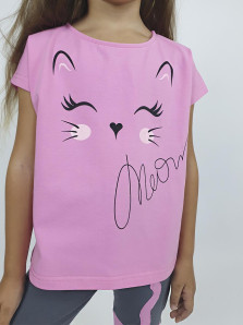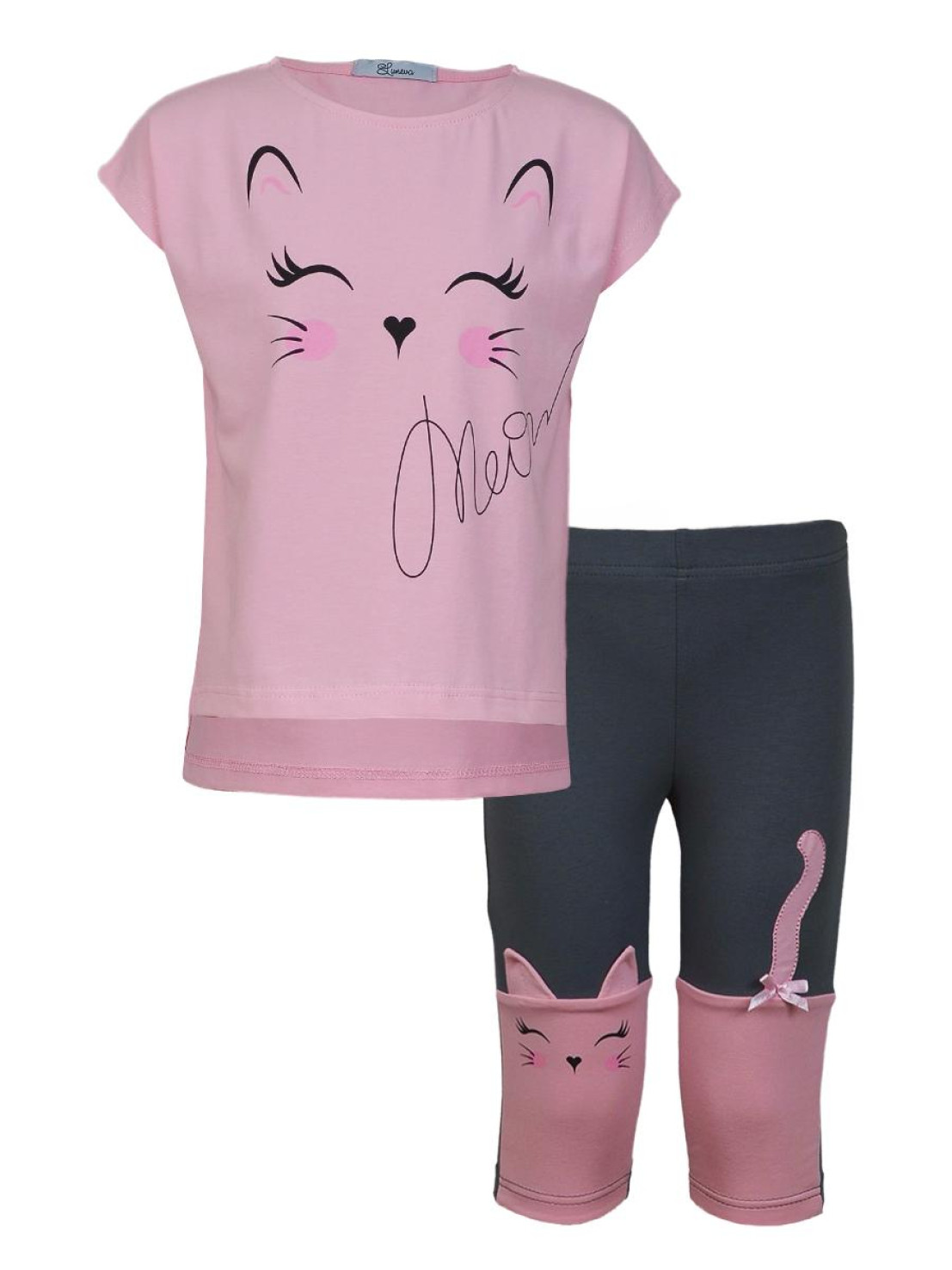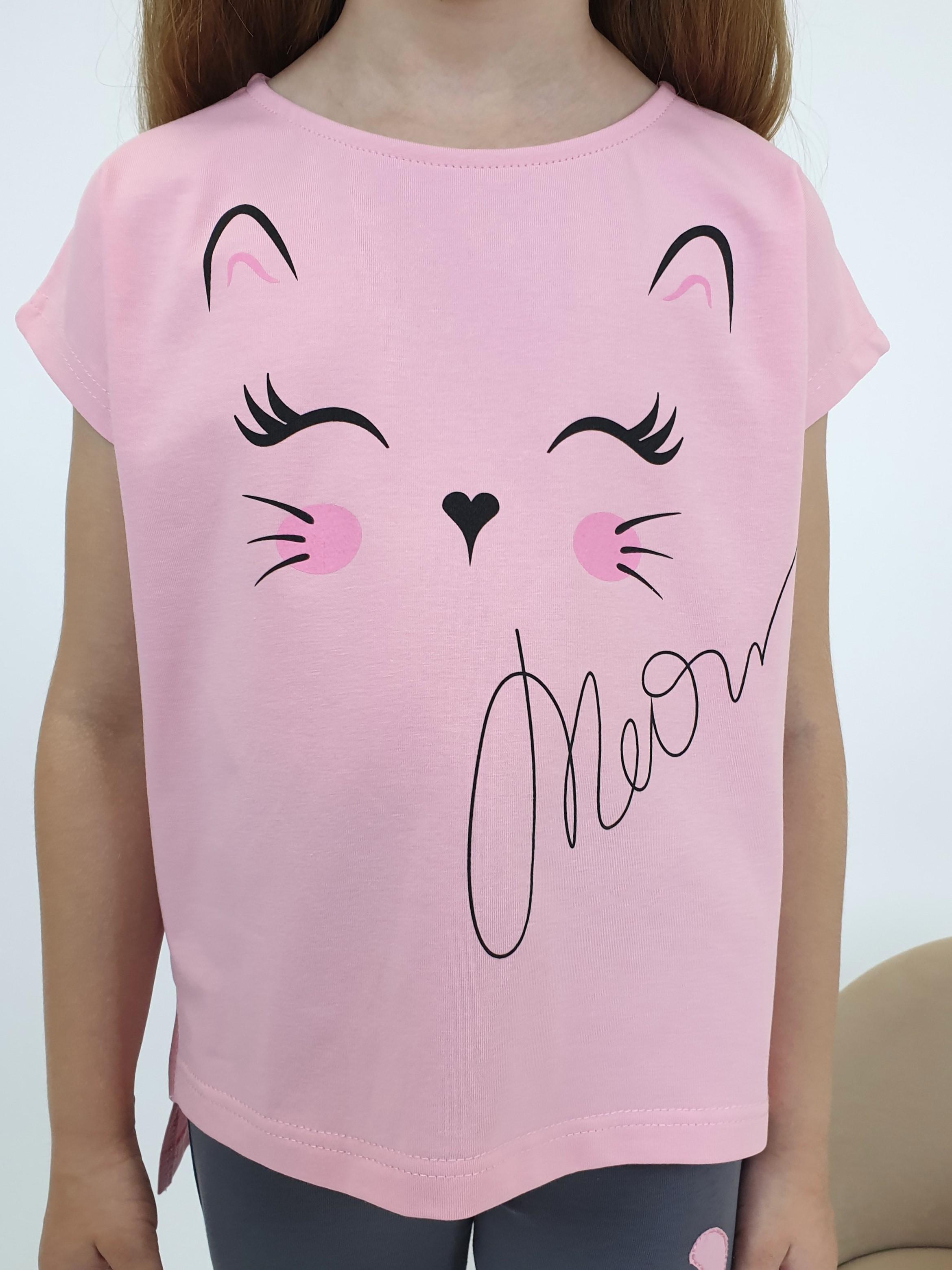 Кулирное полотно:95% х/б,5% лайкра. Фуфайка-прямой силуэт,удлиненная спинка с разрезами,перед с печатью.Спущенное плечо,горловина окантована и подшита. Лосины-укороченные,передние половинки с подрезами.Вышивка-аппликация слева,печать на правой передней стороне.Отделочный бантик.