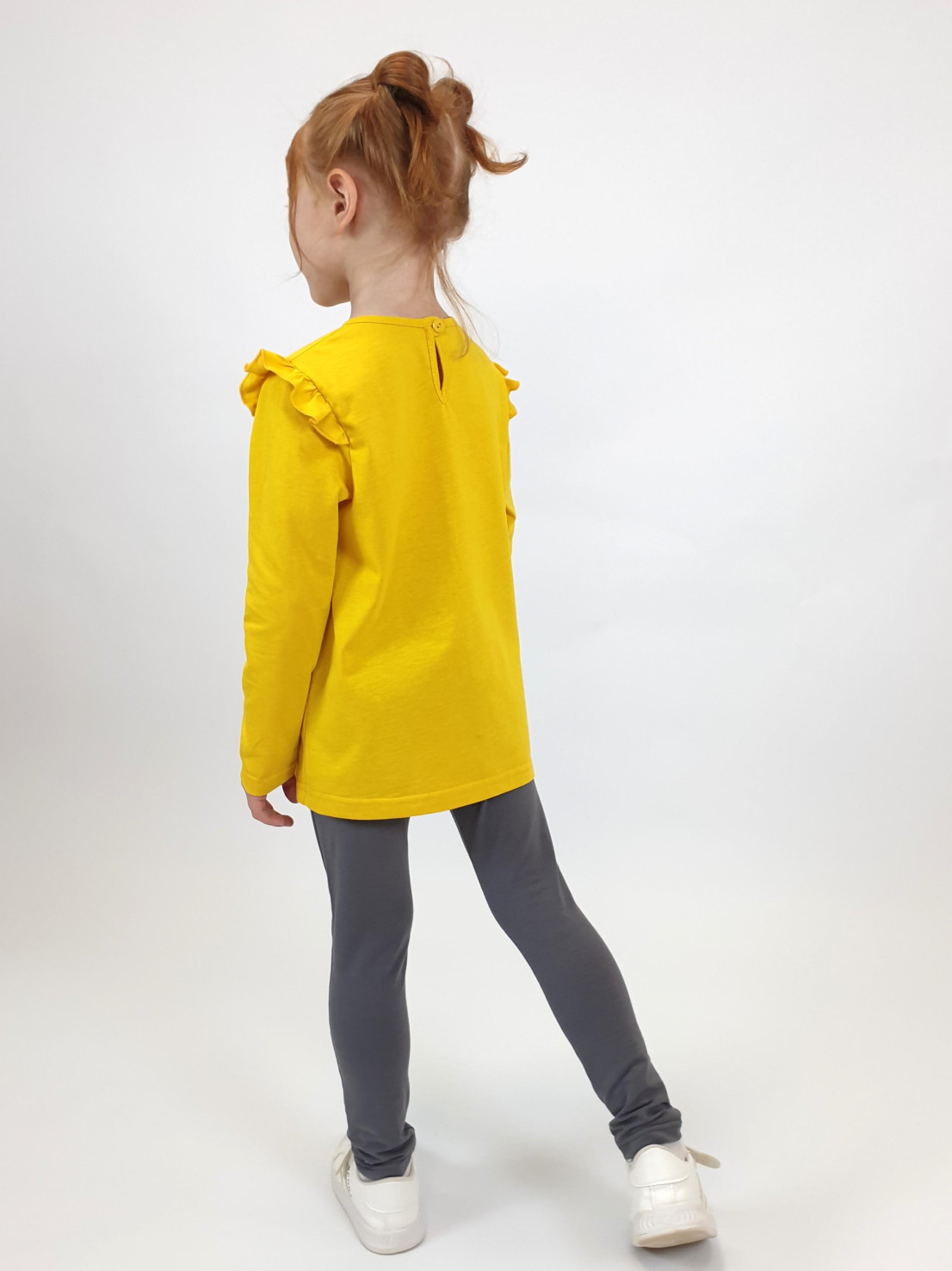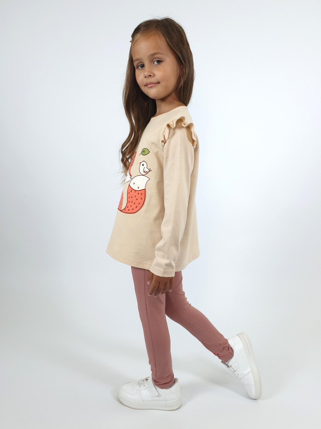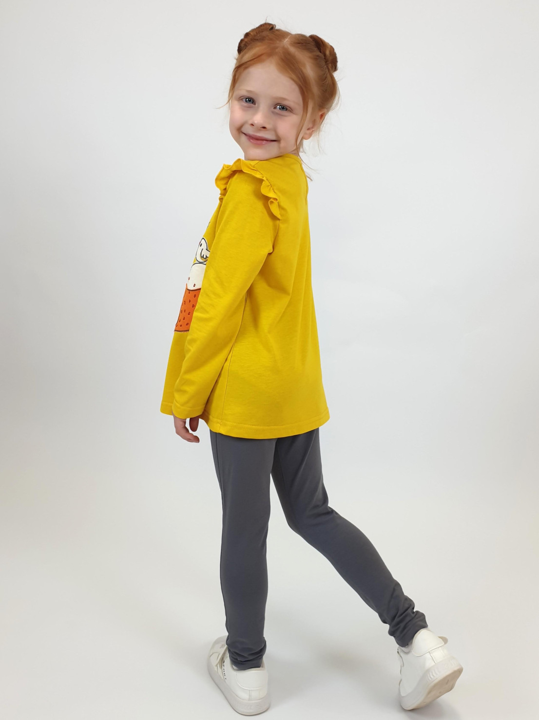 Кулирное полотно: Фуфайка- 100% х/б.,лосины-95% х/б,5% лайкра. Фуфайка-силуэт трапеция,длинный втачной рукав,в пройме рюша.Горловина окантована,застежка на пуговицу по спинке.Вышивка и печать на переде. Лосины-длинные с печатью на правой стороне внизу,вверху на резинке.