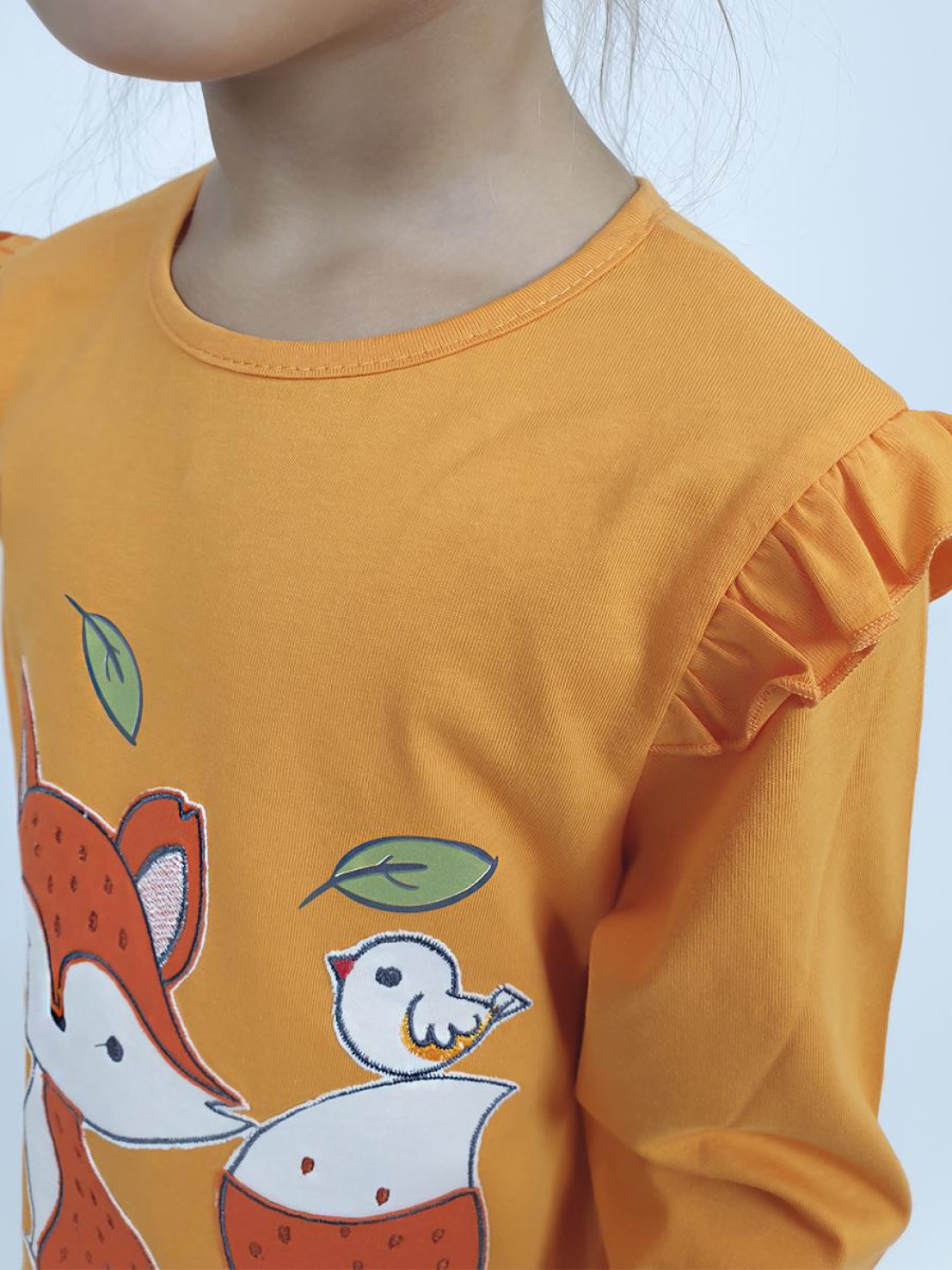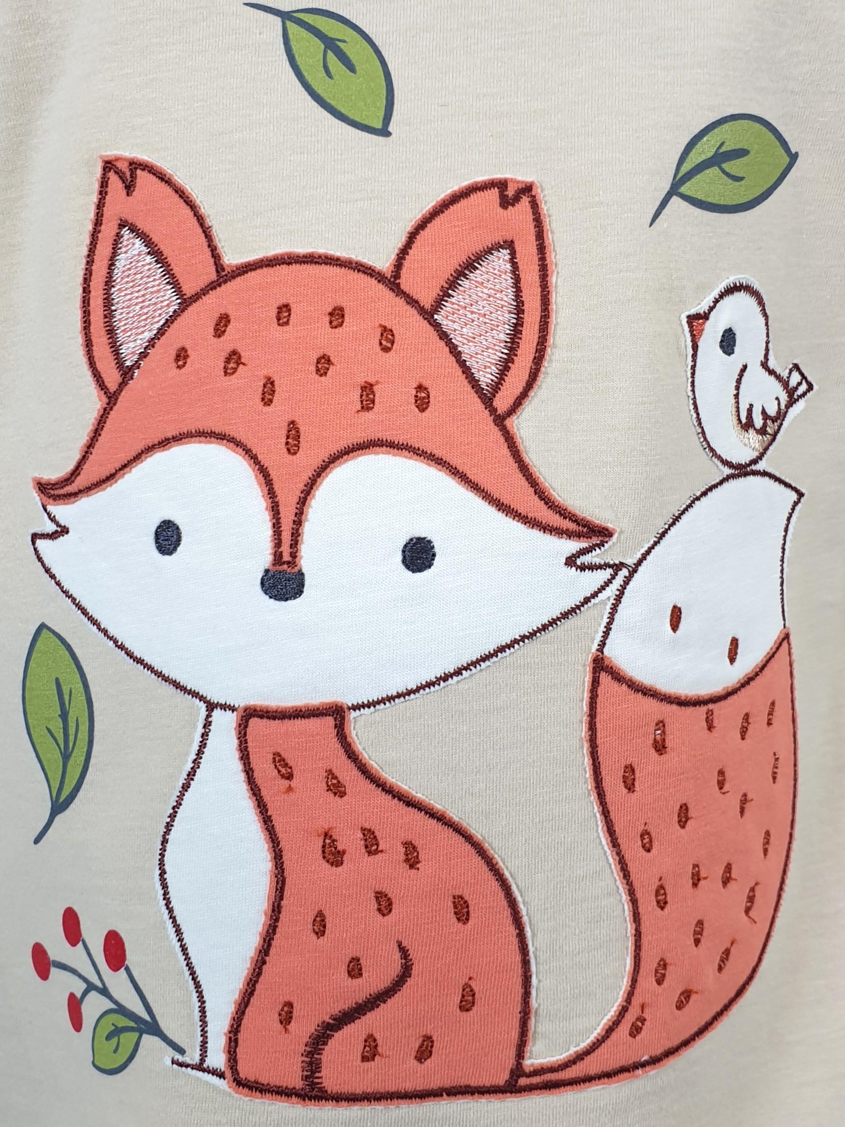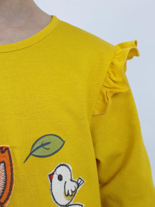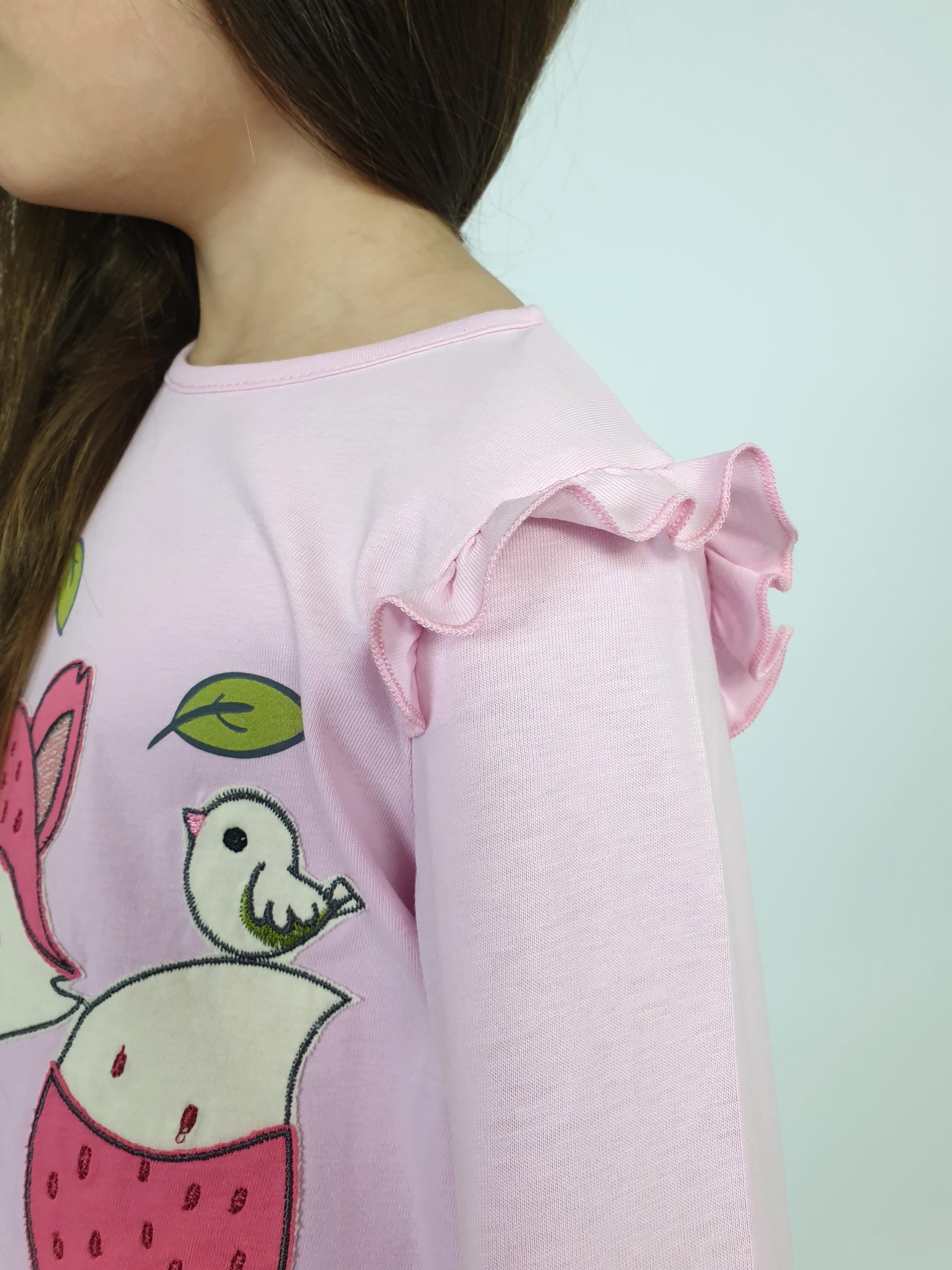 Кулирное полотно: Фуфайка- 100% х/б.,лосины-95% х/б,5% лайкра. Фуфайка-силуэт трапеция,длинный втачной рукав,в пройме рюша.Горловина окантована,застежка на пуговицу по спинке.Вышивка и печать на переде. Лосины-длинные с печатью на правой стороне внизу,вверху на резинке.