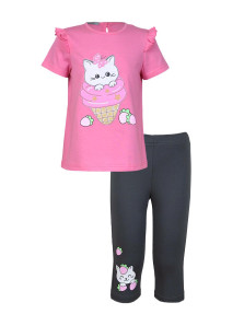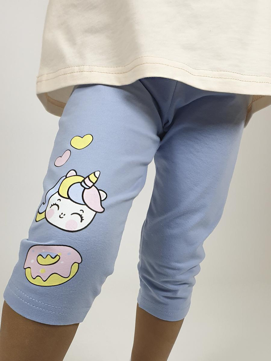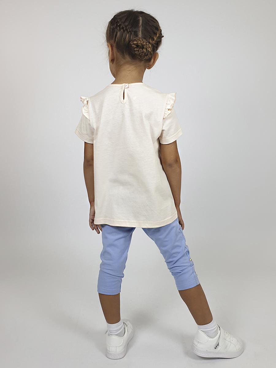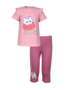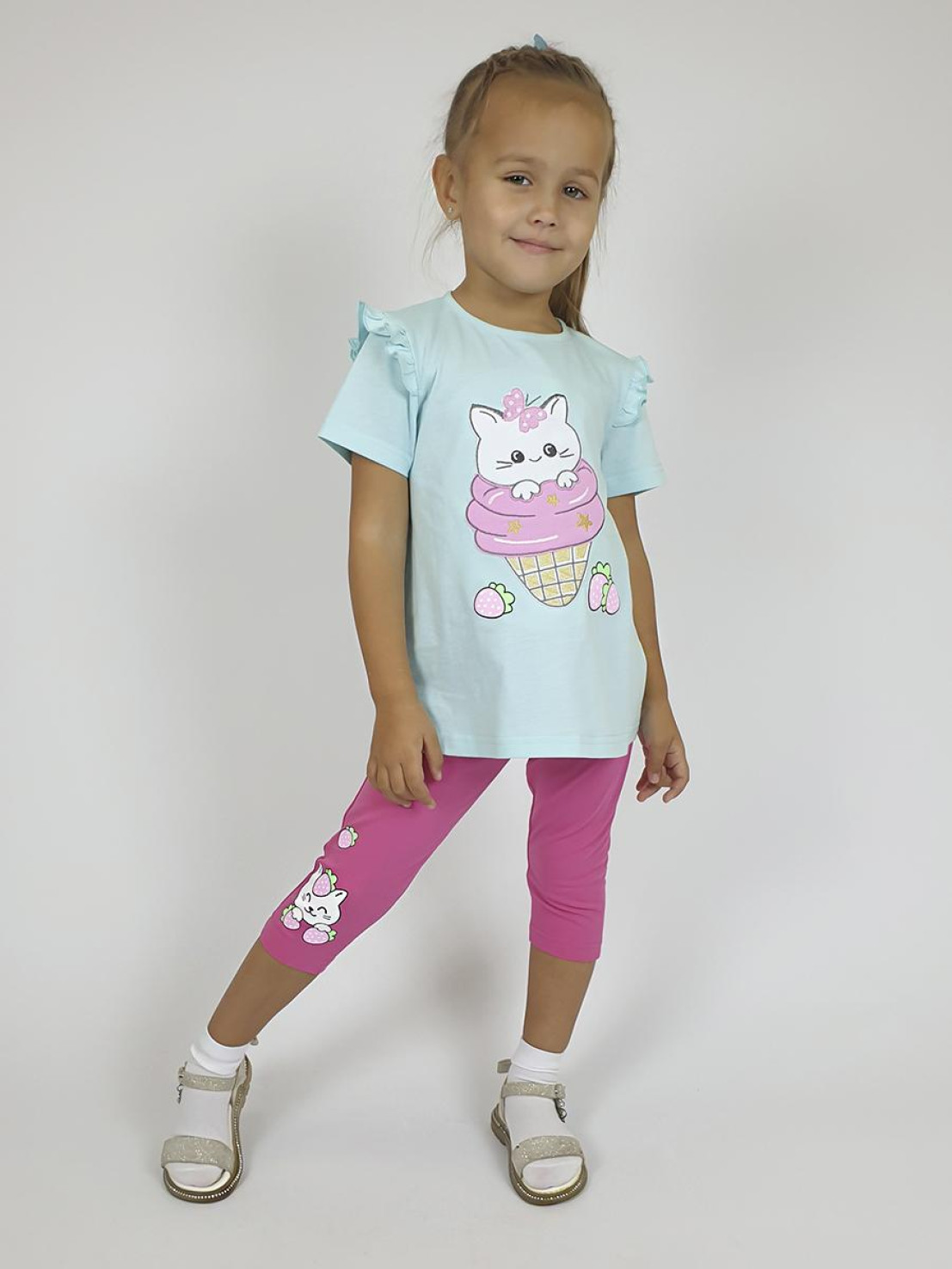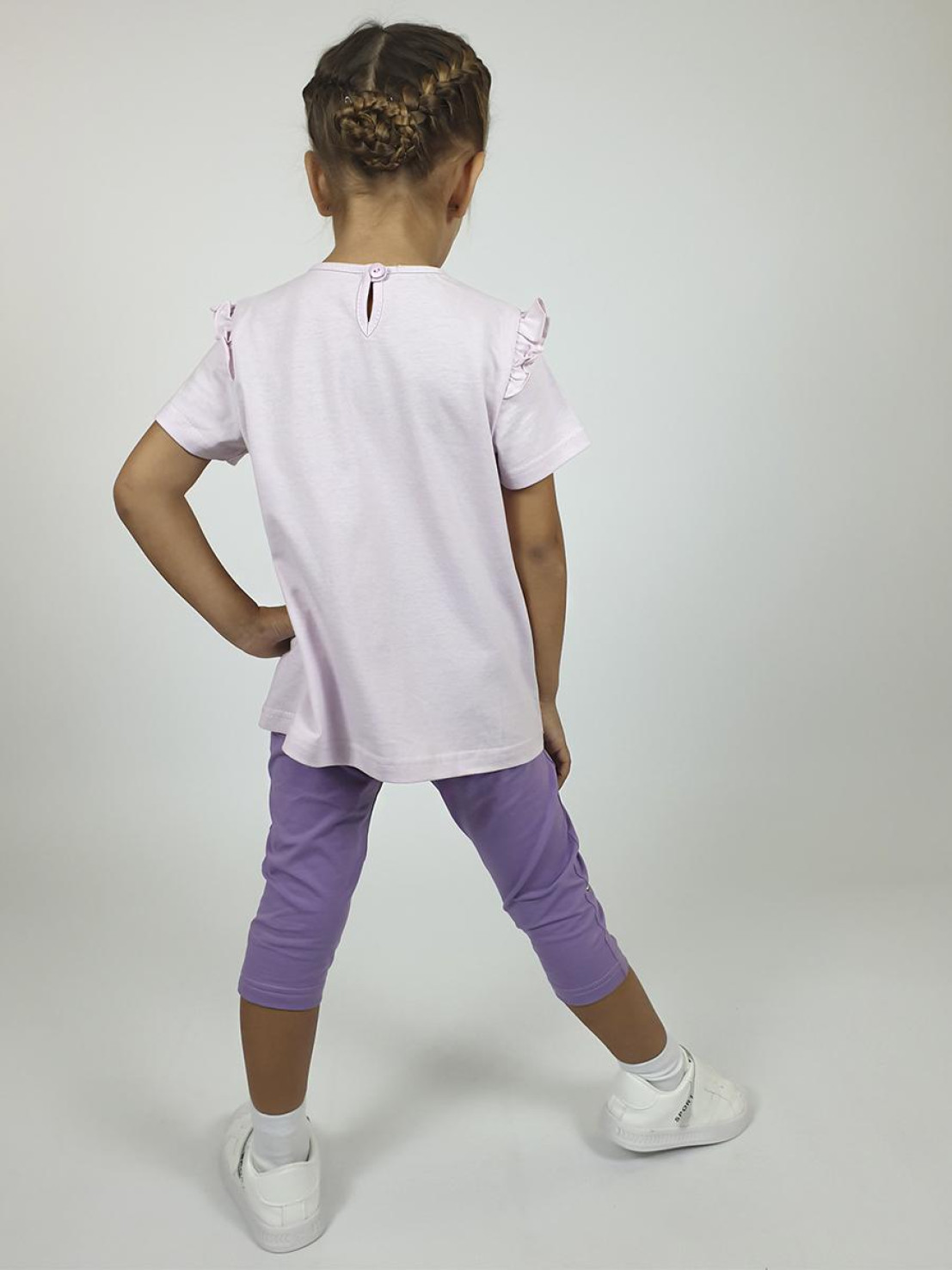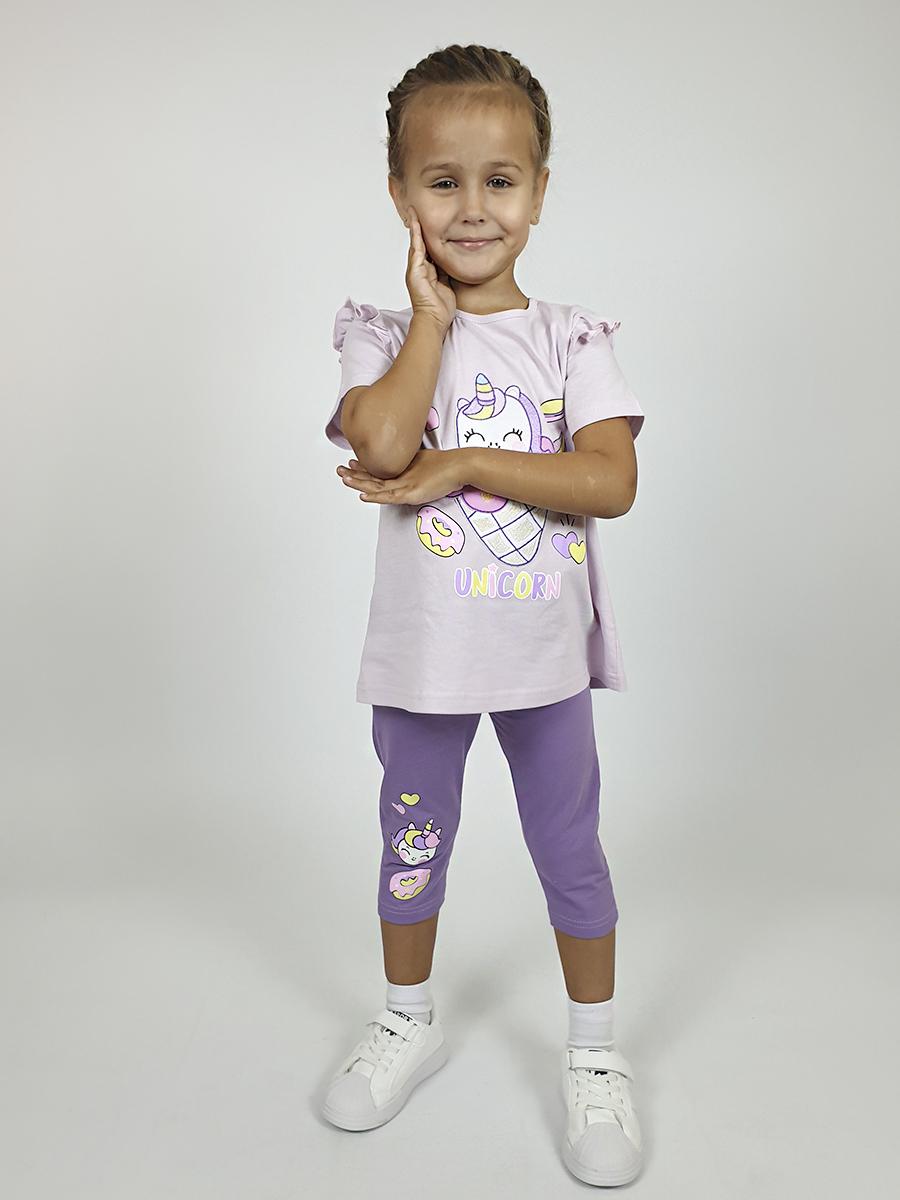 Кулирное полотно: Фуфайка- 100% х/б.,лосины-95% х/б,5% лайкра. Фуфайка-силуэт трапеция,короткий втачной рукав,в пройме рюша.Горловина окантована,застежка на пуговицу по спинке.Вышивка и печать на переде. Лосины-укороченные с печатью на правой стороне внизу,вверху на резинке.