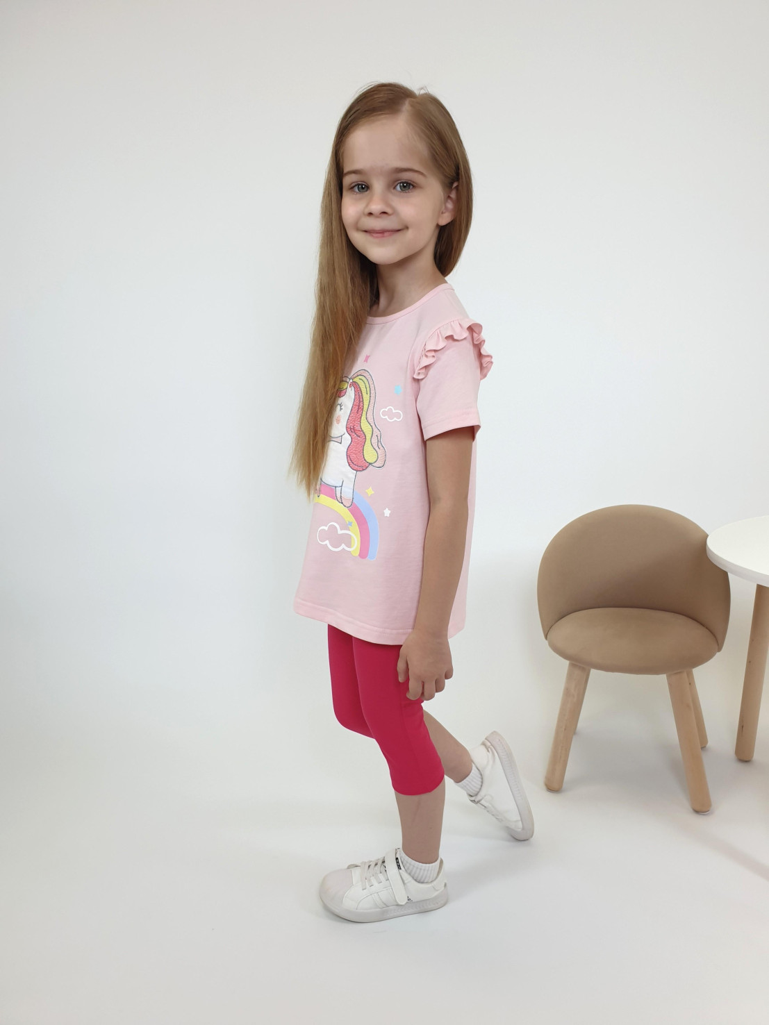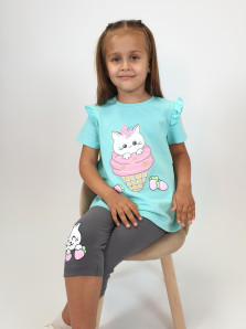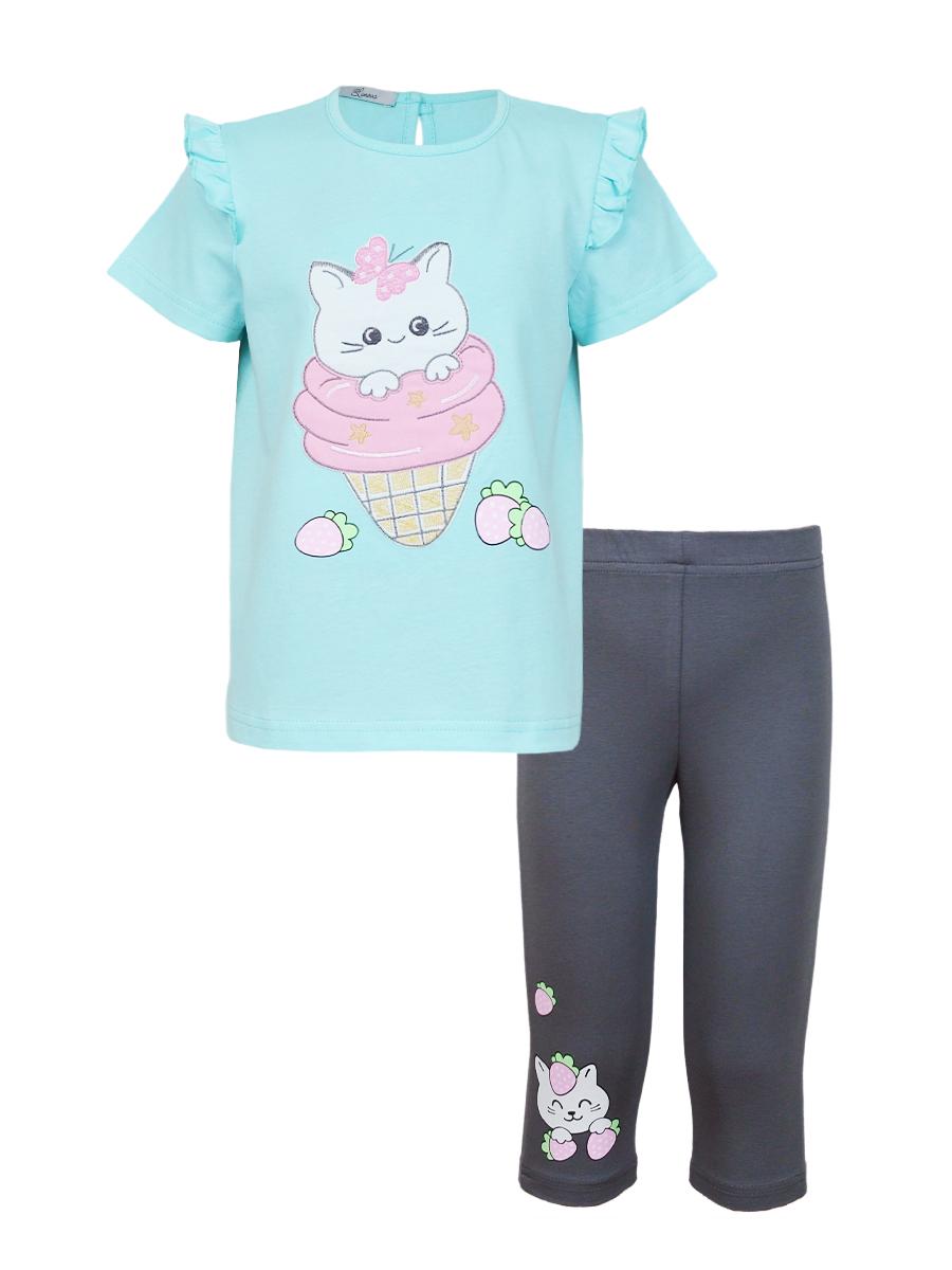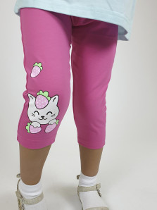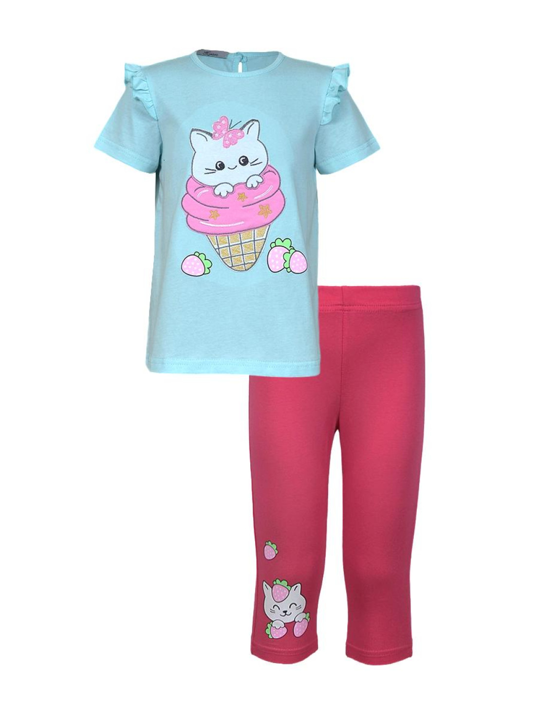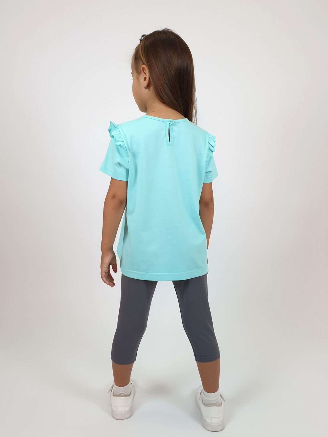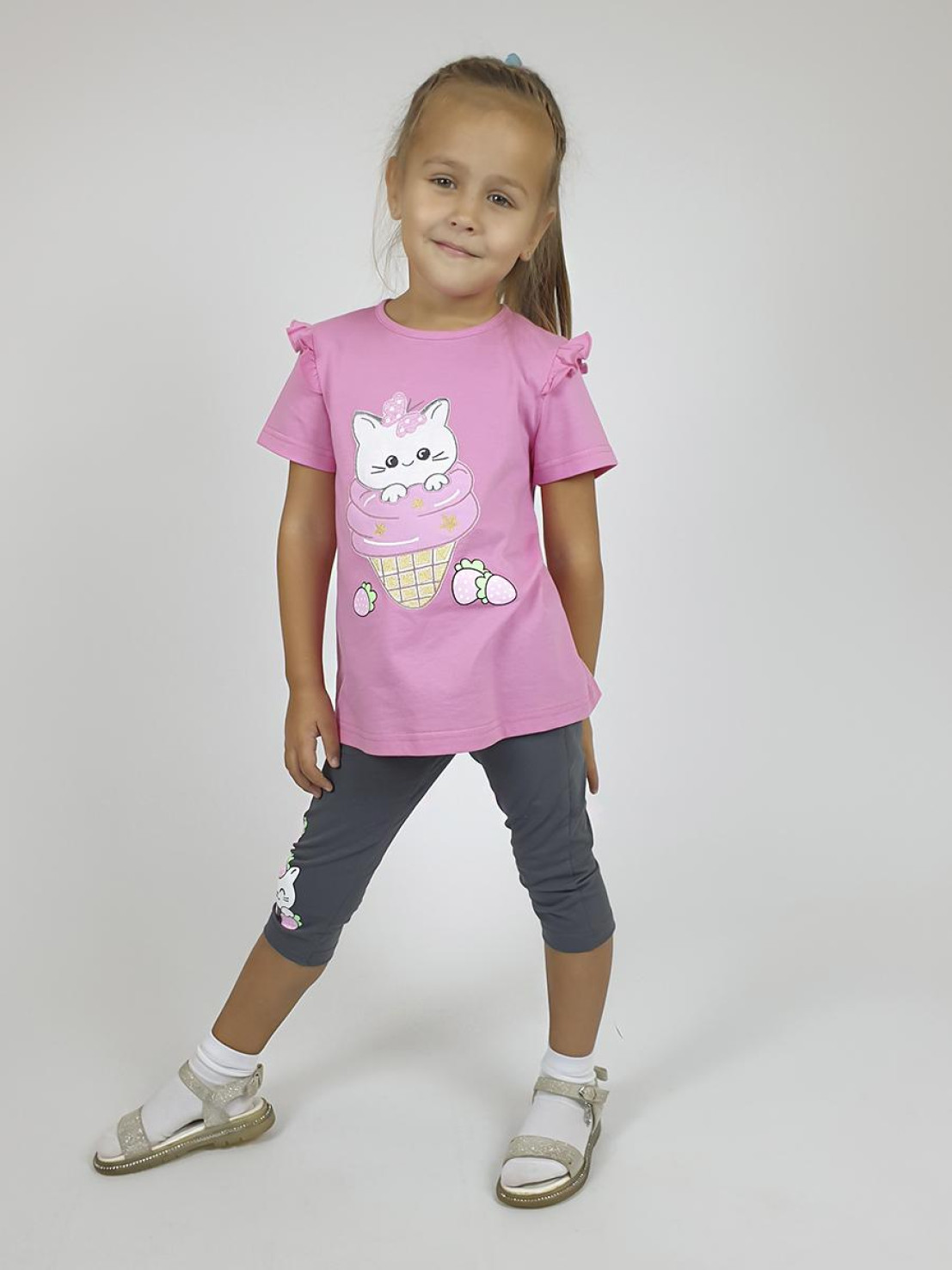 Кулирное полотно: Фуфайка- 100% х/б.,лосины-95% х/б,5% лайкра. Фуфайка-силуэт трапеция,короткий втачной рукав,в пройме рюша.Горловина окантована,застежка на пуговицу по спинке.Вышивка и печать на переде. Лосины-укороченные с печатью на правой стороне внизу,вверху на резинке.