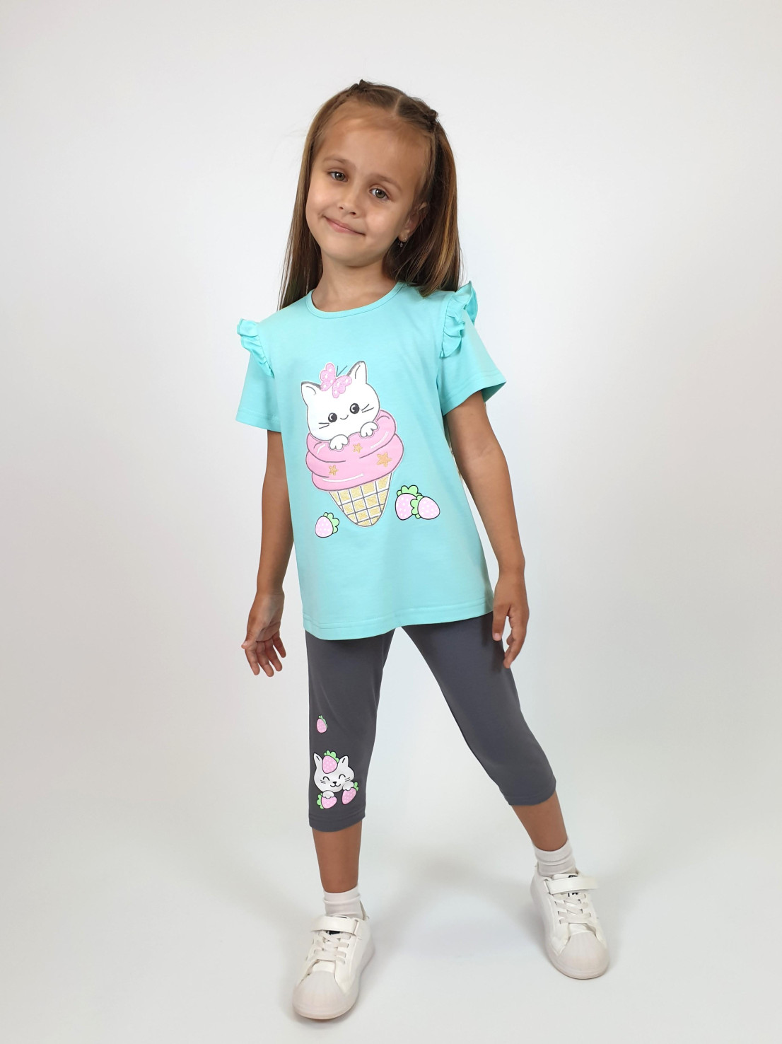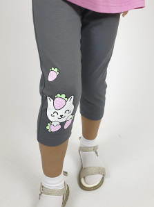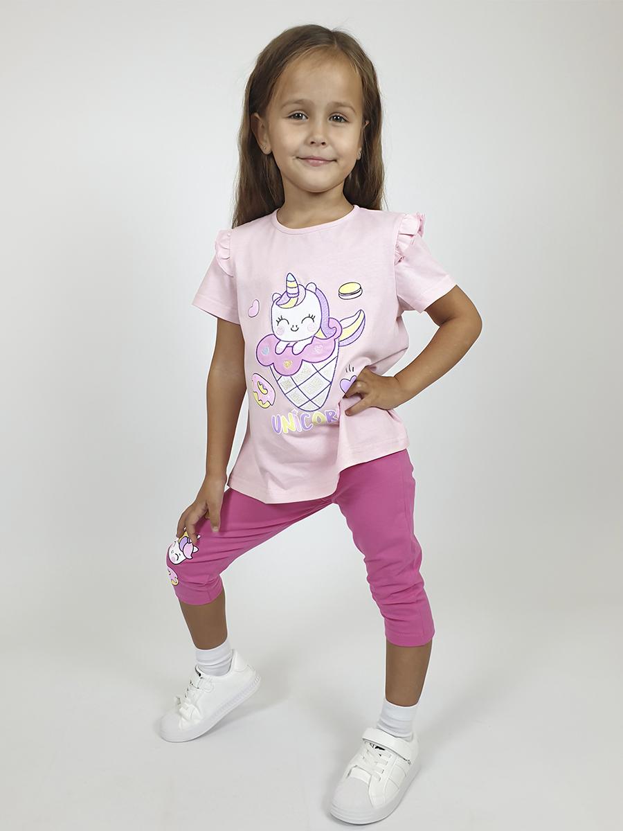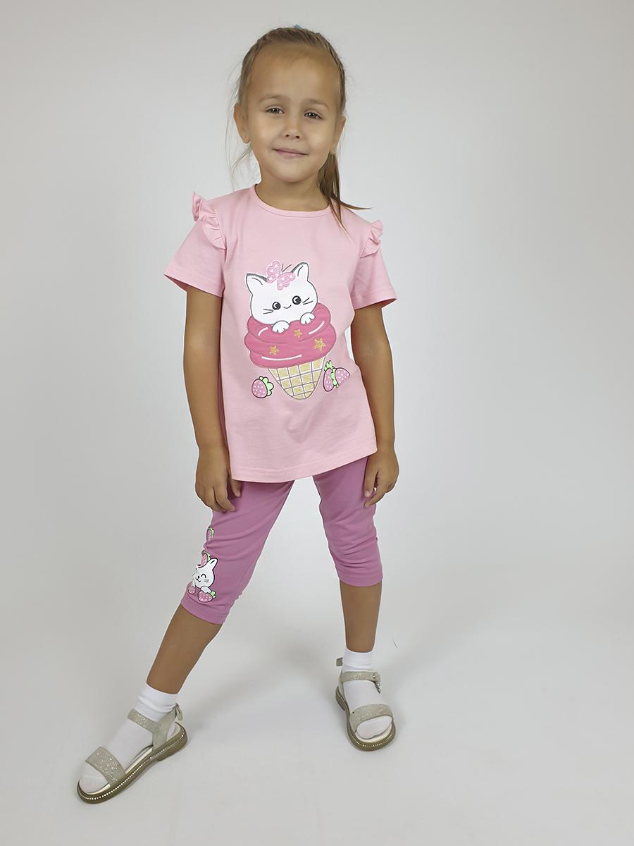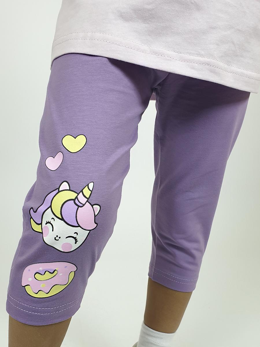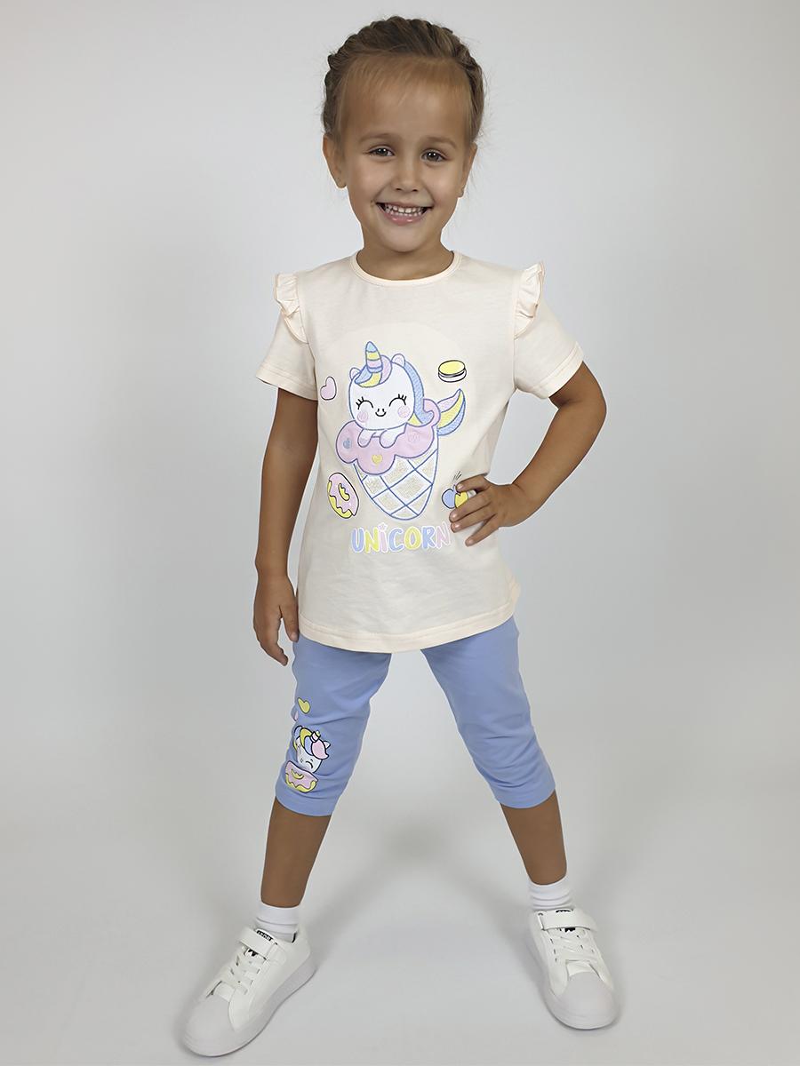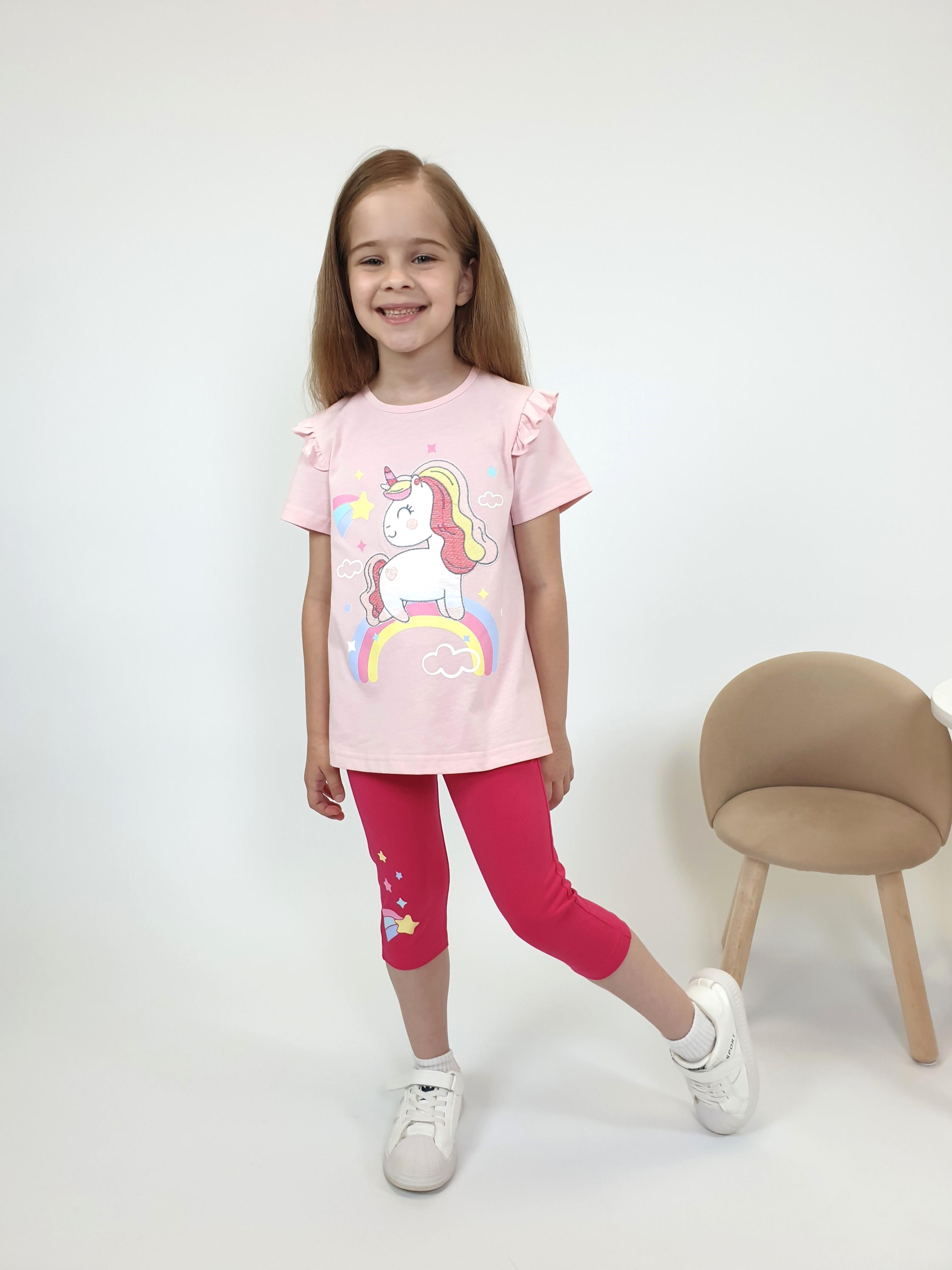 Кулирное полотно: Фуфайка- 100% х/б.,лосины-95% х/б,5% лайкра. Фуфайка-силуэт трапеция,короткий втачной рукав,в пройме рюша.Горловина окантована,застежка на пуговицу по спинке.Вышивка и печать на переде. Лосины-укороченные с печатью на правой стороне внизу,вверху на резинке.
