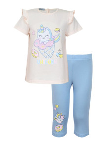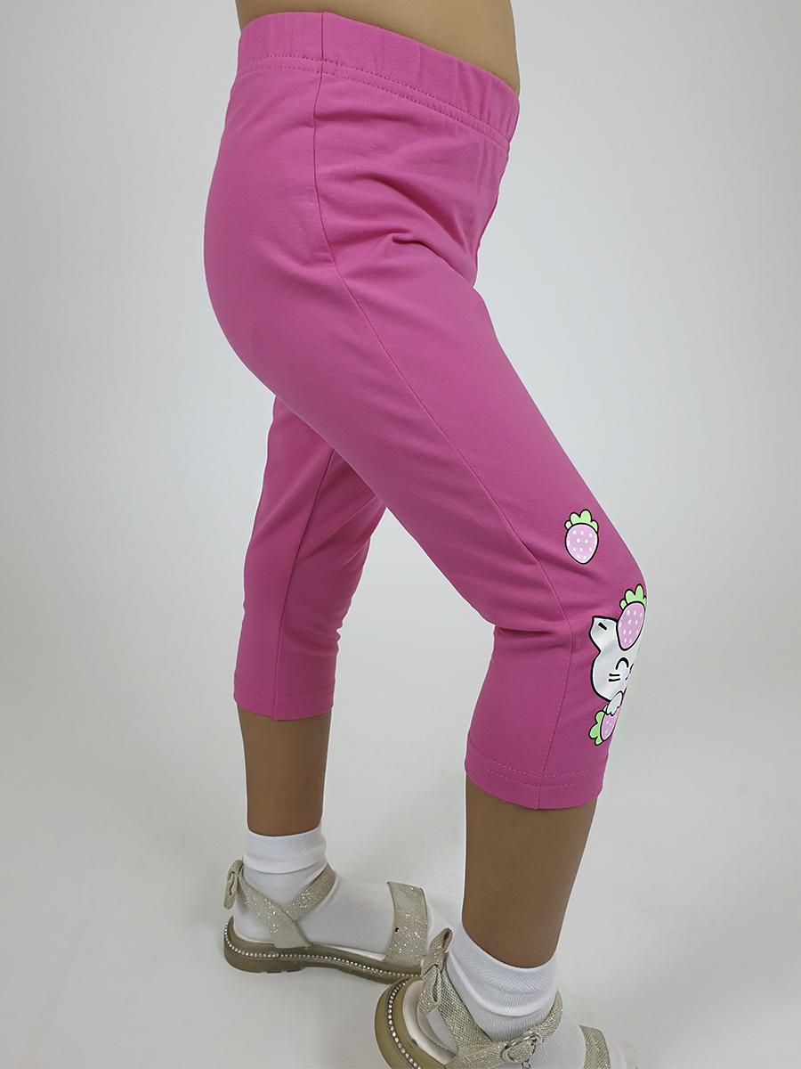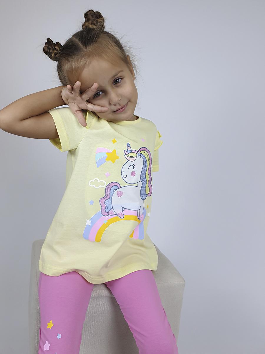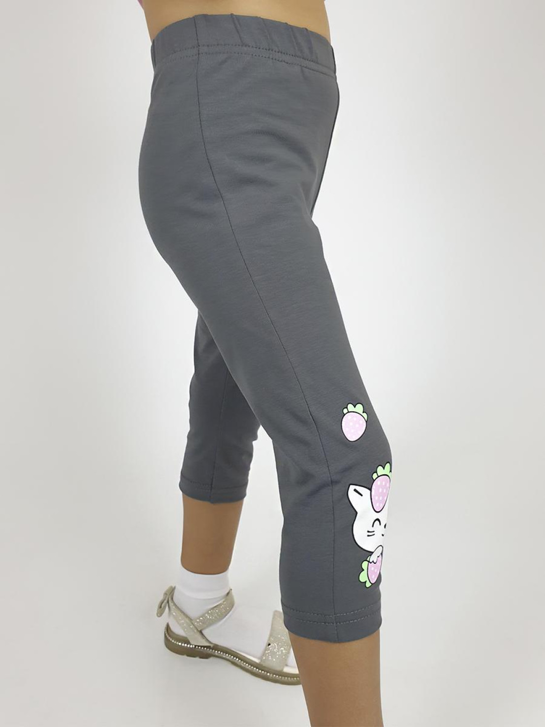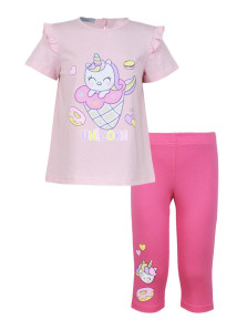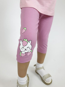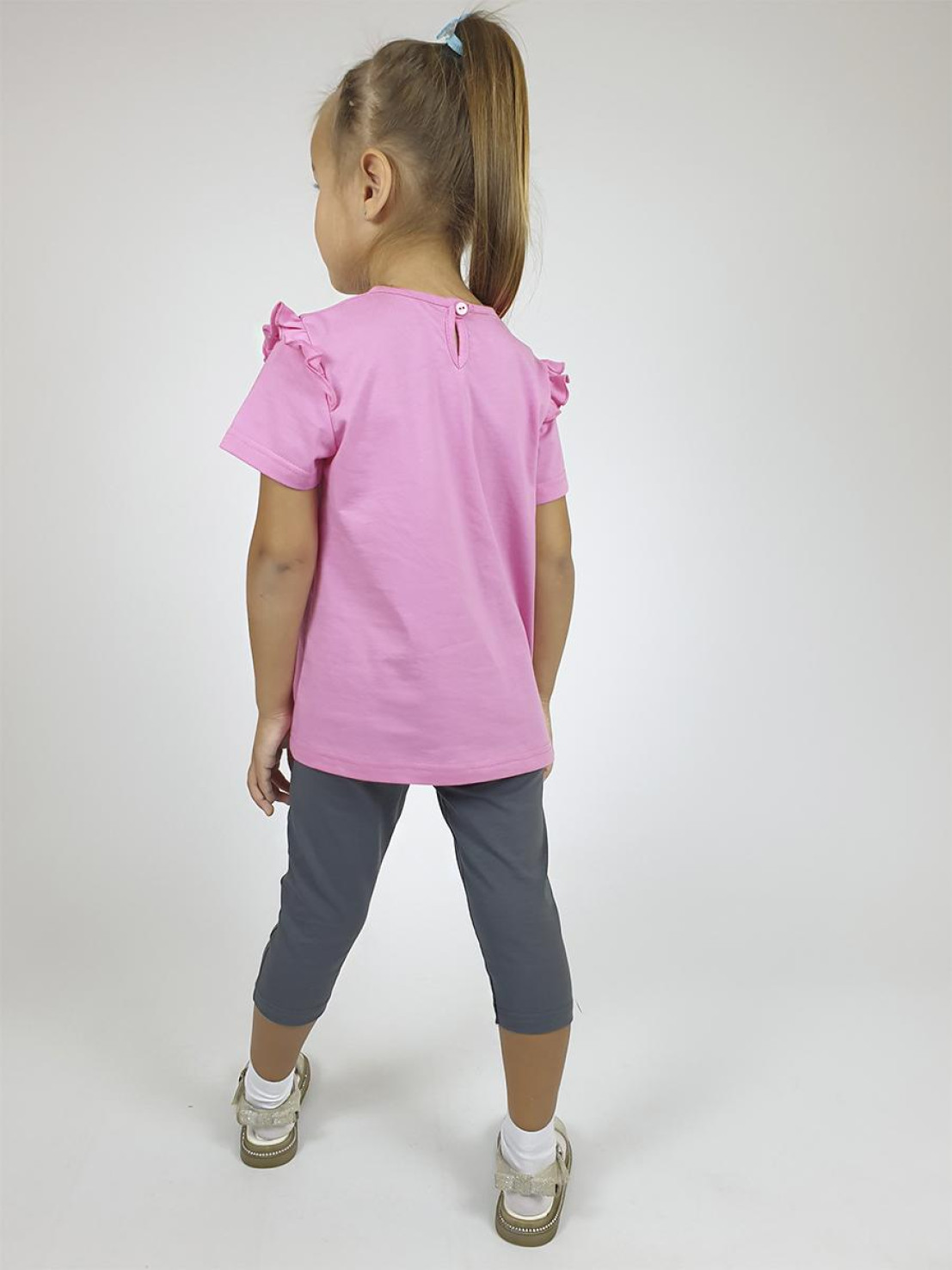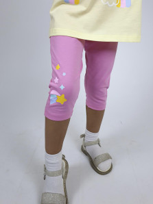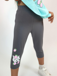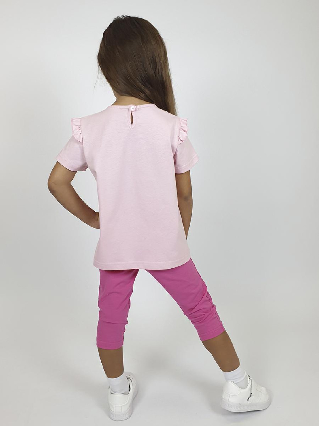 Кулирное полотно: Фуфайка- 100% х/б.,лосины-95% х/б,5% лайкра. Фуфайка-силуэт трапеция,короткий втачной рукав,в пройме рюша.Горловина окантована,застежка на пуговицу по спинке.Вышивка и печать на переде. Лосины-укороченные с печатью на правой стороне внизу,вверху на резинке.