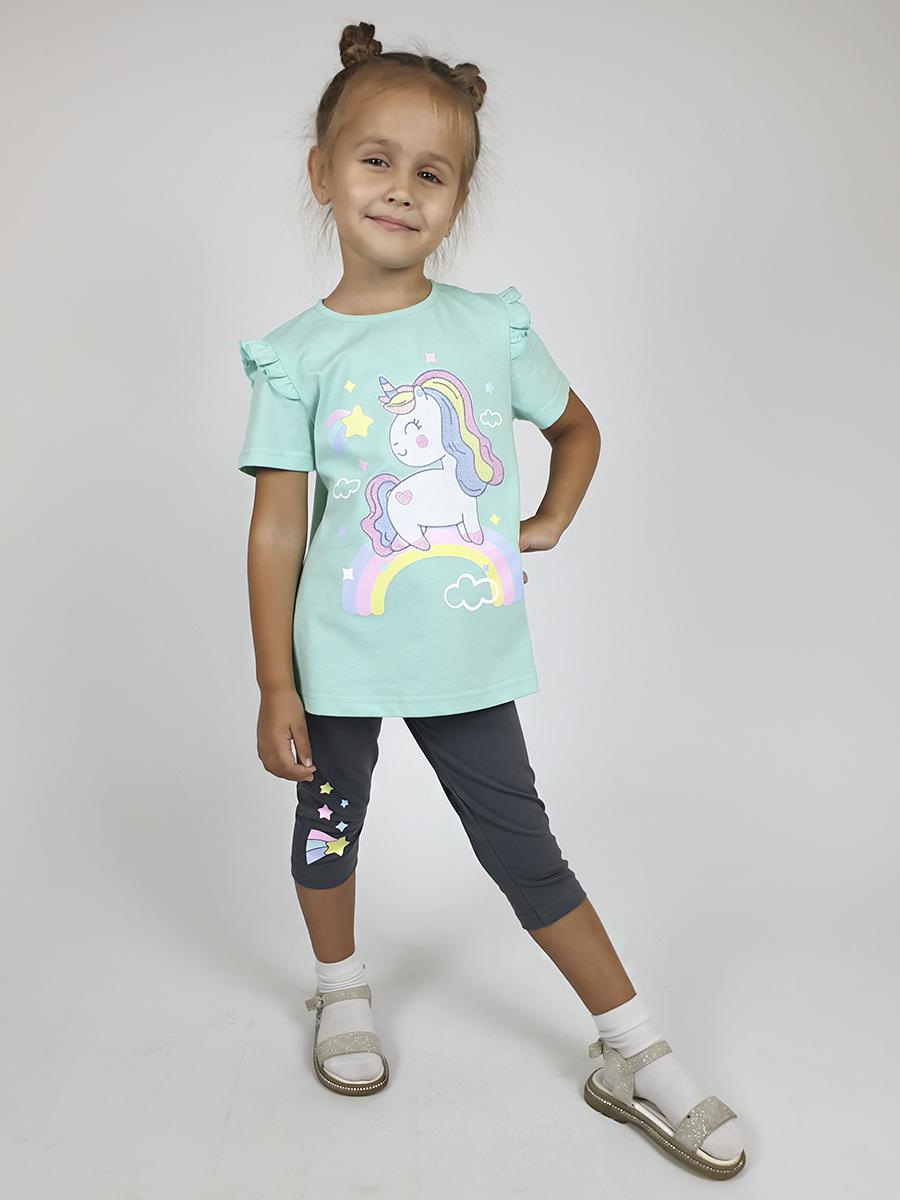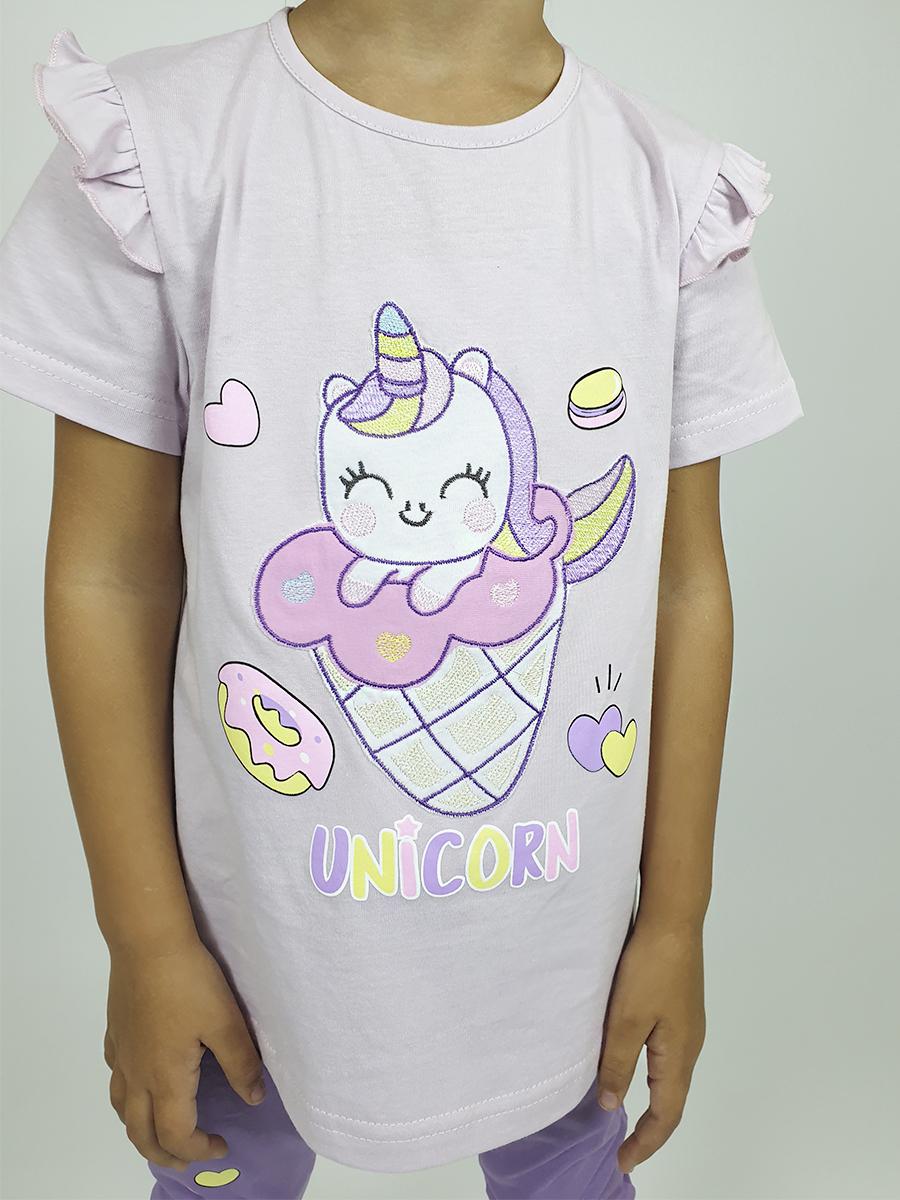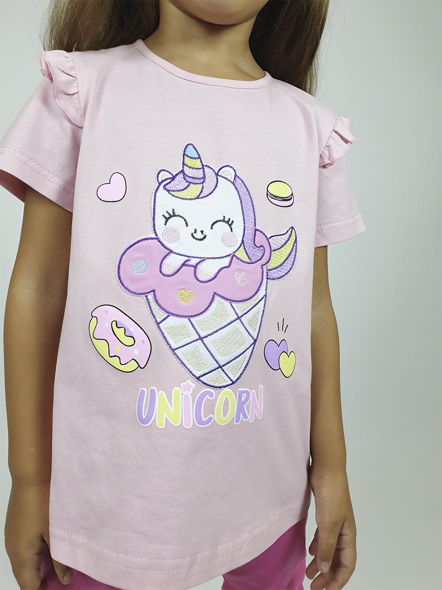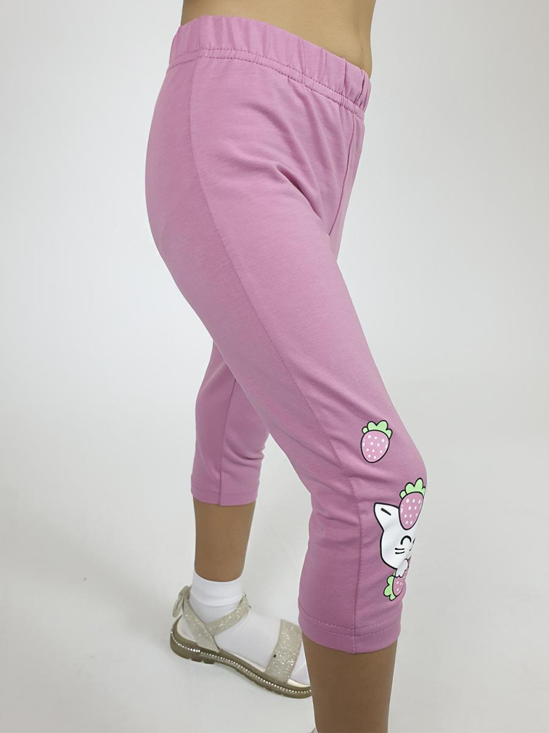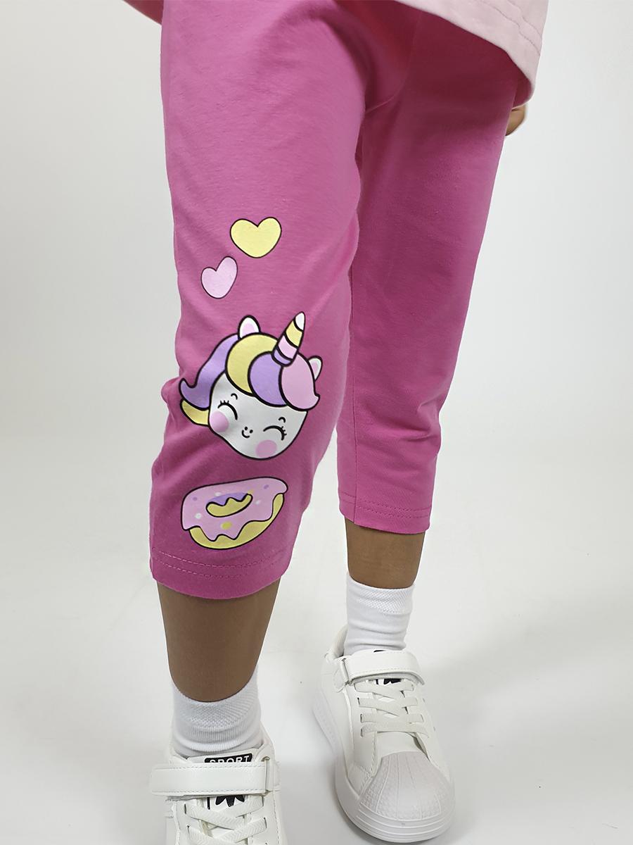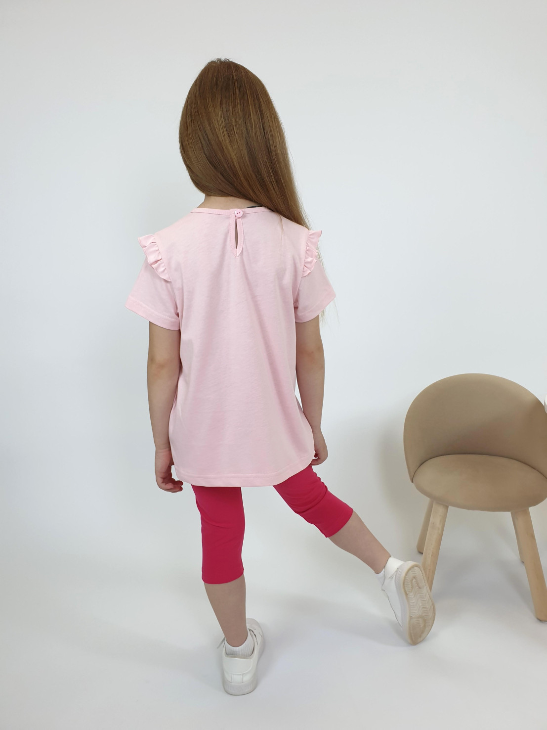 Кулирное полотно: Фуфайка- 100% х/б.,лосины-95% х/б,5% лайкра. Фуфайка-силуэт трапеция,короткий втачной рукав,в пройме рюша.Горловина окантована,застежка на пуговицу по спинке.Вышивка и печать на переде. Лосины-укороченные с печатью на правой стороне внизу,вверху на резинке.