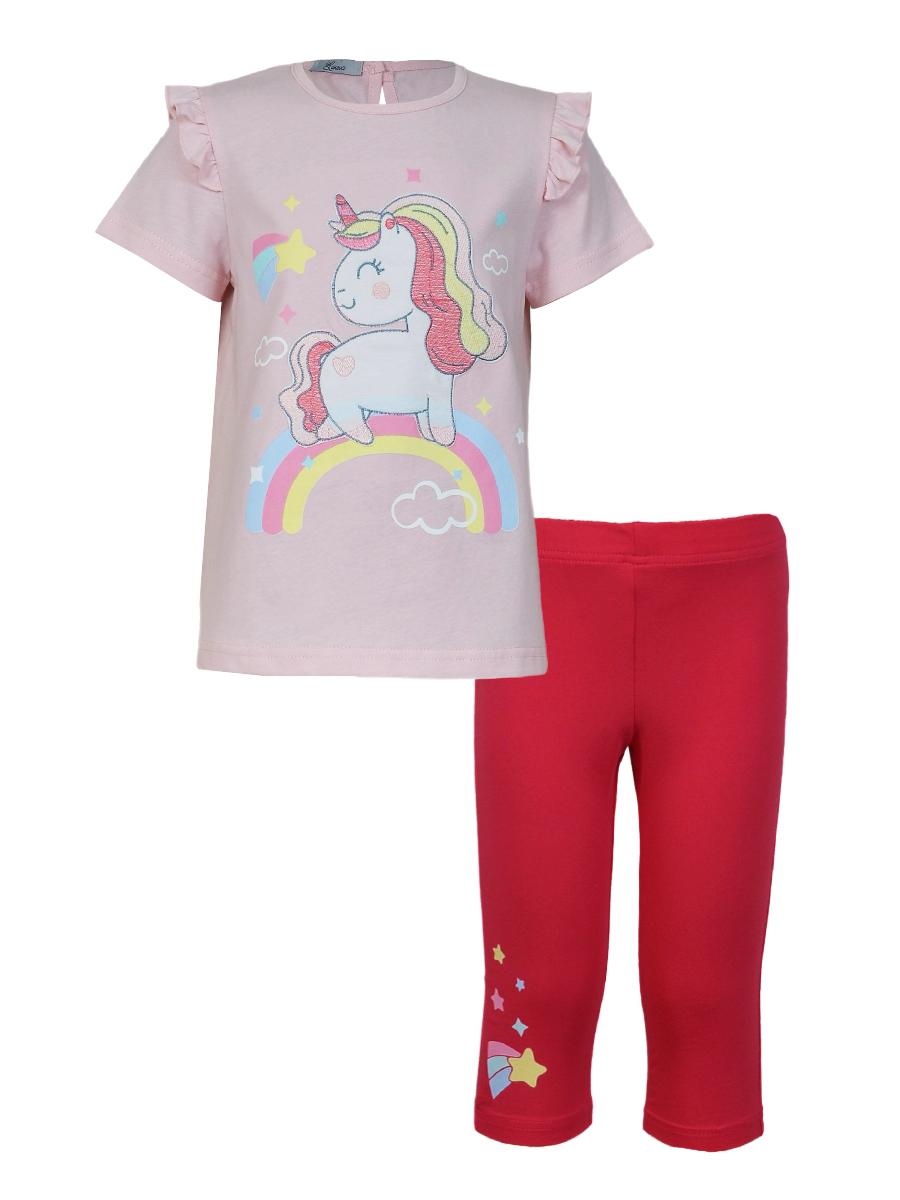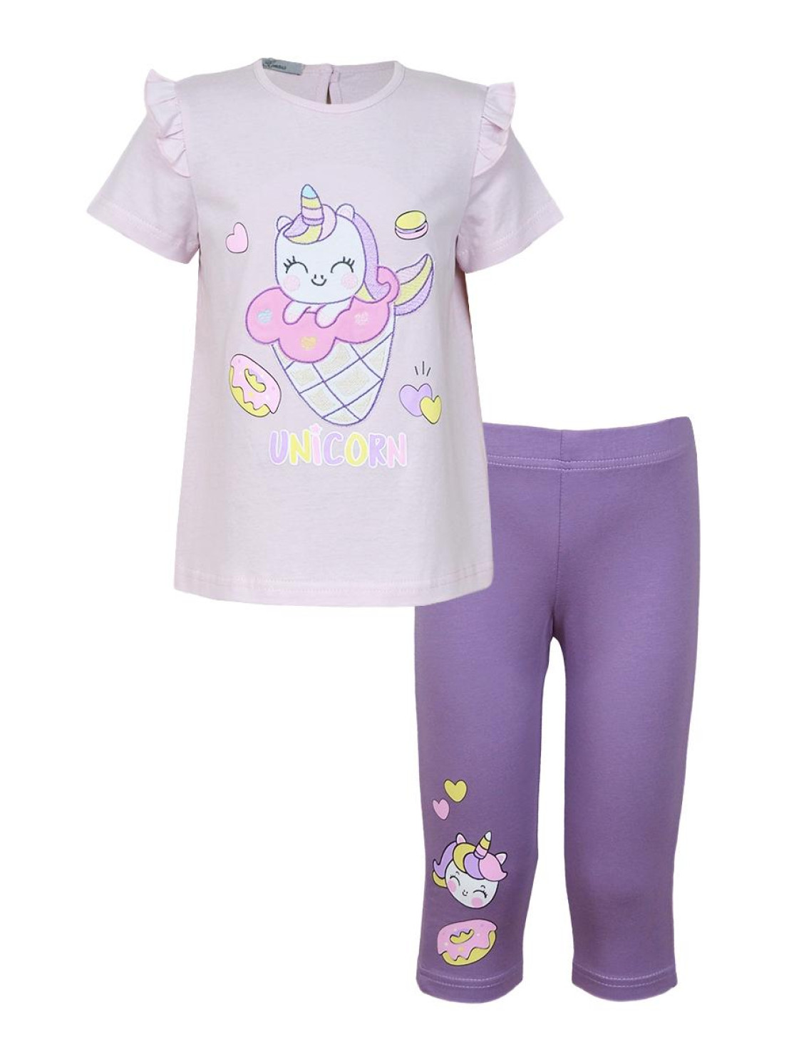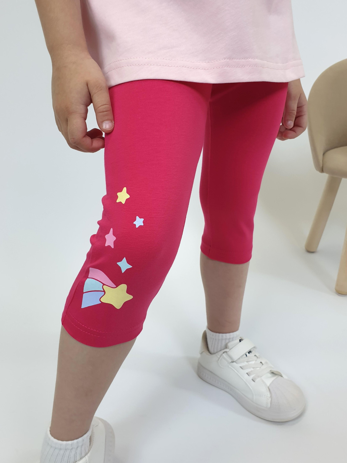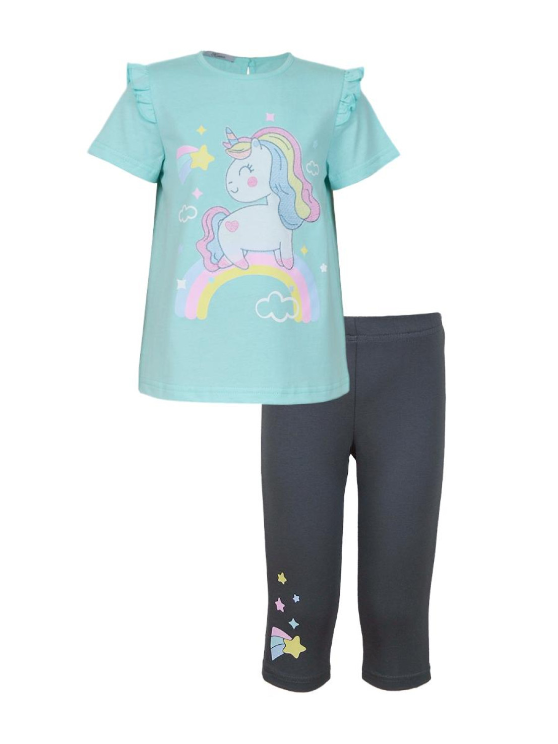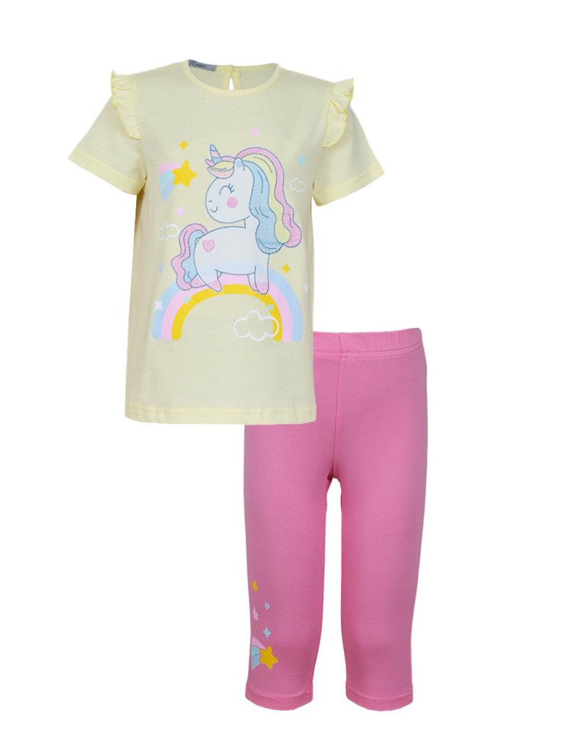 Кулирное полотно: Фуфайка- 100% х/б.,лосины-95% х/б,5% лайкра. Фуфайка-силуэт трапеция,короткий втачной рукав,в пройме рюша.Горловина окантована,застежка на пуговицу по спинке.Вышивка и печать на переде. Лосины-укороченные с печатью на правой стороне внизу,вверху на резинке.
