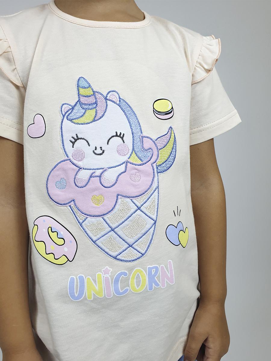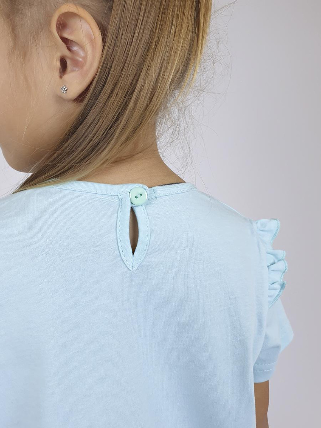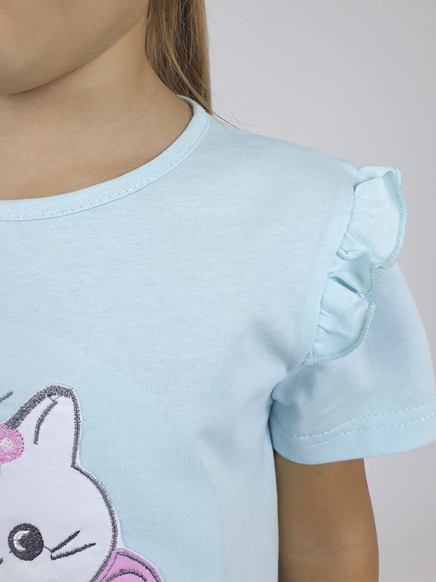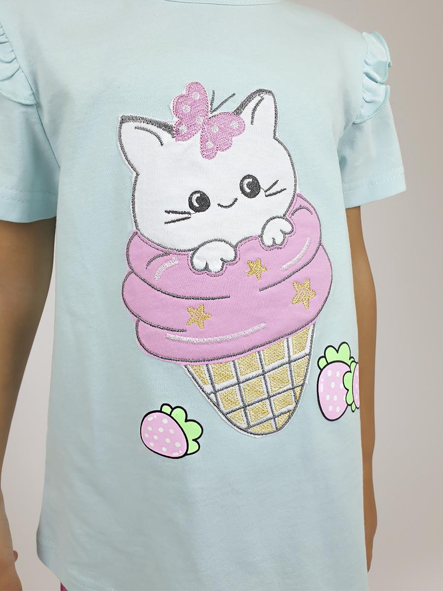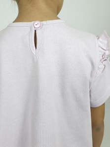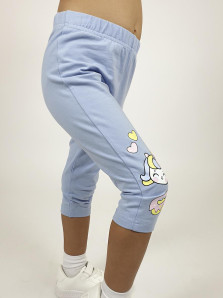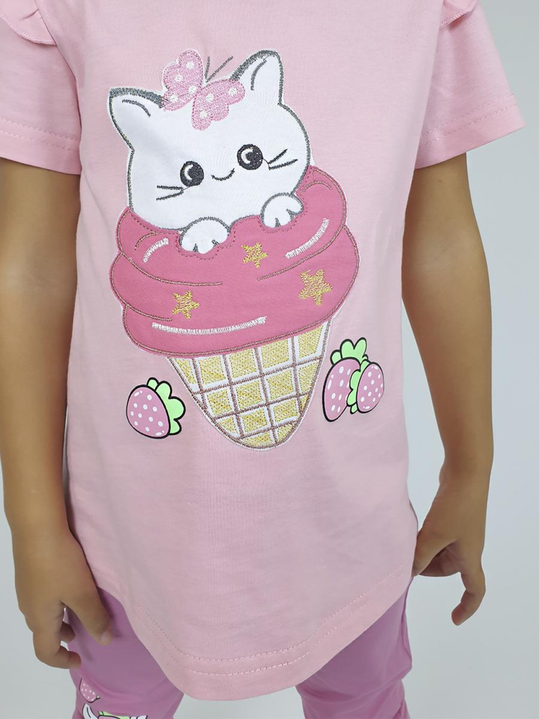 Кулирное полотно: Фуфайка- 100% х/б.,лосины-95% х/б,5% лайкра. Фуфайка-силуэт трапеция,короткий втачной рукав,в пройме рюша.Горловина окантована,застежка на пуговицу по спинке.Вышивка и печать на переде. Лосины-укороченные с печатью на правой стороне внизу,вверху на резинке.