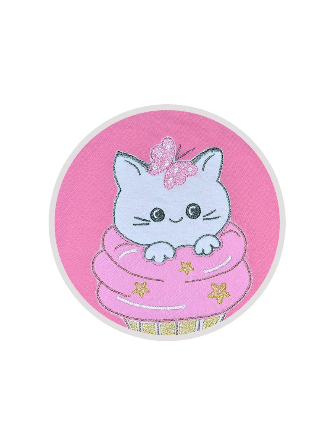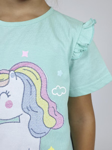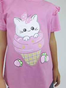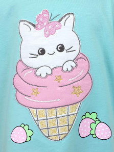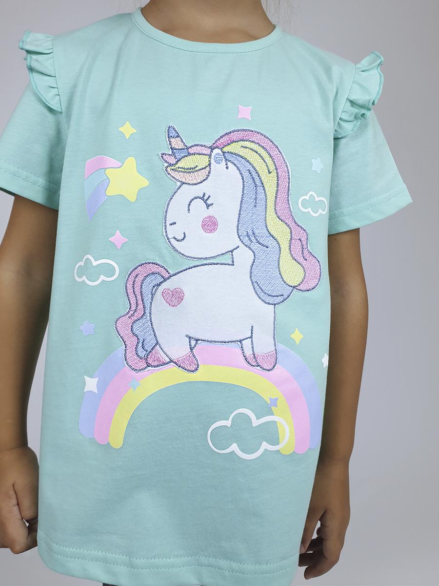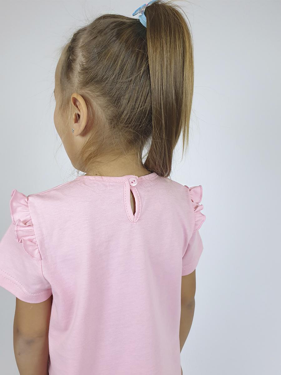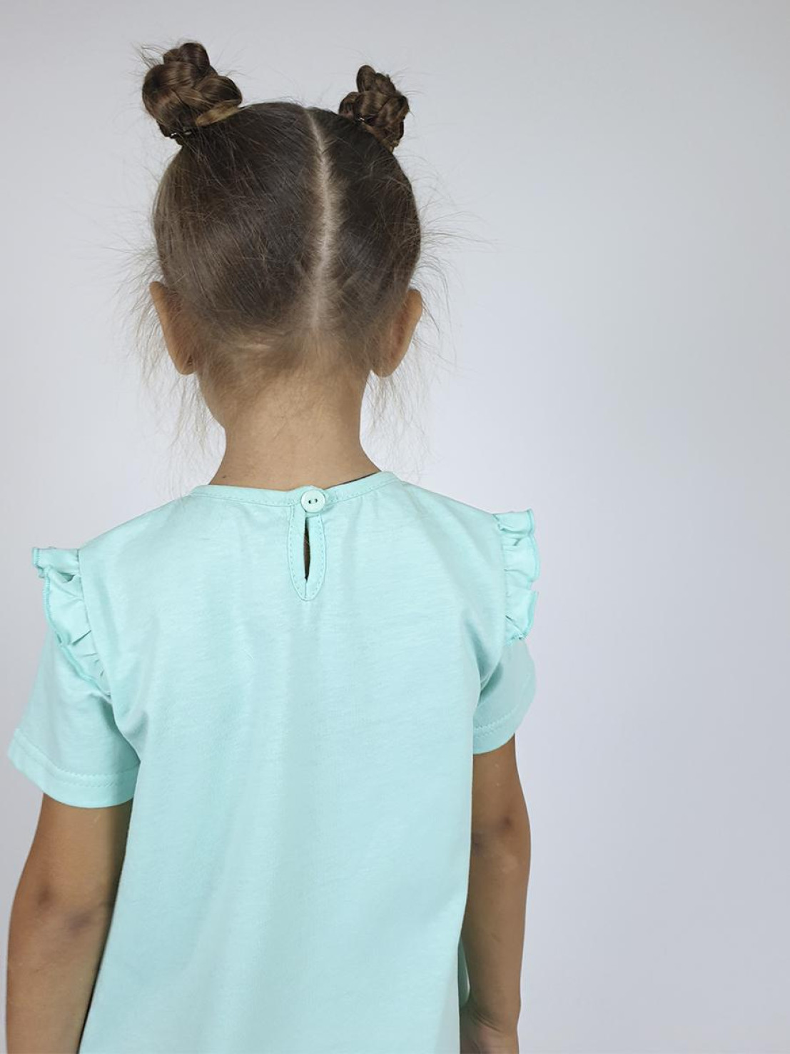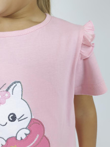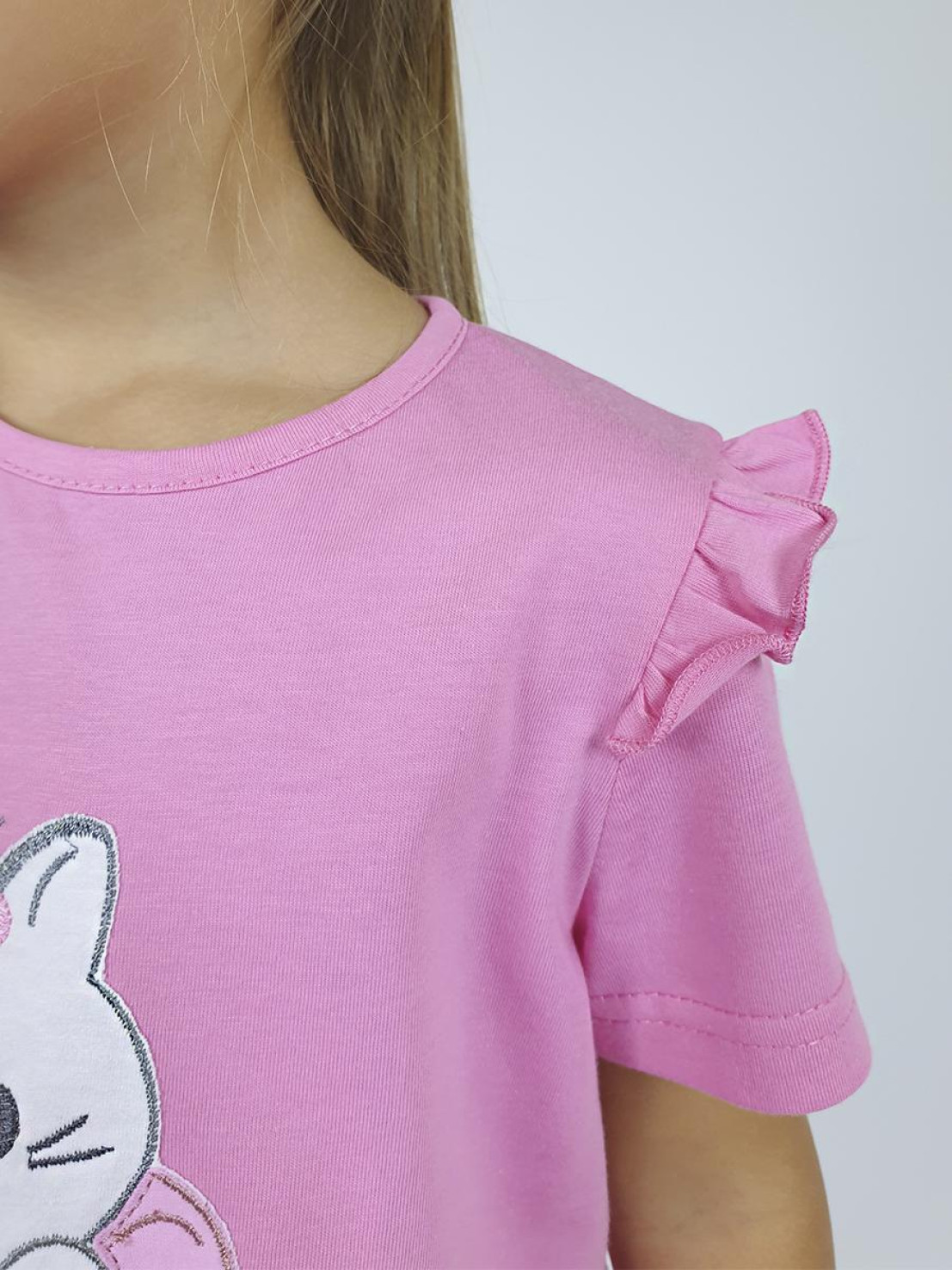 Кулирное полотно: Фуфайка- 100% х/б.,лосины-95% х/б,5% лайкра. Фуфайка-силуэт трапеция,короткий втачной рукав,в пройме рюша.Горловина окантована,застежка на пуговицу по спинке.Вышивка и печать на переде. Лосины-укороченные с печатью на правой стороне внизу,вверху на резинке.