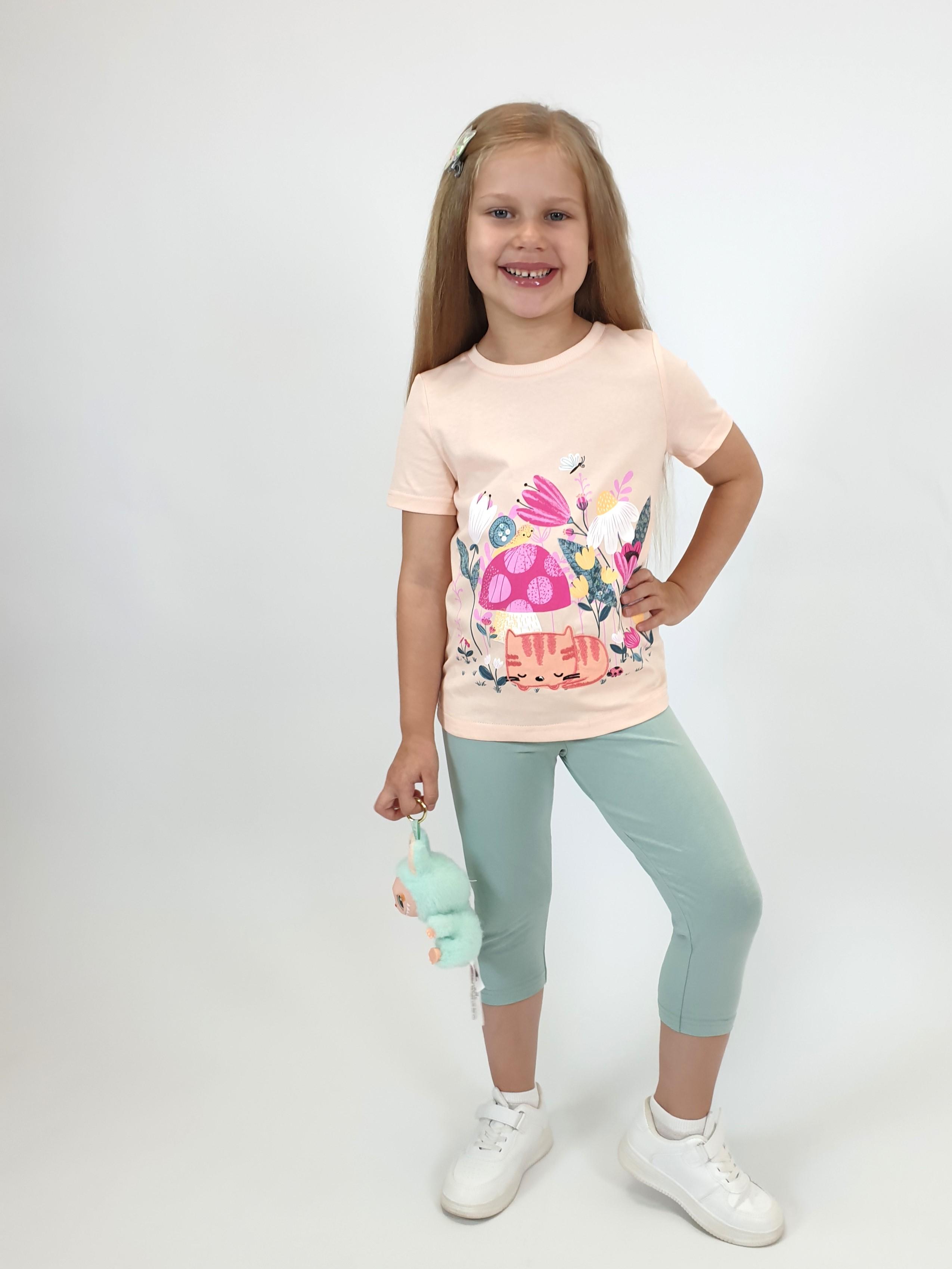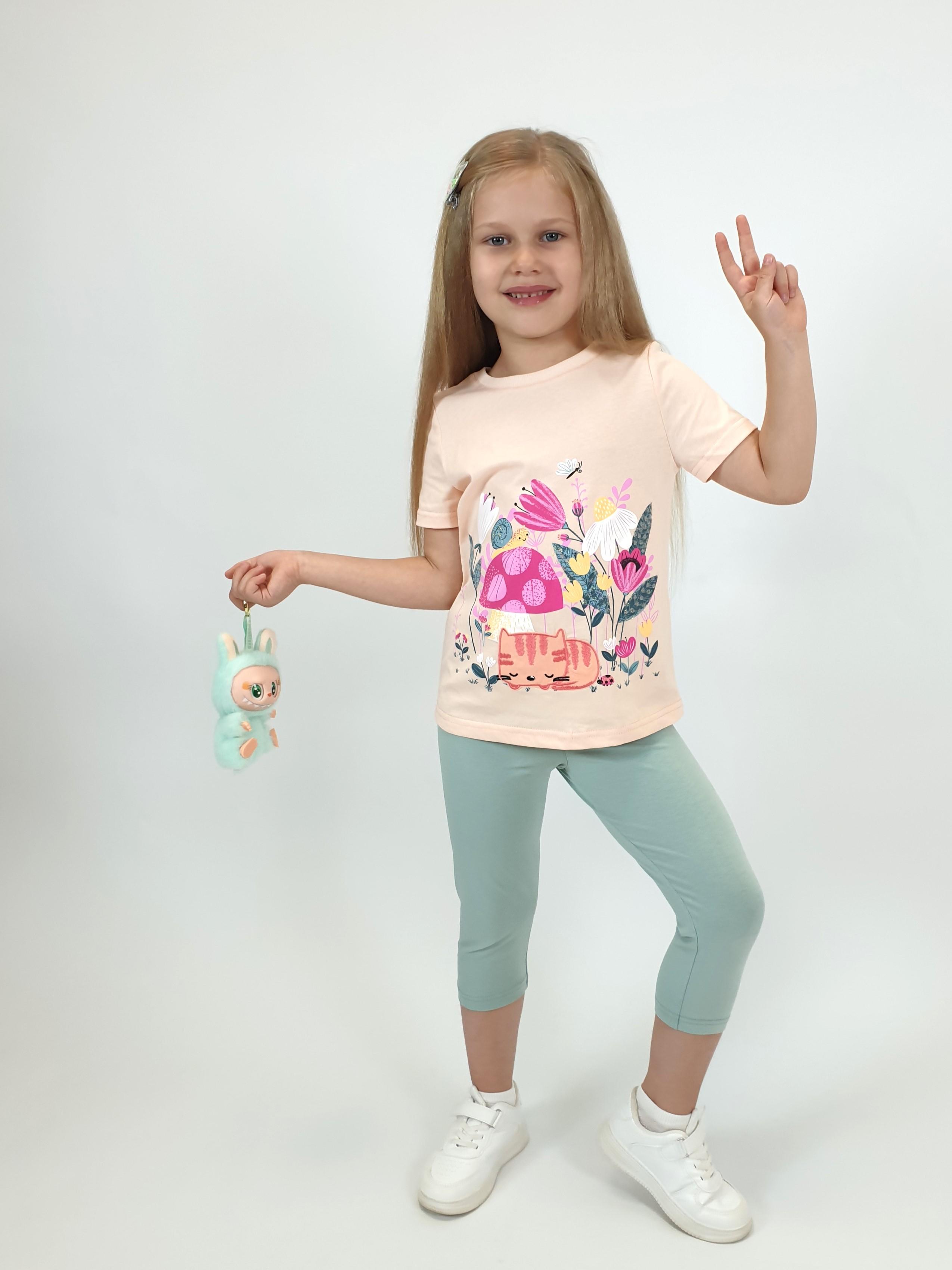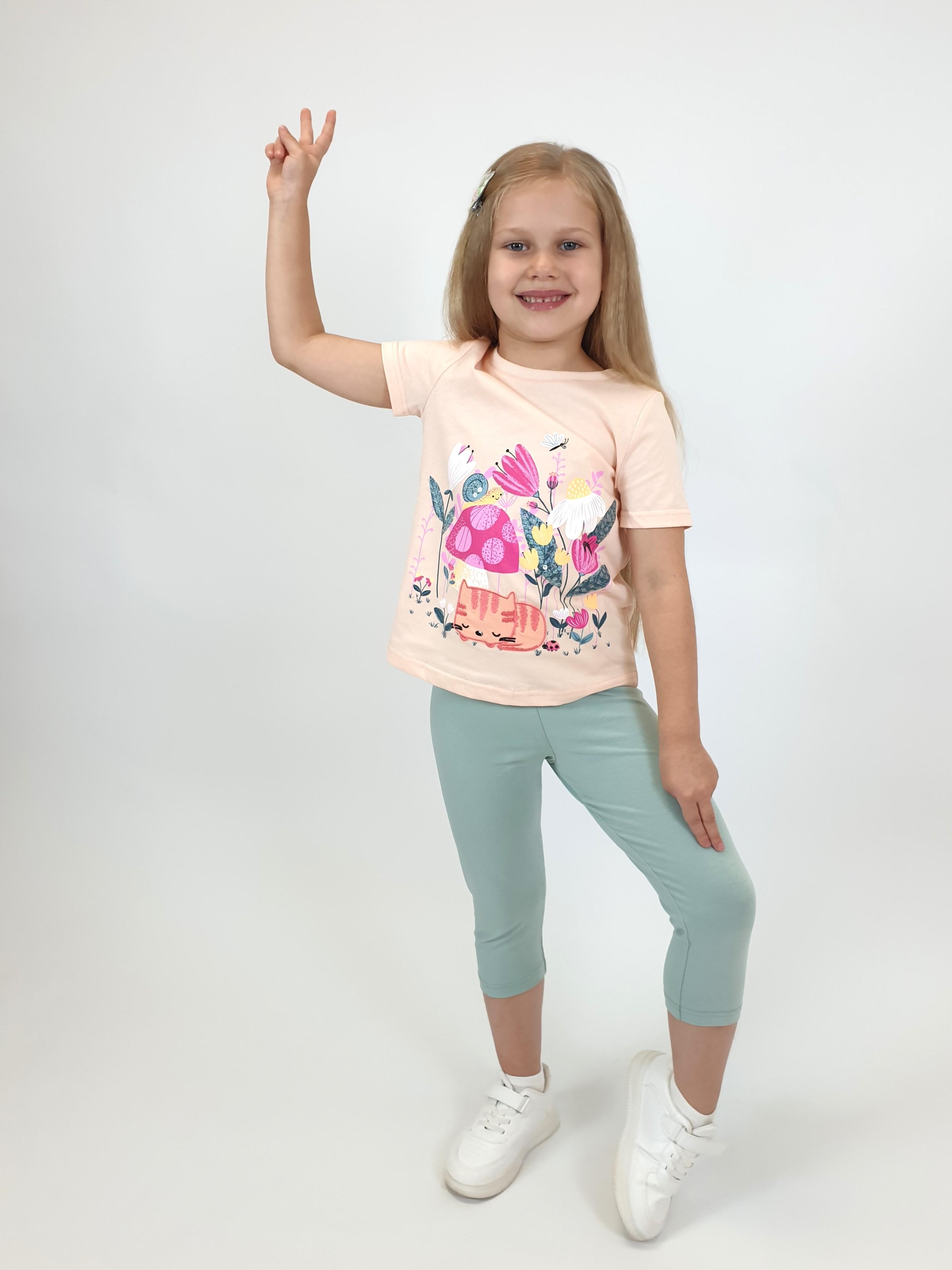 Кулирное полотно: Фуфайка- 100% х/б.,лосины-95% х/б,5% лайкра. Фуфайка-прямой силуэт,печать и вышивка на переде,короткий втачной рукав.Низ рукава и фуфайки подшит.Горловина обработана ластиком. Лосины-укороченные,вверху на резинке.