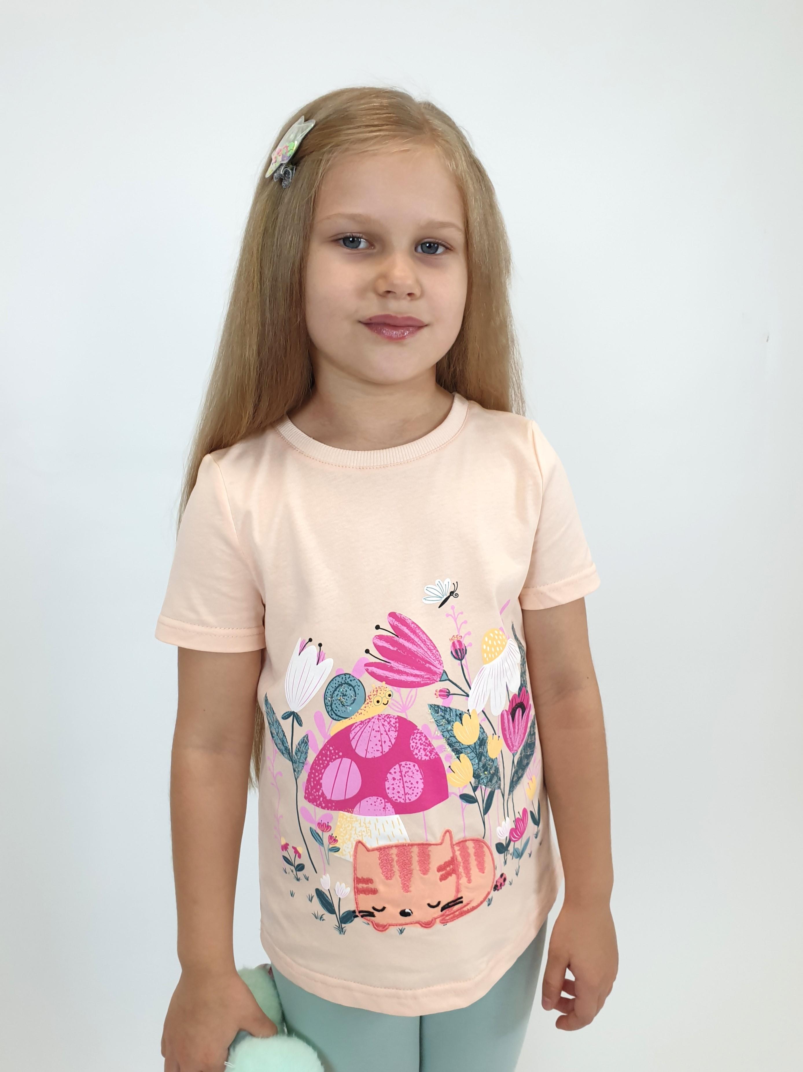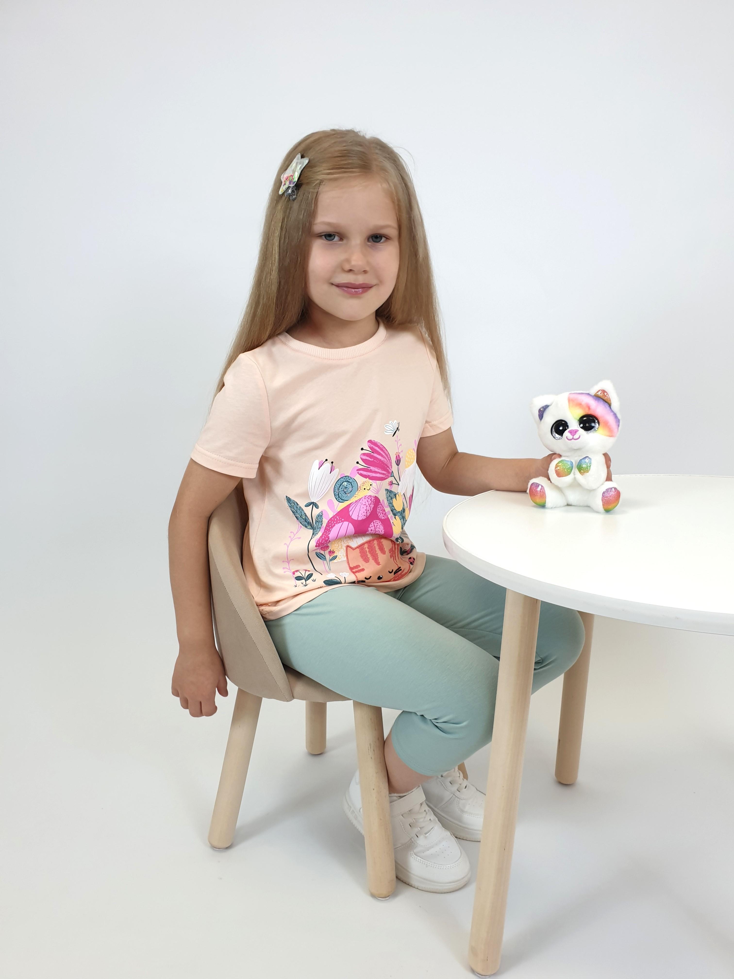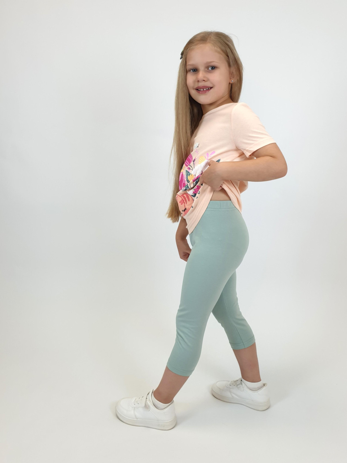 Кулирное полотно: Фуфайка- 100% х/б.,лосины-95% х/б,5% лайкра. Фуфайка-прямой силуэт,печать и вышивка на переде,короткий втачной рукав.Низ рукава и фуфайки подшит.Горловина обработана ластиком. Лосины-укороченные,вверху на резинке.